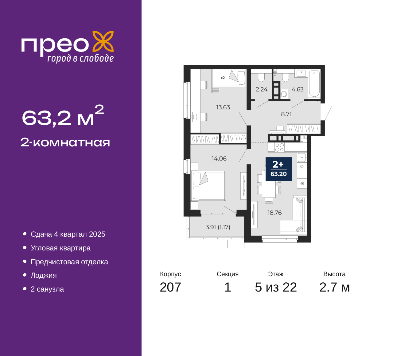 - Общая площадь 63.2 м²