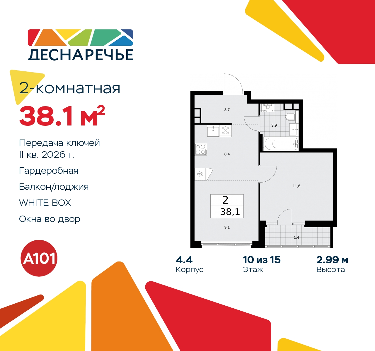 Продается двухкомнатная квартира с европланировкой и предчистовой отделкой в ЖК "Деснаречье" на 10 этаже. Общая площадь: 38.1 кв.м., жилая: 20.7 кв.м., общая площадь гостиной-столовой с кухонной зоной: 17.5 кв.м. Европейская планировка, за счет большой площади кухни-гостиной квартира выглядит просторной и очень удобна для жизни. Комнаты изолированные, все окна выходят на одну сторону. В квартире одна лоджия, один совмещенный санузел. Высота потолков 2.99 м. Эта квартира будет сдана с предчистовой отделкой white box – это квартира с ровными белыми стенами. Такая отделка позволяет сразу приступить к чистовой отделке: выбрать цвета и материалы для стен и полов, купить и расставить мебель и оборудование, развесить светильники и подобрать декор. При желании вы можете дозаказать дизайнерскую отделку от застройщика, на ваш выбор представлено несколько вариантов стилистических решений. Имеется ниша под гардероб. Дом монолитный, черырехподъездный, высотой 15 этажей. Квартира находится в 1-й секции в корпусе 4.4. На этаже 6 квартир. В подъезде 1 пассажирский и 1 грузовой лифт. Начало строительства - 3 квартал 2023 года. Окончание строительства - 2 квартал 2026 года. Оформление сделки по договору долевого участия. Артикул квартиры по базе застройщика 88К-4.4-774. ПРЕДЛОЖЕНИЯ ОТ ЗАСТРОЙЩИКА В ОКТЯБРЕ 2025: Ипотека от 13,9 % для всех! На весь срок. "Семейная ипотека" вернулась. Ставка от 3,5 % на весь срок! Без удорожания! Выгодное ипотечное комбо: Ипотека от 2200 р./мес. и от 6 % после рождения ребёнка! Ипотека для всех "Держи пять!" - ставка 5 % на 2 года! *более подробную информацию по скидкам и акциям уточняйте в отделе продаж Масштабный проект "Деснаречье" на юго-западе Москвы, который включает три новых района («квартала»), объединённые общей идеей – воплотить в реальность мечты современных жителей столицы об интересном, комфортном и разноплановом городском пространстве в окружении рек и лесов, словно сошедших с полотен русских живописцев: - «Берег» оценят все, кому близка водная стихия: плеск волн, солнечные блики и прогулки вдоль тихого течения речи. - «Лес» утопает в зелени парков и лесов. Здесь соблюдён идеальный баланс загородного спокойствия и столичного комфорта. - «Парк», самый энергичный и яркий, отличается высокой концентрацией пространств для спорта и творчества. Жилой комплекс "Деснаречье" расположится в 12 км от МКАД по современному Калужскому шоссе. Внешний облик зданий соответствует современному стилю и стандартам, характерным и для других популярных проектов ГК «А101»: сочетание контрастных тонов, большое количество остекления, в котором отражается небо, гармония с природным окружением. Весь город - в вашем районе. Находиться на территории «15-минутного города» значит иметь всё необходимое для полноценной жизни в шаговой доступности. Маршруты в районе «Деснаречье» выстроены так, чтобы добраться до магазинов, парков, школ, салонов услуг и других объектов можно было всего за несколько минут пешком или на велосипеде. Двор закрытый от машин – это тишина, комфорт и безопасность, поэтому все машино-места (включая «семейные» и увеличенные, с возможностью установки роллетных шкафов) находятся в подземном паркинге. В паркинги можно спуститься на лифте из любого подъезда или по лестнице. Рядом с «Деснаречьем» в 2027 году планируется открытие станции метро «Десна», до которой б