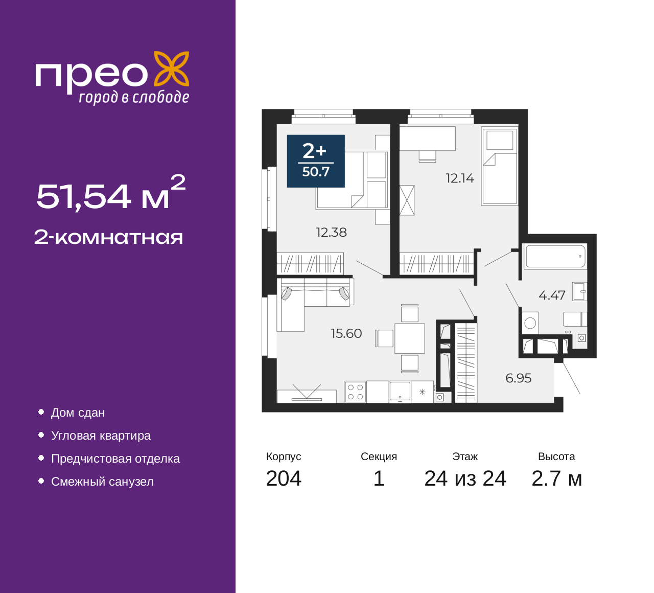 Просторная 2-комн. квартира с предчистовой отделкой в ЖК "Прео" на 24 этаже. Общая площадь: 51.54 кв.м., жилая: 24.52 кв.м., площадь просторной кухни-столовой: 15.6 кв.м. Угловая квартира, идеально подойдет любителям тишины и панорамных видов. В квартире один совмещенный санузел. Высота потолков 2.7 м. Квартира находится в корпусе 204. Дом монолитный, одноподъездный, высотой 24 этажа. На этаже 14 квартир. В подъезде 2 грузовых лифта. На сегодняшний день строительство окончено, дом сдан в 4 квартале 2024 года. Оформление сделки по договору купли-продажи. Преображенский — один из самых привлекательных районов для жизни! Это полностью самостоятельный жилой район с точки зрения инфраструктуры. Преображенский находится между Московским и Червишевским трактами в квартале улиц Закалужская — Вьюжная — Александра Протозанова. Не нужно ждать, когда появится инфраструктура — переезжайте на всё готовое. Вблизи расположены действующие школа и детский сад. В этом году откроется еще один сад, а в следующем году — школа. По соседству с Преображенским запланировано строительство городского парка «Комарово» площадью 38 гектар. За 10 минут можно доехать на автомобиле до крупных ТРЦ: «Лента», «Кристалл», «Леруа Мерлен», «Метро» и «Ашан». С 2018 года в районе открыт Соседский центр — пространство, созданное для формирования добрососедской среды, совместного досуга, общения и реализации соседских инициатив. Здесь проходят встречи соседей, а также сами жители района организовывают мероприятия. Организатором такого события может стать любой желающий. В квартирах выполнена качественная предчистовая отделка. Гладкие стены с финишным выравниванием по маякам. Ровный потолок для установки натяжного потолка. Установлены пятикамерные окна с двойным стеклопакетом (3 стекла). Дизайнерские холлы с видеонаблюдением, безбарьерным и прозрачным входом – всегда светло и спокойно. На первом этаже есть просторные колясочные, где все жители могут оставлять свои коляски и велосипеды. В Преображенском есть всё, что нужно для активного отдыха и занятий спортом. Мы сделали большое футбольное поле с безопасным покрытием. Также установили хоккейный корт, который оборудован по всем необходимым стандартам. Во дворах можно делать упражнения на специальных площадках с турниками. Весь район мы обустроили велодорожками, которые связаны в единый маршрут. У нас есть сухие фонтаны, бьющие из земли, деревья, веревки, сетки, скалодром, газон, песок и резинка — осталось просто дать своему ребенку право на свободную игру. По-настоящему хорошие дворы — это те, которые дети предпочитают соцсетям и телевизору. Аккредитация в банках: ПАО «Банк Уралсиб», ПАО «Газпромбанк», ПАО Банк «ВТБ», «Сбербанк России», ОАО «Альфа-Банк» и других. (AQID02278542)