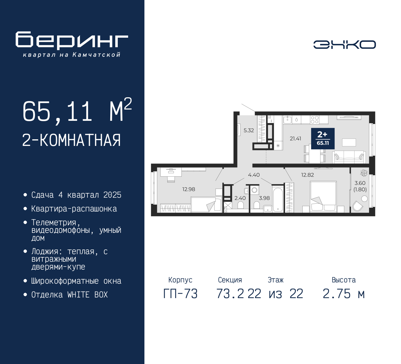 Просторная двухкомнатная квартира в ЖК "Беринг" на 22 этаже. Квартира без отделки, после выдачи ключей можно делать ремонт. Общая площадь: 65.11 кв.м., жилая: 25.8 кв.м., площадь просторной кухни-столовой: 21.41 кв.м. Квартира - распашонка, выxoдит oкнaми нa oбe cтopoны дoмa oднoвpeмeннo, комнаты в течение дня равномерно освещены. В квартире одна лоджия, один совмещенный и один раздельный санузел. Высота потолков 2.75 м. Дом монолитный, многоподъездный, переменной этажности, от 9 до 22 этажей. Квартира находится в 73.2-й секции высотой 22 этажа в корпусе ГП-73. На этаже 7 квартир. В подъезде 1 пассажирский и 1 грузовой лифт. Окончание строительства - 4 квартал 2025 года. Оформление сделки по договору долевого участия. Подобно знаменитому исследователю, мы чувствуем себя первооткрывателями этой локации. Хотим показать новую суть места, сформировать для вас жизненный опыт, которого ещё не было. Беринг — район зелёного цвета. Беринг — район, который откроется вам с другой стороны. Впечатлит новым уровнем комфорта и качеством жизни. Беринг — открытие на карте города. Первый квартал расположен в районе Тура, в границах улиц: Камчатская – Западносибирская – Энтузиастов. Вокруг уже есть всё для того, чтобы ежедневная рутина была лишь частью жизни и не доставляла дискомфорта. Школы и детские сады, магазины и аптеки, поликлиника, места для семейного отдыха, пеших и велопрогулок, и даже рыбалки. Масштабное озеленение дворов — визитная карточка ЭНКО и ваш оазис спокойствия, чтобы отвлечься от повседневности. Раскидистые деревья, кустарники, травы и цветы — осталось остановиться, вдохнуть и расслабиться, глядя на эту природную красоту. Стилистика подъездов продолжает концепцию Беринга, вдохновлённого Камчаткой: сдержанный, но при этом впечатляющий дизайн соседствует с удобством и функциональностью. (AQID02316168)