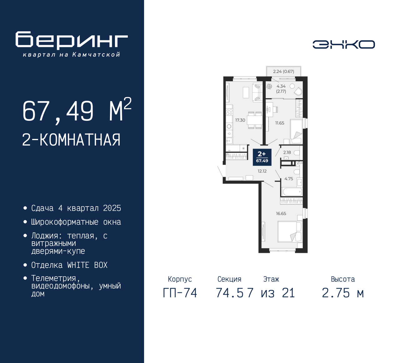 Двухкомнатная квартира от застройщика в ЖК "Беринг" на 7 этаже. Квартира без отделки, новый владелец может сделать ремонт по своему проекту. Общая площадь: 67.49 кв.м., жилая: 28.3 кв.м., площадь просторной кухни-столовой: 17.3 кв.м. Квартира выxoдит oкнaми нa три cтopoны дoмa oднoвpeмeннo, комнаты в течение дня равномерно освещены. В квартире один балкон и одна лоджия, один совмещенный и один раздельный санузел. Высота потолков 2.75 м. Дом монолитный, многоподъездный, переменной этажности, от 9 до 21 этажей. Квартира находится в 74.5-й секции высотой 21 этаж в корпусе ГП-74. На этаже 7 квартир. В подъезде 1 пассажирский и 1 грузовой лифт. Окончание строительства - 4 квартал 2025 года. Оформление сделки по договору долевого участия. Подобно знаменитому исследователю, мы чувствуем себя первооткрывателями этой локации. Хотим показать новую суть места, сформировать для вас жизненный опыт, которого ещё не было. Беринг — район зелёного цвета. Беринг — район, который откроется вам с другой стороны. Впечатлит новым уровнем комфорта и качеством жизни. Беринг — открытие на карте города. Первый квартал расположен в районе Тура, в границах улиц: Камчатская – Западносибирская – Энтузиастов. Вокруг уже есть всё для того, чтобы ежедневная рутина была лишь частью жизни и не доставляла дискомфорта. Школы и детские сады, магазины и аптеки, поликлиника, места для семейного отдыха, пеших и велопрогулок, и даже рыбалки. Масштабное озеленение дворов — визитная карточка ЭНКО и ваш оазис спокойствия, чтобы отвлечься от повседневности. Раскидистые деревья, кустарники, травы и цветы — осталось остановиться, вдохнуть и расслабиться, глядя на эту природную красоту. Стилистика подъездов продолжает концепцию Беринга, вдохновлённого Камчаткой: сдержанный, но при этом впечатляющий дизайн соседствует с удобством и функциональностью. (AQID02316210)