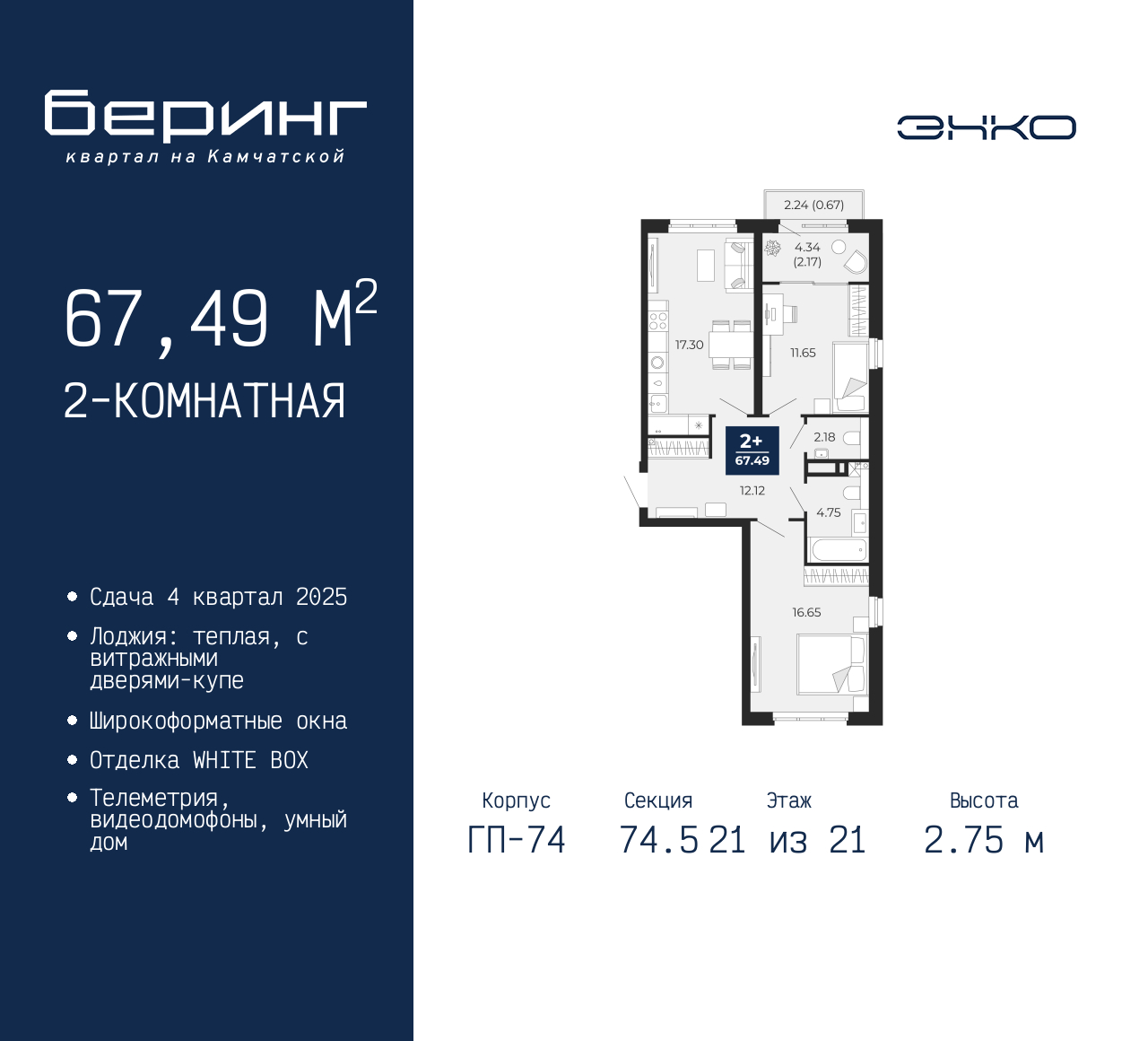 Продается 2-комн. квартира в ЖК "Беринг" на 21 этаже. Квартира без отделки, новый собственник может сделать ремонт по своему дизайн-проекту. Общая площадь: 67.49 кв.м., жилая: 28.3 кв.м., площадь просторной кухни-столовой: 17.3 кв.м. Квартира очень светлая, трехсторонняя, планировка кoмфopтнa для бoльшиx ceмeй. В квартире один балкон и одна лоджия, один совмещенный и один раздельный санузел. Высота потолков 2.75 м. Дом монолитный, многоподъездный, переменной этажности, от 9 до 21 этажей. Квартира находится в 74.5-й секции высотой 21 этаж в корпусе ГП-74. На этаже 7 квартир. В подъезде 1 пассажирский и 1 грузовой лифт. Окончание строительства - 4 квартал 2025 года. Оформление сделки по договору долевого участия. Подобно знаменитому исследователю, мы чувствуем себя первооткрывателями этой локации. Хотим показать новую суть места, сформировать для вас жизненный опыт, которого ещё не было. Беринг — район зелёного цвета. Беринг — район, который откроется вам с другой стороны. Впечатлит новым уровнем комфорта и качеством жизни. Беринг — открытие на карте города. Первый квартал расположен в районе Тура, в границах улиц: Камчатская – Западносибирская – Энтузиастов. Вокруг уже есть всё для того, чтобы ежедневная рутина была лишь частью жизни и не доставляла дискомфорта. Школы и детские сады, магазины и аптеки, поликлиника, места для семейного отдыха, пеших и велопрогулок, и даже рыбалки. Масштабное озеленение дворов — визитная карточка ЭНКО и ваш оазис спокойствия, чтобы отвлечься от повседневности. Раскидистые деревья, кустарники, травы и цветы — осталось остановиться, вдохнуть и расслабиться, глядя на эту природную красоту. Стилистика подъездов продолжает концепцию Беринга, вдохновлённого Камчаткой: сдержанный, но при этом впечатляющий дизайн соседствует с удобством и функциональностью. (AQID02316265)