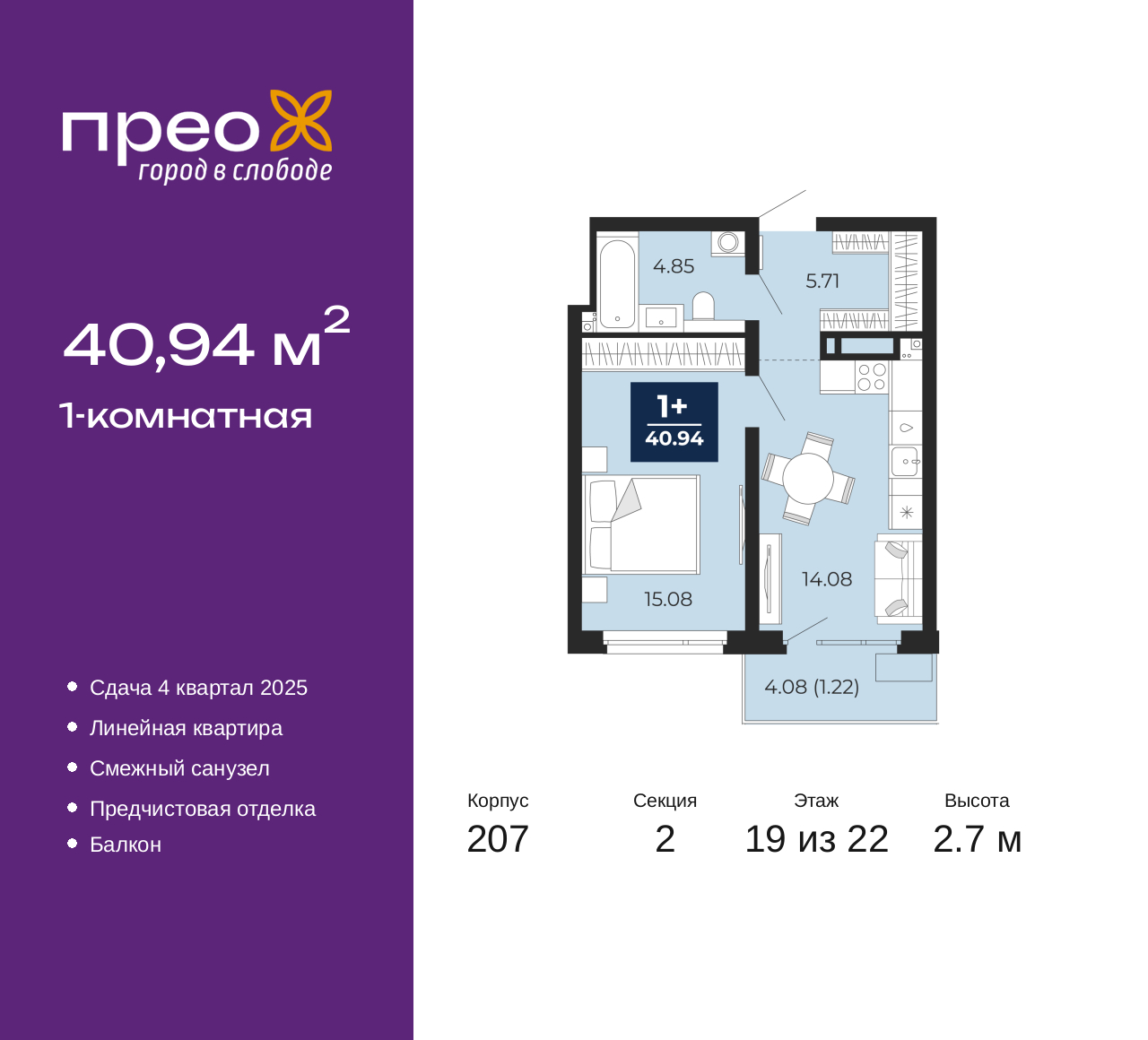 Просторная 1-комн. квартира с предчистовой отделкой в ЖК "Прео" на 19 этаже. Общая площадь: 40.94 кв.м., жилая: 15.08 кв.м., площадь просторной кухни-столовой: 14.08 кв.м. Все окна выходят на одну сторону. В квартире один балкон, один совмещенный санузел. Высота потолков 2.7 м. Дом монолитный, двухподъездный, высотой 22 этажа. Квартира находится во 2-й секции в корпусе 207. На этаже 8 квартир. В подъезде 1 пассажирский и 1 грузовой лифт. Окончание строительства - 4 квартал 2025 года. Оформление сделки по договору долевого участия. Преображенский — один из самых привлекательных районов для жизни! Это полностью самостоятельный жилой район с точки зрения инфраструктуры. Преображенский находится между Московским и Червишевским трактами в квартале улиц Закалужская — Вьюжная — Александра Протозанова. Не нужно ждать, когда появится инфраструктура — переезжайте на всё готовое. Вблизи расположены действующие школа и детский сад. В этом году откроется еще один сад, а в следующем году — школа. По соседству с Преображенским запланировано строительство городского парка «Комарово» площадью 38 гектар. За 10 минут можно доехать на автомобиле до крупных ТРЦ: «Лента», «Кристалл», «Леруа Мерлен», «Метро» и «Ашан». С 2018 года в районе открыт Соседский центр — пространство, созданное для формирования добрососедской среды, совместного досуга, общения и реализации соседских инициатив. Здесь проходят встречи соседей, а также сами жители района организовывают мероприятия. Организатором такого события может стать любой желающий. В квартирах выполнена качественная предчистовая отделка. Гладкие стены с финишным выравниванием по маякам. Ровный потолок для установки натяжного потолка. Установлены пятикамерные окна с двойным стеклопакетом (3 стекла). Дизайнерские холлы с видеонаблюдением, безбарьерным и прозрачным входом – всегда светло и спокойно. На первом этаже есть просторные колясочные, где все жители могут оставлять свои коляски и велосипеды. В Преображенском есть всё, что нужно для активного отдыха и занятий спортом. Мы сделали большое футбольное поле с безопасным покрытием. Также установили хоккейный корт, который оборудован по всем необходимым стандартам. Во дворах можно делать упражнения на специальных площадках с турниками. Весь район мы обустроили велодорожками, которые связаны в единый маршрут. У нас есть сухие фонтаны, бьющие из земли, деревья, веревки, сетки, скалодром, газон, песок и резинка — осталось просто дать своему ребенку право на свободную игру. По-настоящему хорошие дворы — это те, которые дети предпочитают соцсетям и телевизору. Аккредитация в банках: ПАО «Газпромбанк», ПАО Банк «ВТБ», ПАО «Банк Уралсиб», ОАО «Альфа-Банк», «Сбербанк России» и других. (AQID02355402)