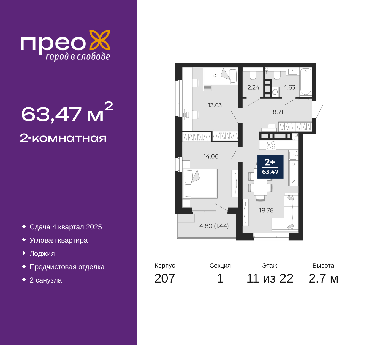 Просторная двухкомнатная квартира с предчистовой отделкой в ЖК "Прео" на 11 этаже. Общая площадь: 63.47 кв.м., жилая: 27.69 кв.м., площадь просторной кухни-столовой: 18.76 кв.м. Квартира угловая, идеально подойдет любителям тишины и панорамных видов. В квартире одна лоджия, один совмещенный и один раздельный санузел. Высота потолков 2.7 м. Дом монолитный, двухподъездный, высотой 22 этажа. Квартира находится в 1-й секции в корпусе 207. На этаже 8 квартир. В подъезде 1 пассажирский и 1 грузовой лифт. Окончание строительства - 4 квартал 2025 года. Оформление сделки по договору долевого участия. Преображенский — один из самых привлекательных районов для жизни! Это полностью самостоятельный жилой район с точки зрения инфраструктуры. Преображенский находится между Московским и Червишевским трактами в квартале улиц Закалужская — Вьюжная — Александра Протозанова. Не нужно ждать, когда появится инфраструктура — переезжайте на всё готовое. Вблизи расположены действующие школа и детский сад. В этом году откроется еще один сад, а в следующем году — школа. По соседству с Преображенским запланировано строительство городского парка «Комарово» площадью 38 гектар. За 10 минут можно доехать на автомобиле до крупных ТРЦ: «Лента», «Кристалл», «Леруа Мерлен», «Метро» и «Ашан». С 2018 года в районе открыт Соседский центр — пространство, созданное для формирования добрососедской среды, совместного досуга, общения и реализации соседских инициатив. Здесь проходят встречи соседей, а также сами жители района организовывают мероприятия. Организатором такого события может стать любой желающий. В квартирах выполнена качественная предчистовая отделка. Гладкие стены с финишным выравниванием по маякам. Ровный потолок для установки натяжного потолка. Установлены пятикамерные окна с двойным стеклопакетом (3 стекла). Дизайнерские холлы с видеонаблюдением, безбарьерным и прозрачным входом – всегда светло и спокойно. На первом этаже есть просторные колясочные, где все жители могут оставлять свои коляски и велосипеды. В Преображенском есть всё, что нужно для активного отдыха и занятий спортом. Мы сделали большое футбольное поле с безопасным покрытием. Также установили хоккейный корт, который оборудован по всем необходимым стандартам. Во дворах можно делать упражнения на специальных площадках с турниками. Весь район мы обустроили велодорожками, которые связаны в единый маршрут. У нас есть сухие фонтаны, бьющие из земли, деревья, веревки, сетки, скалодром, газон, песок и резинка — осталось просто дать своему ребенку право на свободную игру. По-настоящему хорошие дворы — это те, которые дети предпочитают соцсетям и телевизору. Аккредитация в банках: ОАО «Альфа-Банк», ПАО «Банк Уралсиб», «Сбербанк России», ПАО Банк «ВТБ», ПАО «Газпромбанк» и других. (AQID02355900)