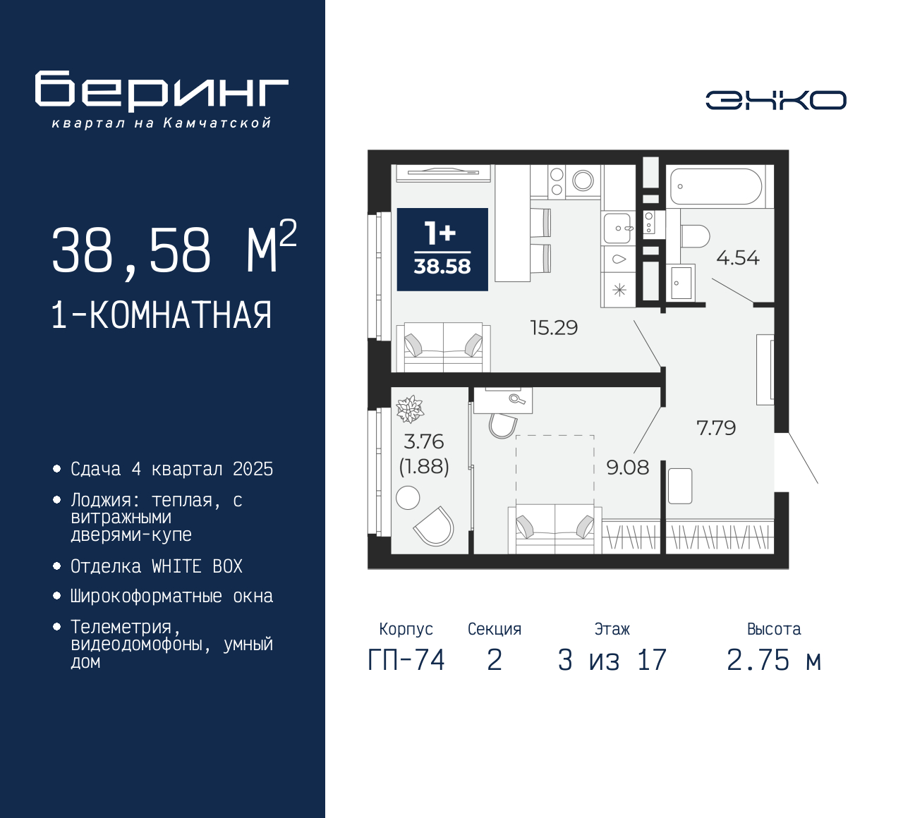 - Общая площадь 38.58 м²