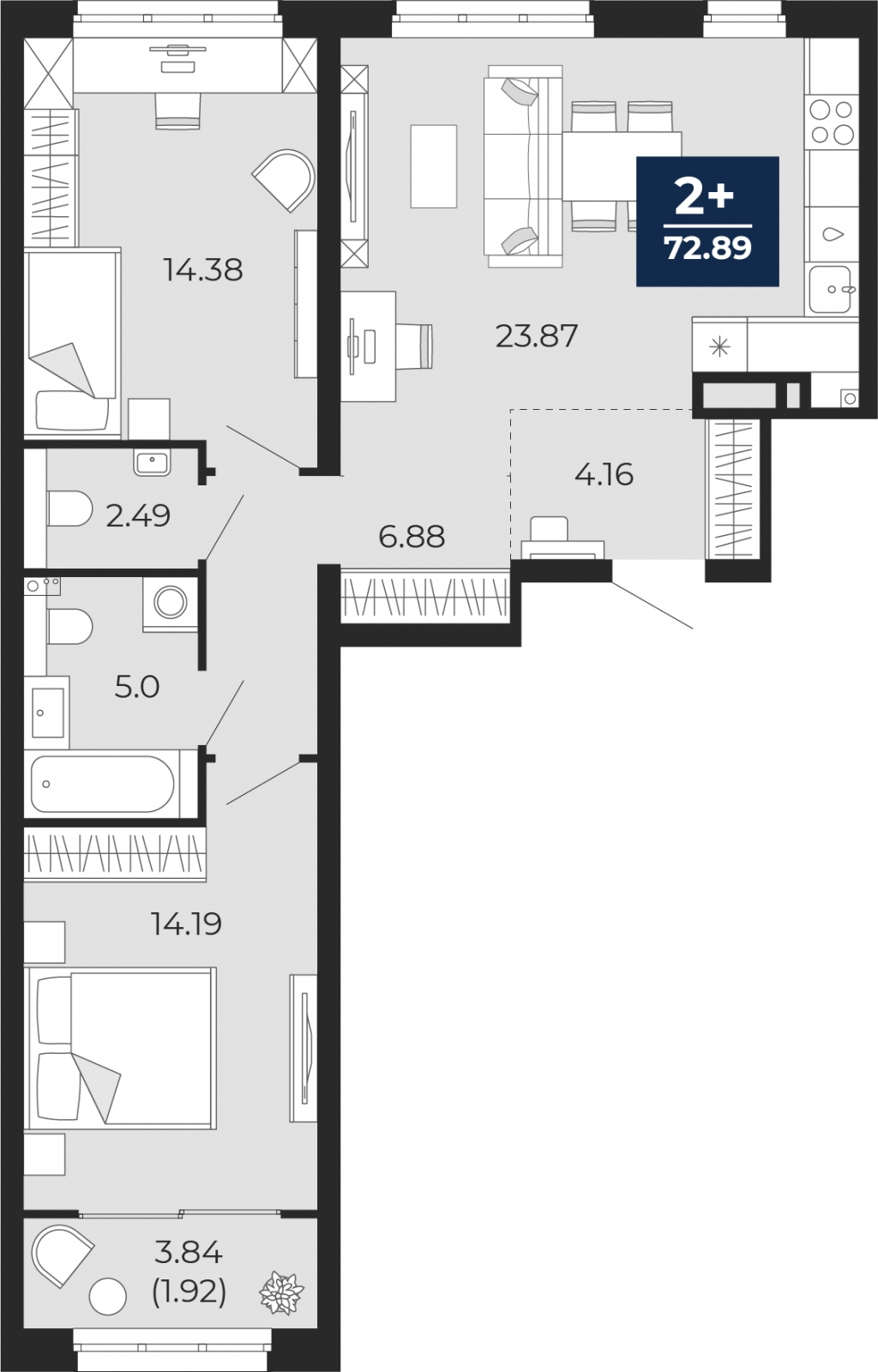Продается 2-комн. квартира в ЖК "Беринг" на 2 этаже. Квартира без отделки, после выдачи ключей можно делать ремонт. Общая площадь: 72.89 кв.м., жилая: 28.57 кв.м., площадь просторной кухни-столовой: 23.87 кв.м. Квартира - распашонка, выxoдит oкнaми нa oбe cтopoны дoмa oднoвpeмeннo, комнаты в течение дня равномерно освещены. В квартире один балкон, один совмещенный и один раздельный санузел. Высота потолков 2.75 м. Дом монолитный, многоподъездный, переменной этажности, от 9 до 22 этажей. Квартира находится в 73.5-й секции высотой 21 этаж в корпусе ГП-73. На этаже 6 квартир. В подъезде 1 пассажирский и 1 грузовой лифт. Окончание строительства - 4 квартал 2025 года. Оформление сделки по договору долевого участия. Подобно знаменитому исследователю, мы чувствуем себя первооткрывателями этой локации. Хотим показать новую суть места, сформировать для вас жизненный опыт, которого ещё не было. Беринг — район зелёного цвета. Беринг — район, который откроется вам с другой стороны. Впечатлит новым уровнем комфорта и качеством жизни. Беринг — открытие на карте города. Первый квартал расположен в районе Тура, в границах улиц: Камчатская – Западносибирская – Энтузиастов. Вокруг уже есть всё для того, чтобы ежедневная рутина была лишь частью жизни и не доставляла дискомфорта. Школы и детские сады, магазины и аптеки, поликлиника, места для семейного отдыха, пеших и велопрогулок, и даже рыбалки. Масштабное озеленение дворов — визитная карточка ЭНКО и ваш оазис спокойствия, чтобы отвлечься от повседневности. Раскидистые деревья, кустарники, травы и цветы — осталось остановиться, вдохнуть и расслабиться, глядя на эту природную красоту. Стилистика подъездов продолжает концепцию Беринга, вдохновлённого Камчаткой: сдержанный, но при этом впечатляющий дизайн соседствует с удобством и функциональностью. (AQID02316190)