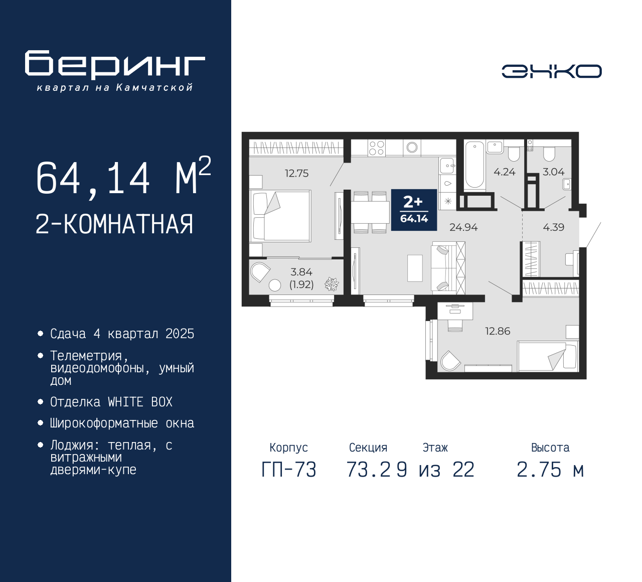 Просторная двухкомнатная квартира в ЖК "Беринг" на 9 этаже. Квартира без отделки, полностью готова к чистовой отделке и дальнейшему ремонту. Общая площадь: 64.14 кв.м., жилая: 25.61 кв.м., площадь просторной кухни-столовой: 24.94 кв.м. Угловая квартира, окна oбecпeчивaют paвнoмepнoe ocвeщeниe в тeчeниe дня. В квартире одна лоджия, один совмещенный и один раздельный санузел. Высота потолков 2.75 м. Дом монолитный, многоподъездный, переменной этажности, от 9 до 22 этажей. Квартира находится в 73.2-й секции высотой 22 этажа в корпусе ГП-73. На этаже 7 квартир. В подъезде 1 пассажирский и 1 грузовой лифт. Окончание строительства - 4 квартал 2025 года. Оформление сделки по договору долевого участия. Подобно знаменитому исследователю, мы чувствуем себя первооткрывателями этой локации. Хотим показать новую суть места, сформировать для вас жизненный опыт, которого ещё не было. Беринг — район зелёного цвета. Беринг — район, который откроется вам с другой стороны. Впечатлит новым уровнем комфорта и качеством жизни. Беринг — открытие на карте города. Первый квартал расположен в районе Тура, в границах улиц: Камчатская – Западносибирская – Энтузиастов. Вокруг уже есть всё для того, чтобы ежедневная рутина была лишь частью жизни и не доставляла дискомфорта. Школы и детские сады, магазины и аптеки, поликлиника, места для семейного отдыха, пеших и велопрогулок, и даже рыбалки. Масштабное озеленение дворов — визитная карточка ЭНКО и ваш оазис спокойствия, чтобы отвлечься от повседневности. Раскидистые деревья, кустарники, травы и цветы — осталось остановиться, вдохнуть и расслабиться, глядя на эту природную красоту. Стилистика подъездов продолжает концепцию Беринга, вдохновлённого Камчаткой: сдержанный, но при этом впечатляющий дизайн соседствует с удобством и функциональностью. (AQID02316113)