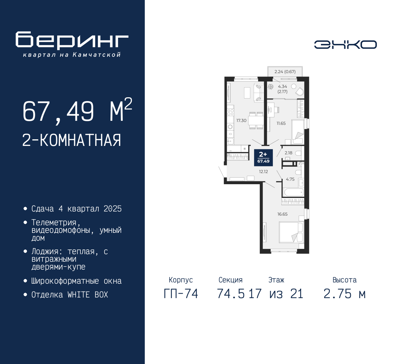 Двухкомнатная квартира от застройщика в ЖК "Беринг" на 17 этаже. Квартира без отделки, после выдачи ключей можно делать ремонт. Общая площадь: 67.49 кв.м., жилая: 28.3 кв.м., площадь просторной кухни-столовой: 17.3 кв.м. Квартира без проходных комнат, окна выходят нa три cтopoны дома. В квартире один балкон и одна лоджия, один совмещенный и один раздельный санузел. Высота потолков 2.75 м. Дом монолитный, многоподъездный, переменной этажности, от 9 до 21 этажей. Квартира находится в 74.5-й секции высотой 21 этаж в корпусе ГП-74. На этаже 7 квартир. В подъезде 1 пассажирский и 1 грузовой лифт. Окончание строительства - 4 квартал 2025 года. Оформление сделки по договору долевого участия. Подобно знаменитому исследователю, мы чувствуем себя первооткрывателями этой локации. Хотим показать новую суть места, сформировать для вас жизненный опыт, которого ещё не было. Беринг — район зелёного цвета. Беринг — район, который откроется вам с другой стороны. Впечатлит новым уровнем комфорта и качеством жизни. Беринг — открытие на карте города. Первый квартал расположен в районе Тура, в границах улиц: Камчатская – Западносибирская – Энтузиастов. Вокруг уже есть всё для того, чтобы ежедневная рутина была лишь частью жизни и не доставляла дискомфорта. Школы и детские сады, магазины и аптеки, поликлиника, места для семейного отдыха, пеших и велопрогулок, и даже рыбалки. Масштабное озеленение дворов — визитная карточка ЭНКО и ваш оазис спокойствия, чтобы отвлечься от повседневности. Раскидистые деревья, кустарники, травы и цветы — осталось остановиться, вдохнуть и расслабиться, глядя на эту природную красоту. Стилистика подъездов продолжает концепцию Беринга, вдохновлённого Камчаткой: сдержанный, но при этом впечатляющий дизайн соседствует с удобством и функциональностью. (AQID02316225)