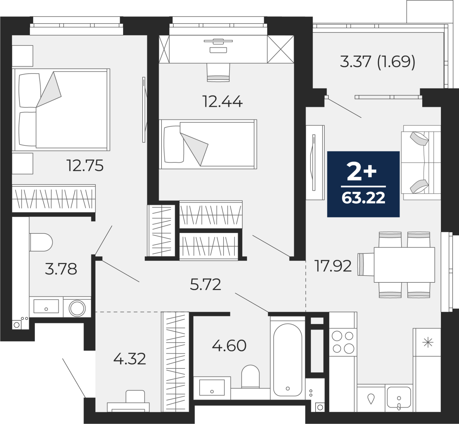 - Общая площадь 63.22 м²