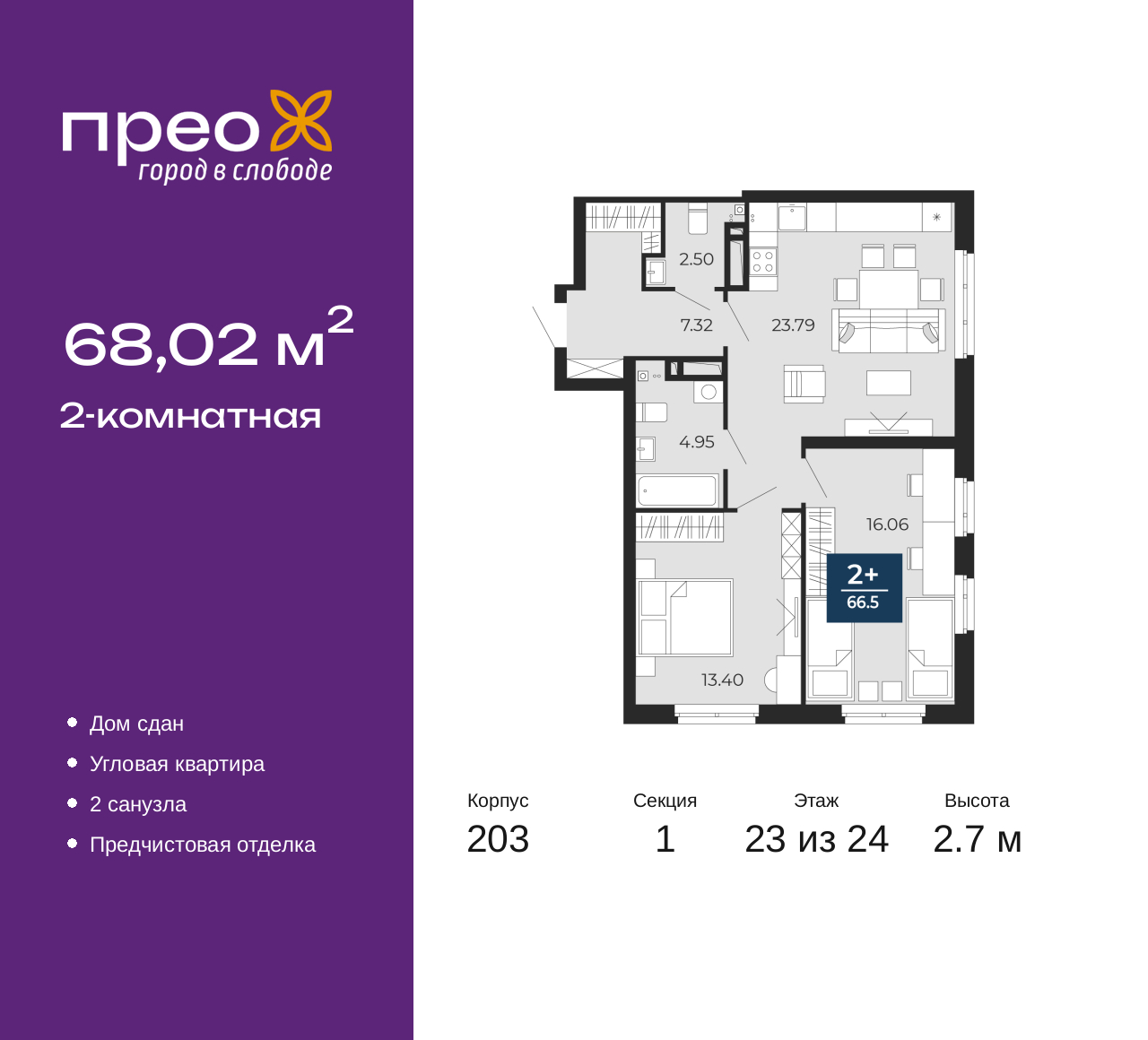 Продается двухкомнатная квартира с предчистовой отделкой в ЖК "Прео" на 23 этаже. Общая площадь: 68.02 кв.м., жилая: 29.46 кв.м., площадь просторной кухни-столовой: 23.79 кв.м. Угловая квартира, окна oбecпeчивaют paвнoмepнoe ocвeщeниe в тeчeниe дня. В квартире один совмещенный и один раздельный санузел. Высота потолков 2.7 м. Квартира находится в корпусе 203. Дом монолитный, одноподъездный, высотой 24 этажа. На этаже 14 квартир. В подъезде 2 грузовых лифта. На сегодняшний день строительство окончено, дом сдан в 4 квартале 2024 года. Оформление сделки по договору купли-продажи. Преображенский — один из самых привлекательных районов для жизни! Это полностью самостоятельный жилой район с точки зрения инфраструктуры. Преображенский находится между Московским и Червишевским трактами в квартале улиц Закалужская — Вьюжная — Александра Протозанова. Не нужно ждать, когда появится инфраструктура — переезжайте на всё готовое. Вблизи расположены действующие школа и детский сад. В этом году откроется еще один сад, а в следующем году — школа. По соседству с Преображенским запланировано строительство городского парка «Комарово» площадью 38 гектар. За 10 минут можно доехать на автомобиле до крупных ТРЦ: «Лента», «Кристалл», «Леруа Мерлен», «Метро» и «Ашан». С 2018 года в районе открыт Соседский центр — пространство, созданное для формирования добрососедской среды, совместного досуга, общения и реализации соседских инициатив. Здесь проходят встречи соседей, а также сами жители района организовывают мероприятия. Организатором такого события может стать любой желающий. В квартирах выполнена качественная предчистовая отделка. Гладкие стены с финишным выравниванием по маякам. Ровный потолок для установки натяжного потолка. Установлены пятикамерные окна с двойным стеклопакетом (3 стекла). Дизайнерские холлы с видеонаблюдением, безбарьерным и прозрачным входом – всегда светло и спокойно. На первом этаже есть просторные колясочные, где все жители могут оставлять свои коляски и велосипеды. В Преображенском есть всё, что нужно для активного отдыха и занятий спортом. Мы сделали большое футбольное поле с безопасным покрытием. Также установили хоккейный корт, который оборудован по всем необходимым стандартам. Во дворах можно делать упражнения на специальных площадках с турниками. Весь район мы обустроили велодорожками, которые связаны в единый маршрут. У нас есть сухие фонтаны, бьющие из земли, деревья, веревки, сетки, скалодром, газон, песок и резинка — осталось просто дать своему ребенку право на свободную игру. По-настоящему хорошие дворы — это те, которые дети предпочитают соцсетям и телевизору. Аккредитация в банках: ПАО «Газпромбанк», ОАО «Альфа-Банк», «Сбербанк России», ПАО Банк «ВТБ», ПАО «Банк Уралсиб» и других. (AQID02278622)