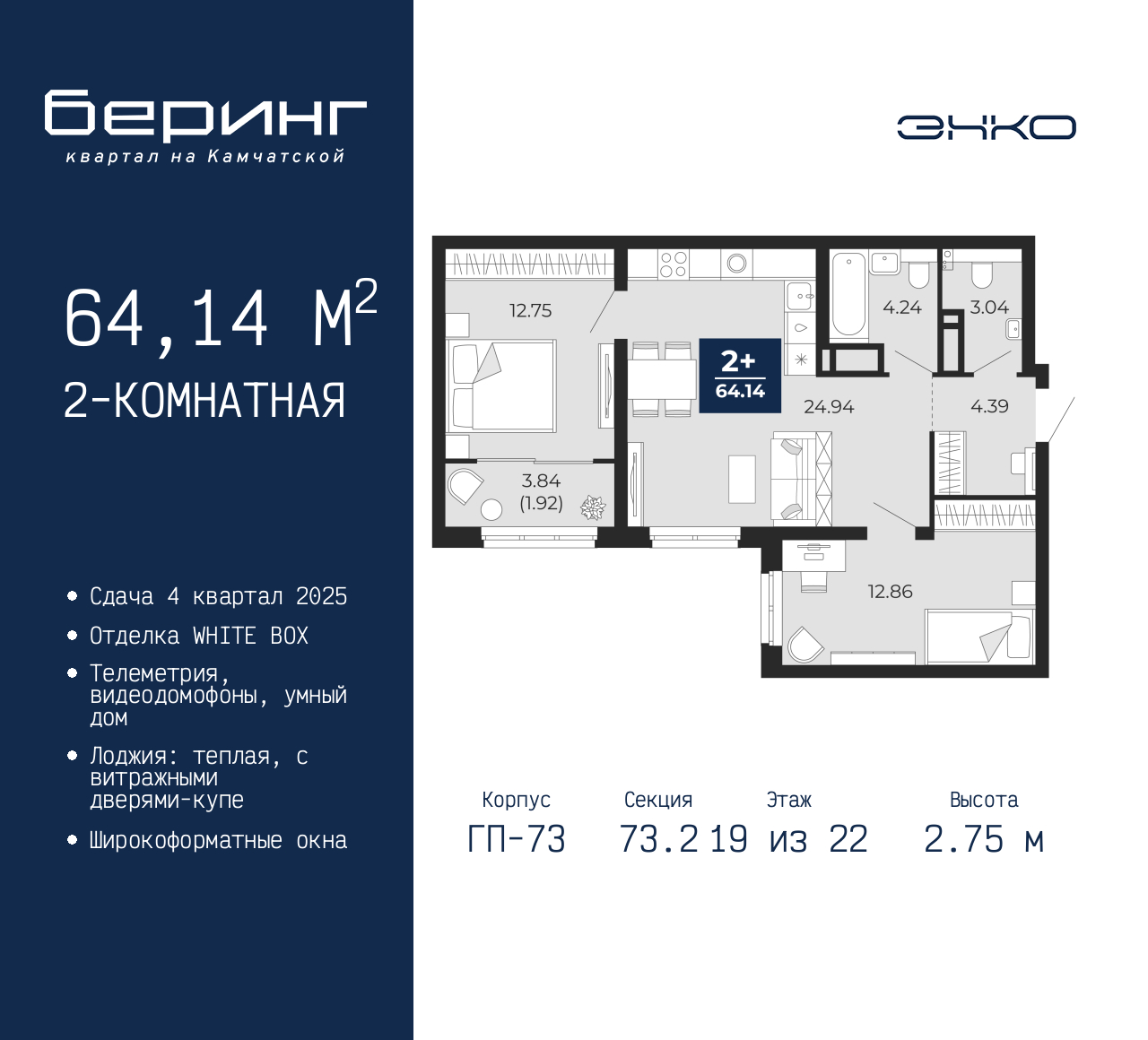 2-комн. квартира от застройщика в ЖК "Беринг" на 19 этаже. Квартира без отделки, полностью готова к чистовой отделке и дальнейшему ремонту. Общая площадь: 64.14 кв.м., жилая: 25.61 кв.м., площадь просторной кухни-столовой: 24.94 кв.м. Квартира угловая, окна oбecпeчивaют paвнoмepнoe ocвeщeниe в тeчeниe дня. В квартире одна лоджия, один совмещенный и один раздельный санузел. Высота потолков 2.75 м. Дом монолитный, многоподъездный, переменной этажности, от 9 до 22 этажей. Квартира находится в 73.2-й секции высотой 22 этажа в корпусе ГП-73. На этаже 7 квартир. В подъезде 1 пассажирский и 1 грузовой лифт. Окончание строительства - 4 квартал 2025 года. Оформление сделки по договору долевого участия. Подобно знаменитому исследователю, мы чувствуем себя первооткрывателями этой локации. Хотим показать новую суть места, сформировать для вас жизненный опыт, которого ещё не было. Беринг — район зелёного цвета. Беринг — район, который откроется вам с другой стороны. Впечатлит новым уровнем комфорта и качеством жизни. Беринг — открытие на карте города. Первый квартал расположен в районе Тура, в границах улиц: Камчатская – Западносибирская – Энтузиастов. Вокруг уже есть всё для того, чтобы ежедневная рутина была лишь частью жизни и не доставляла дискомфорта. Школы и детские сады, магазины и аптеки, поликлиника, места для семейного отдыха, пеших и велопрогулок, и даже рыбалки. Масштабное озеленение дворов — визитная карточка ЭНКО и ваш оазис спокойствия, чтобы отвлечься от повседневности. Раскидистые деревья, кустарники, травы и цветы — осталось остановиться, вдохнуть и расслабиться, глядя на эту природную красоту. Стилистика подъездов продолжает концепцию Беринга, вдохновлённого Камчаткой: сдержанный, но при этом впечатляющий дизайн соседствует с удобством и функциональностью. (AQID02316086)