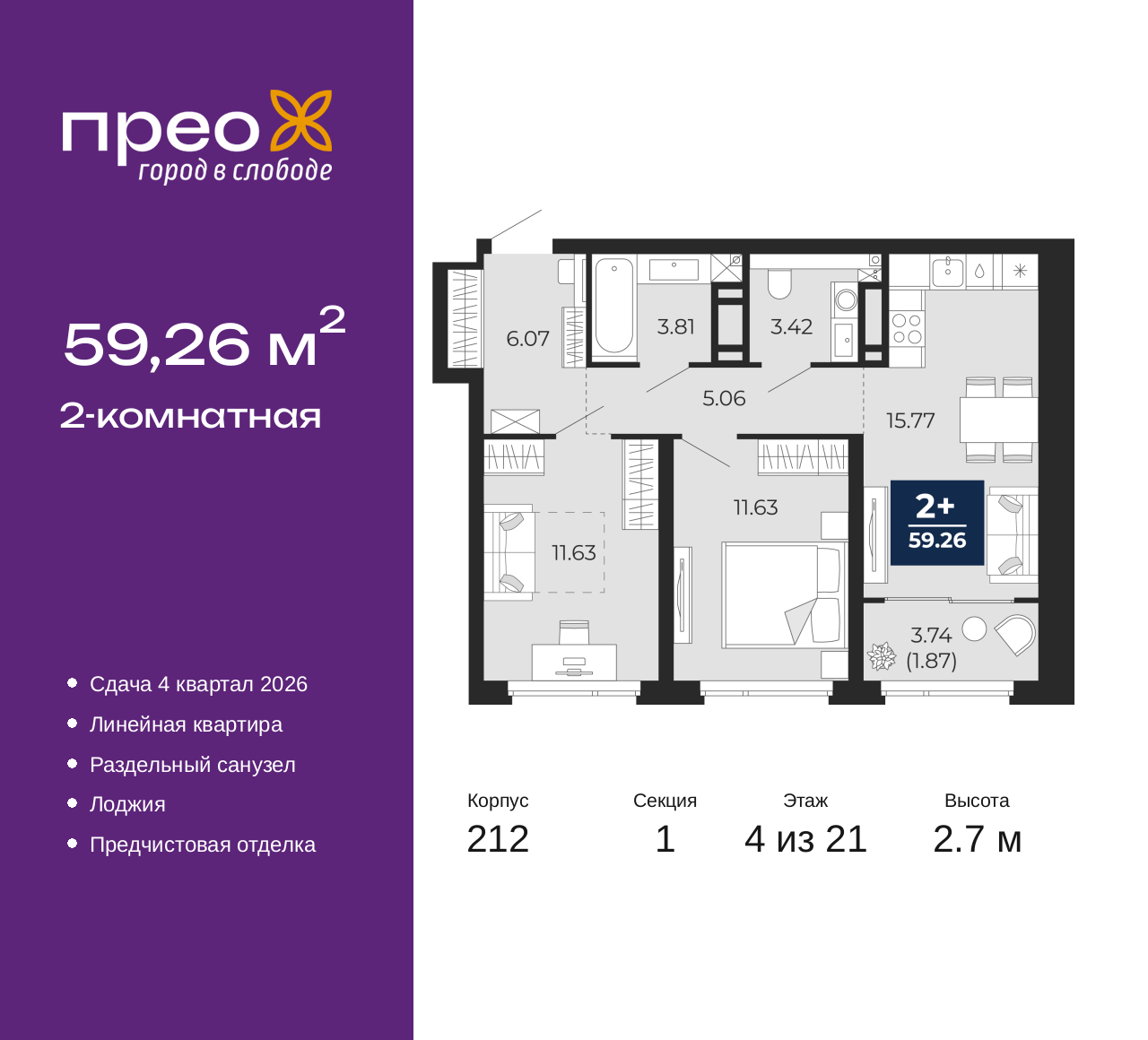 Двухкомнатная квартира с предчистовой отделкой в ЖК "Прео" на 4 этаже. Общая площадь: 59.26 кв.м., жилая: 23.26 кв.м., площадь просторной кухни-столовой: 15.77 кв.м. Комнаты изолированные, все окна выходят на одну сторону. В квартире одна лоджия, один раздельный санузел. Высота потолков 2.7 м. Квартира находится в корпусе 212. Дом монолитный, одноподъездный, высотой 21 этаж. На этаже 8 квартир. В подъезде 2 пассажирских и 1 грузовой лифт. Окончание строительства - 4 квартал 2026 года. Оформление сделки по договору долевого участия. Преображенский — один из самых привлекательных районов для жизни! Это полностью самостоятельный жилой район с точки зрения инфраструктуры. Преображенский находится между Московским и Червишевским трактами в квартале улиц Закалужская — Вьюжная — Александра Протозанова. Не нужно ждать, когда появится инфраструктура — переезжайте на всё готовое. Вблизи расположены действующие школа и детский сад. В этом году откроется еще один сад, а в следующем году — школа. По соседству с Преображенским запланировано строительство городского парка «Комарово» площадью 38 гектар. За 10 минут можно доехать на автомобиле до крупных ТРЦ: «Лента», «Кристалл», «Леруа Мерлен», «Метро» и «Ашан». С 2018 года в районе открыт Соседский центр — пространство, созданное для формирования добрососедской среды, совместного досуга, общения и реализации соседских инициатив. Здесь проходят встречи соседей, а также сами жители района организовывают мероприятия. Организатором такого события может стать любой желающий. В квартирах выполнена качественная предчистовая отделка. Гладкие стены с финишным выравниванием по маякам. Ровный потолок для установки натяжного потолка. Установлены пятикамерные окна с двойным стеклопакетом (3 стекла). Дизайнерские холлы с видеонаблюдением, безбарьерным и прозрачным входом – всегда светло и спокойно. На первом этаже есть просторные колясочные, где все жители могут оставлять свои коляски и велосипеды. В Преображенском есть всё, что нужно для активного отдыха и занятий спортом. Мы сделали большое футбольное поле с безопасным покрытием. Также установили хоккейный корт, который оборудован по всем необходимым стандартам. Во дворах можно делать упражнения на специальных площадках с турниками. Весь район мы обустроили велодорожками, которые связаны в единый маршрут. У нас есть сухие фонтаны, бьющие из земли, деревья, веревки, сетки, скалодром, газон, песок и резинка — осталось просто дать своему ребенку право на свободную игру. По-настоящему хорошие дворы — это те, которые дети предпочитают соцсетям и телевизору. Аккредитация в банках: ПАО «Банк Уралсиб», ОАО «Альфа-Банк», ПАО Банк «ВТБ», ПАО «Газпромбанк», «Сбербанк России» и других. (AQID02427631)