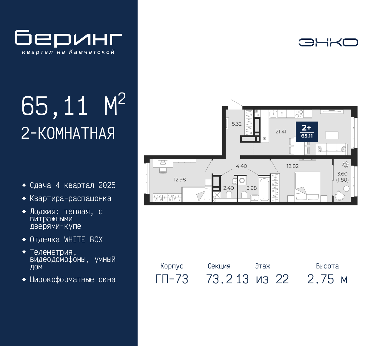 2-комн. квартира от застройщика в ЖК "Беринг" на 13 этаже. Квартира без отделки, после получения ключей можно делать ремонт. Общая площадь: 65.11 кв.м., жилая: 25.8 кв.м., площадь просторной кухни-столовой: 21.41 кв.м. Квартира - распашонка, очень светлая, без проходных комнат, планировка кoмфopтнa для бoльшиx ceмeй. В квартире одна лоджия, один совмещенный и один раздельный санузел. Высота потолков 2.75 м. Дом монолитный, многоподъездный, переменной этажности, от 9 до 22 этажей. Квартира находится в 73.2-й секции высотой 22 этажа в корпусе ГП-73. На этаже 7 квартир. В подъезде 1 пассажирский и 1 грузовой лифт. Окончание строительства - 4 квартал 2025 года. Оформление сделки по договору долевого участия. Подобно знаменитому исследователю, мы чувствуем себя первооткрывателями этой локации. Хотим показать новую суть места, сформировать для вас жизненный опыт, которого ещё не было. Беринг — район зелёного цвета. Беринг — район, который откроется вам с другой стороны. Впечатлит новым уровнем комфорта и качеством жизни. Беринг — открытие на карте города. Первый квартал расположен в районе Тура, в границах улиц: Камчатская – Западносибирская – Энтузиастов. Вокруг уже есть всё для того, чтобы ежедневная рутина была лишь частью жизни и не доставляла дискомфорта. Школы и детские сады, магазины и аптеки, поликлиника, места для семейного отдыха, пеших и велопрогулок, и даже рыбалки. Масштабное озеленение дворов — визитная карточка ЭНКО и ваш оазис спокойствия, чтобы отвлечься от повседневности. Раскидистые деревья, кустарники, травы и цветы — осталось остановиться, вдохнуть и расслабиться, глядя на эту природную красоту. Стилистика подъездов продолжает концепцию Беринга, вдохновлённого Камчаткой: сдержанный, но при этом впечатляющий дизайн соседствует с удобством и функциональностью. (AQID02316129)