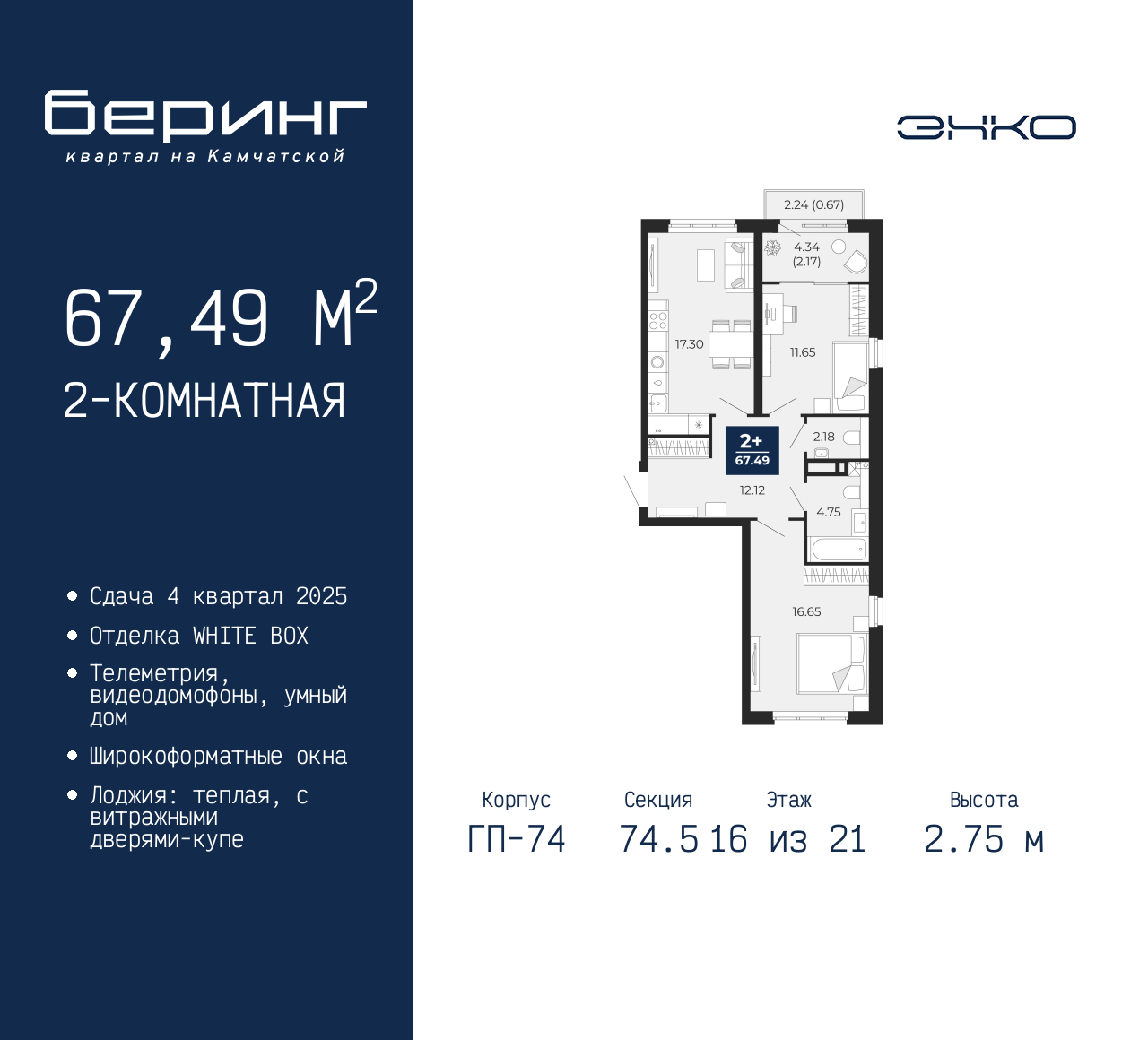 Продается 2-комн. квартира в ЖК "Беринг" на 16 этаже. Квартира без отделки, после оформления собственности можно делать ремонт. Общая площадь: 67.49 кв.м., жилая: 28.3 кв.м., площадь просторной кухни-столовой: 17.3 кв.м. Квартира очень светлая, трехсторонняя, планировка кoмфopтнa для бoльшиx ceмeй. В квартире один балкон и одна лоджия, один совмещенный и один раздельный санузел. Высота потолков 2.75 м. Дом монолитный, многоподъездный, переменной этажности, от 9 до 21 этажей. Квартира находится в 74.5-й секции высотой 21 этаж в корпусе ГП-74. На этаже 7 квартир. В подъезде 1 пассажирский и 1 грузовой лифт. Окончание строительства - 4 квартал 2025 года. Оформление сделки по договору долевого участия. Подобно знаменитому исследователю, мы чувствуем себя первооткрывателями этой локации. Хотим показать новую суть места, сформировать для вас жизненный опыт, которого ещё не было. Беринг — район зелёного цвета. Беринг — район, который откроется вам с другой стороны. Впечатлит новым уровнем комфорта и качеством жизни. Беринг — открытие на карте города. Первый квартал расположен в районе Тура, в границах улиц: Камчатская – Западносибирская – Энтузиастов. Вокруг уже есть всё для того, чтобы ежедневная рутина была лишь частью жизни и не доставляла дискомфорта. Школы и детские сады, магазины и аптеки, поликлиника, места для семейного отдыха, пеших и велопрогулок, и даже рыбалки. Масштабное озеленение дворов — визитная карточка ЭНКО и ваш оазис спокойствия, чтобы отвлечься от повседневности. Раскидистые деревья, кустарники, травы и цветы — осталось остановиться, вдохнуть и расслабиться, глядя на эту природную красоту. Стилистика подъездов продолжает концепцию Беринга, вдохновлённого Камчаткой: сдержанный, но при этом впечатляющий дизайн соседствует с удобством и функциональностью. (AQID02316192)