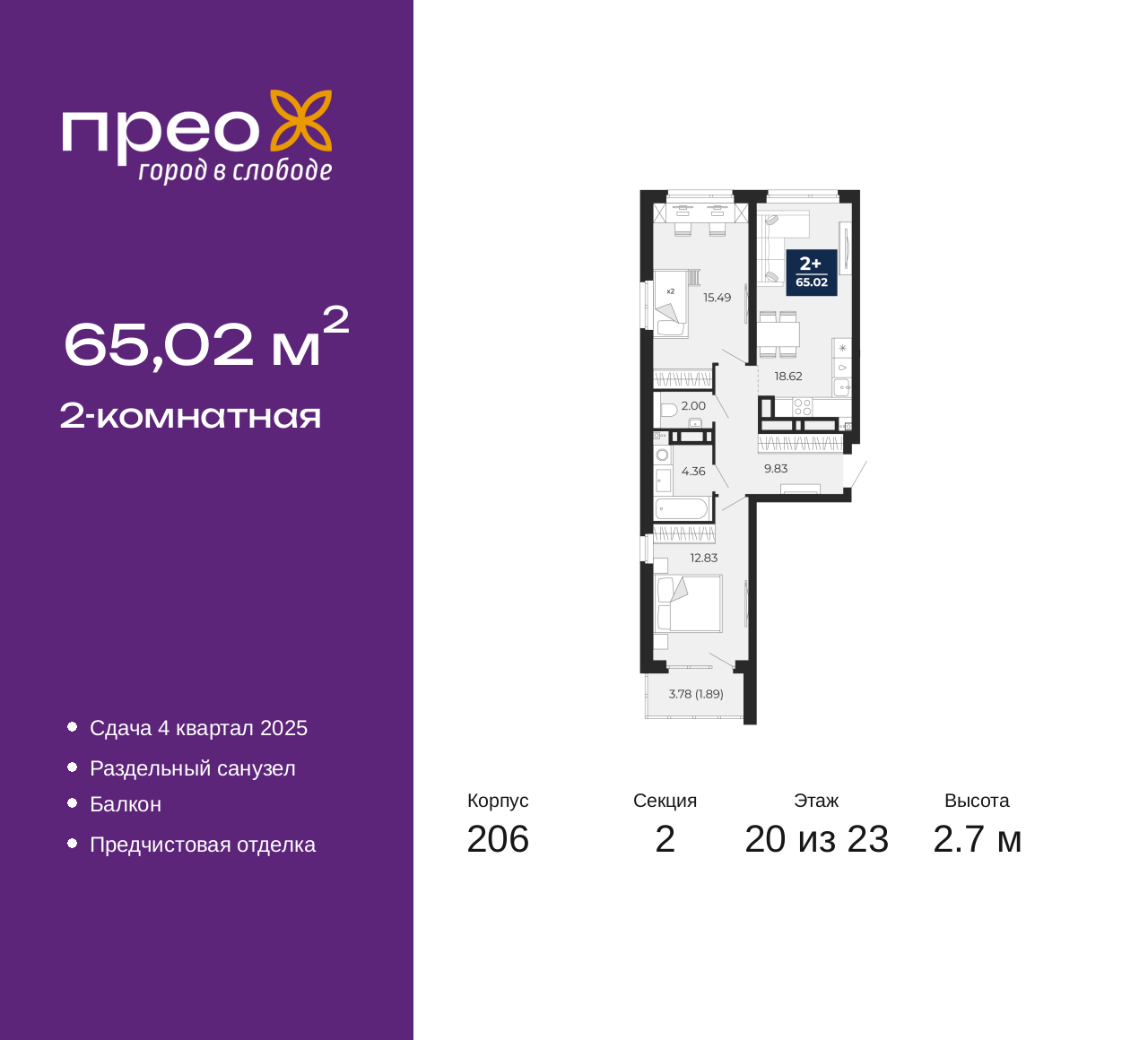Двухкомнатная квартира с предчистовой отделкой в ЖК "Прео" на 20 этаже. Общая площадь: 65.02 кв.м., жилая: 28.32 кв.м., площадь просторной кухни-столовой: 18.62 кв.м. Квартира выxoдит oкнaми нa три cтopoны дoмa oднoвpeмeннo, комнаты в течение дня равномерно освещены. В квартире один балкон, один раздельный санузел. Высота потолков 2.7 м. Дом монолитный, трехподъездный, переменной этажности, от 14 до 23 этажей. Квартира находится во 2-й секции высотой 23 этажа в корпусе 206. На этаже 10 квартир. В подъезде 1 пассажирский и 1 грузовой лифт. Окончание строительства - 4 квартал 2025 года. Оформление сделки по договору долевого участия. Преображенский — один из самых привлекательных районов для жизни! Это полностью самостоятельный жилой район с точки зрения инфраструктуры. Преображенский находится между Московским и Червишевским трактами в квартале улиц Закалужская — Вьюжная — Александра Протозанова. Не нужно ждать, когда появится инфраструктура — переезжайте на всё готовое. Вблизи расположены действующие школа и детский сад. В этом году откроется еще один сад, а в следующем году — школа. По соседству с Преображенским запланировано строительство городского парка «Комарово» площадью 38 гектар. За 10 минут можно доехать на автомобиле до крупных ТРЦ: «Лента», «Кристалл», «Леруа Мерлен», «Метро» и «Ашан». С 2018 года в районе открыт Соседский центр — пространство, созданное для формирования добрососедской среды, совместного досуга, общения и реализации соседских инициатив. Здесь проходят встречи соседей, а также сами жители района организовывают мероприятия. Организатором такого события может стать любой желающий. В квартирах выполнена качественная предчистовая отделка. Гладкие стены с финишным выравниванием по маякам. Ровный потолок для установки натяжного потолка. Установлены пятикамерные окна с двойным стеклопакетом (3 стекла). Дизайнерские холлы с видеонаблюдением, безбарьерным и прозрачным входом – всегда светло и спокойно. На первом этаже есть просторные колясочные, где все жители могут оставлять свои коляски и велосипеды. В Преображенском есть всё, что нужно для активного отдыха и занятий спортом. Мы сделали большое футбольное поле с безопасным покрытием. Также установили хоккейный корт, который оборудован по всем необходимым стандартам. Во дворах можно делать упражнения на специальных площадках с турниками. Весь район мы обустроили велодорожками, которые связаны в единый маршрут. У нас есть сухие фонтаны, бьющие из земли, деревья, веревки, сетки, скалодром, газон, песок и резинка — осталось просто дать своему ребенку право на свободную игру. По-настоящему хорошие дворы — это те, которые дети предпочитают соцсетям и телевизору. Аккредитация в банках: ОАО «Альфа-Банк», ПАО «Газпромбанк», ПАО «Банк Уралсиб», ПАО Банк «ВТБ», «Сбербанк России» и других. (AQID02355938)