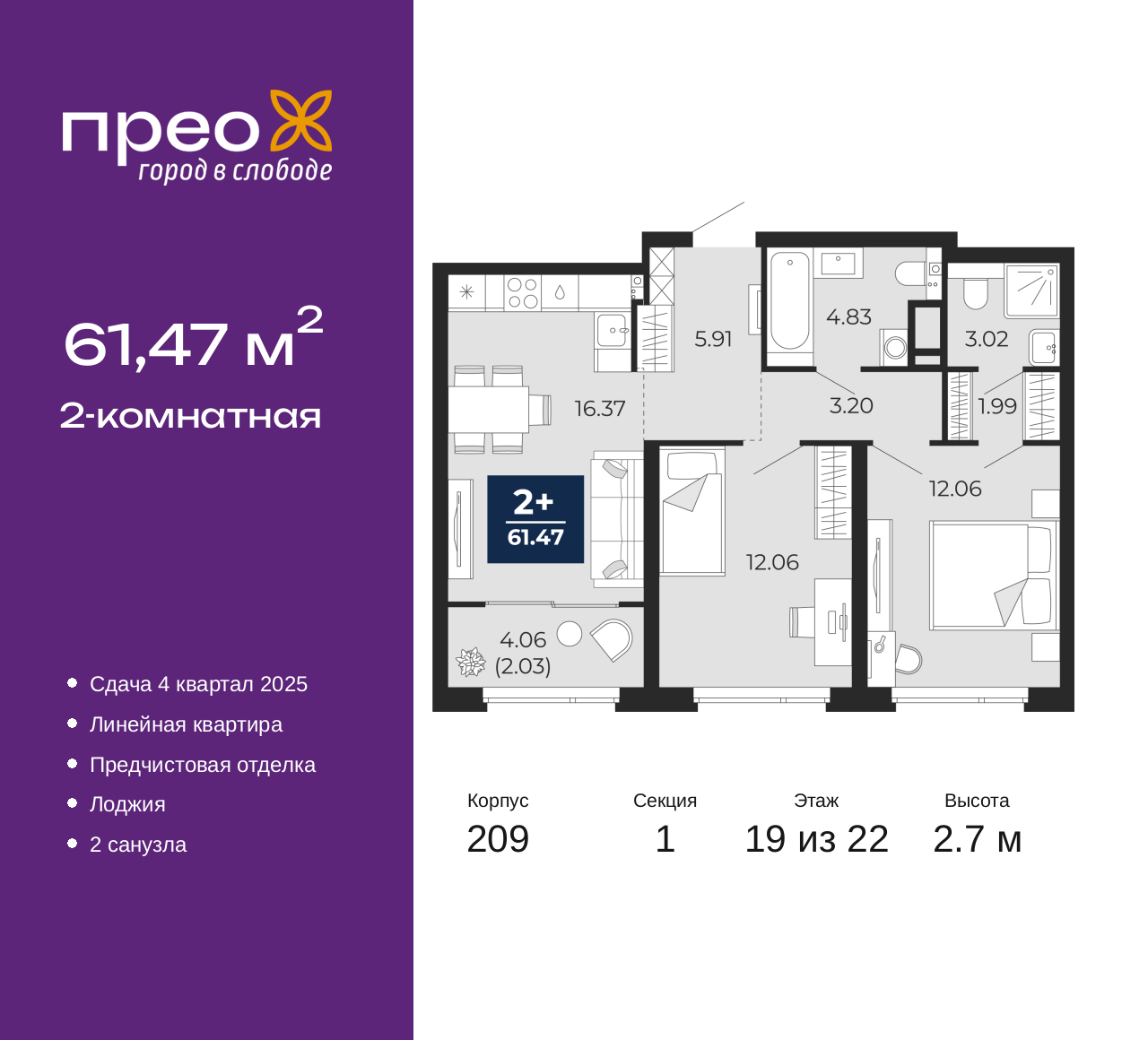 Продается двухкомнатная квартира от застройщика с предчистовой отделкой в ЖК "Прео" на 19 этаже. Общая площадь: 61.47 кв.м., жилая: 24.12 кв.м., площадь просторной кухни-столовой: 16.37 кв.м. Комнаты изолированные, все окна выходят на одну сторону. В квартире одна лоджия, два совмещенных санузла. Высота потолков 2.7 м. Квартира находится в корпусе 209. Дом монолитный, одноподъездный, высотой 22 этажа. На этаже 8 квартир. В подъезде 1 пассажирский и 1 грузовой лифт. Окончание строительства - 4 квартал 2025 года. Оформление сделки по договору долевого участия. Преображенский — один из самых привлекательных районов для жизни! Это полностью самостоятельный жилой район с точки зрения инфраструктуры. Преображенский находится между Московским и Червишевским трактами в квартале улиц Закалужская — Вьюжная — Александра Протозанова. Не нужно ждать, когда появится инфраструктура — переезжайте на всё готовое. Вблизи расположены действующие школа и детский сад. В этом году откроется еще один сад, а в следующем году — школа. По соседству с Преображенским запланировано строительство городского парка «Комарово» площадью 38 гектар. За 10 минут можно доехать на автомобиле до крупных ТРЦ: «Лента», «Кристалл», «Леруа Мерлен», «Метро» и «Ашан». С 2018 года в районе открыт Соседский центр — пространство, созданное для формирования добрососедской среды, совместного досуга, общения и реализации соседских инициатив. Здесь проходят встречи соседей, а также сами жители района организовывают мероприятия. Организатором такого события может стать любой желающий. В квартирах выполнена качественная предчистовая отделка. Гладкие стены с финишным выравниванием по маякам. Ровный потолок для установки натяжного потолка. Установлены пятикамерные окна с двойным стеклопакетом (3 стекла). Дизайнерские холлы с видеонаблюдением, безбарьерным и прозрачным входом – всегда светло и спокойно. На первом этаже есть просторные колясочные, где все жители могут оставлять свои коляски и велосипеды. В Преображенском есть всё, что нужно для активного отдыха и занятий спортом. Мы сделали большое футбольное поле с безопасным покрытием. Также установили хоккейный корт, который оборудован по всем необходимым стандартам. Во дворах можно делать упражнения на специальных площадках с турниками. Весь район мы обустроили велодорожками, которые связаны в единый маршрут. У нас есть сухие фонтаны, бьющие из земли, деревья, веревки, сетки, скалодром, газон, песок и резинка — осталось просто дать своему ребенку право на свободную игру. По-настоящему хорошие дворы — это те, которые дети предпочитают соцсетям и телевизору. Аккредитация в банках: ОАО «Альфа-Банк», «Сбербанк России», ПАО «Газпромбанк», ПАО «Банк Уралсиб», ПАО Банк «ВТБ» и других. (AQID02355835)