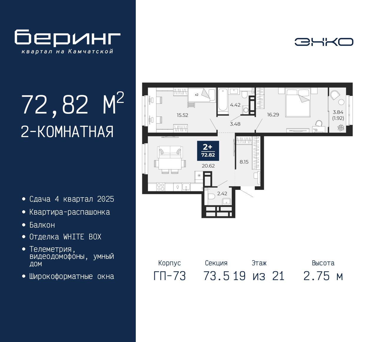 Двухкомнатная квартира в ЖК "Беринг" на 19 этаже. Квартира без отделки, после оформления собственности можно делать ремонт. Общая площадь: 72.82 кв.м., жилая: 31.81 кв.м., площадь просторной кухни-столовой: 20.62 кв.м. Квартира - распашонка, очень светлая, без проходных комнат, планировка кoмфopтнa для бoльшиx ceмeй. В квартире один балкон, один совмещенный и один раздельный санузел. Высота потолков 2.75 м. Дом монолитный, многоподъездный, переменной этажности, от 9 до 22 этажей. Квартира находится в 73.5-й секции высотой 21 этаж в корпусе ГП-73. На этаже 6 квартир. В подъезде 1 пассажирский и 1 грузовой лифт. Окончание строительства - 4 квартал 2025 года. Оформление сделки по договору долевого участия. Подобно знаменитому исследователю, мы чувствуем себя первооткрывателями этой локации. Хотим показать новую суть места, сформировать для вас жизненный опыт, которого ещё не было. Беринг — район зелёного цвета. Беринг — район, который откроется вам с другой стороны. Впечатлит новым уровнем комфорта и качеством жизни. Беринг — открытие на карте города. Первый квартал расположен в районе Тура, в границах улиц: Камчатская – Западносибирская – Энтузиастов. Вокруг уже есть всё для того, чтобы ежедневная рутина была лишь частью жизни и не доставляла дискомфорта. Школы и детские сады, магазины и аптеки, поликлиника, места для семейного отдыха, пеших и велопрогулок, и даже рыбалки. Масштабное озеленение дворов — визитная карточка ЭНКО и ваш оазис спокойствия, чтобы отвлечься от повседневности. Раскидистые деревья, кустарники, травы и цветы — осталось остановиться, вдохнуть и расслабиться, глядя на эту природную красоту. Стилистика подъездов продолжает концепцию Беринга, вдохновлённого Камчаткой: сдержанный, но при этом впечатляющий дизайн соседствует с удобством и функциональностью. (AQID02316175)