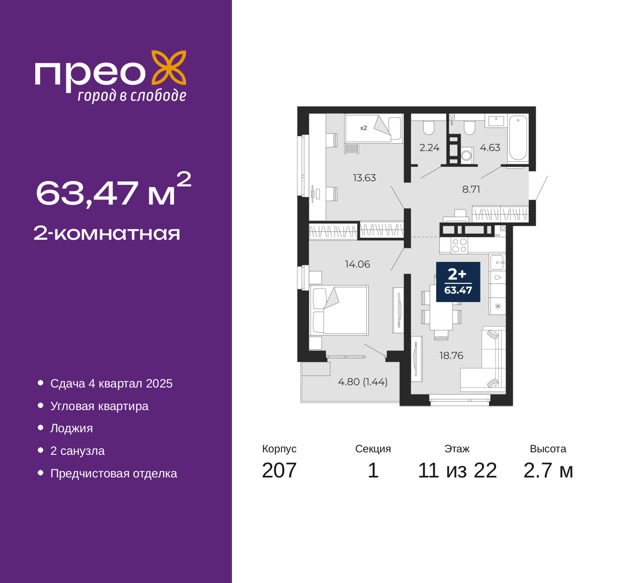 2-комн. квартира с предчистовой отделкой в ЖК "Прео" на 11 этаже. Общая площадь: 63.47 кв.м., жилая: 27.69 кв.м., площадь просторной кухни-столовой: 18.76 кв.м. Квартира угловая, очень светлая, естественная вентиляция при открытии окон. В квартире одна лоджия, один совмещенный и один раздельный санузел. Высота потолков 2.7 м. Дом монолитный, двухподъездный, высотой 22 этажа. Квартира находится в 1-й секции в корпусе 207. На этаже 8 квартир. В подъезде 1 пассажирский и 1 грузовой лифт. Окончание строительства - 4 квартал 2025 года. Оформление сделки по договору долевого участия. Преображенский — один из самых привлекательных районов для жизни! Это полностью самостоятельный жилой район с точки зрения инфраструктуры. Преображенский находится между Московским и Червишевским трактами в квартале улиц Закалужская — Вьюжная — Александра Протозанова. Не нужно ждать, когда появится инфраструктура — переезжайте на всё готовое. Вблизи расположены действующие школа и детский сад. В этом году откроется еще один сад, а в следующем году — школа. По соседству с Преображенским запланировано строительство городского парка «Комарово» площадью 38 гектар. За 10 минут можно доехать на автомобиле до крупных ТРЦ: «Лента», «Кристалл», «Леруа Мерлен», «Метро» и «Ашан». С 2018 года в районе открыт Соседский центр — пространство, созданное для формирования добрососедской среды, совместного досуга, общения и реализации соседских инициатив. Здесь проходят встречи соседей, а также сами жители района организовывают мероприятия. Организатором такого события может стать любой желающий. В квартирах выполнена качественная предчистовая отделка. Гладкие стены с финишным выравниванием по маякам. Ровный потолок для установки натяжного потолка. Установлены пятикамерные окна с двойным стеклопакетом (3 стекла). Дизайнерские холлы с видеонаблюдением, безбарьерным и прозрачным входом – всегда светло и спокойно. На первом этаже есть просторные колясочные, где все жители могут оставлять свои коляски и велосипеды. В Преображенском есть всё, что нужно для активного отдыха и занятий спортом. Мы сделали большое футбольное поле с безопасным покрытием. Также установили хоккейный корт, который оборудован по всем необходимым стандартам. Во дворах можно делать упражнения на специальных площадках с турниками. Весь район мы обустроили велодорожками, которые связаны в единый маршрут. У нас есть сухие фонтаны, бьющие из земли, деревья, веревки, сетки, скалодром, газон, песок и резинка — осталось просто дать своему ребенку право на свободную игру. По-настоящему хорошие дворы — это те, которые дети предпочитают соцсетям и телевизору. Аккредитация в банках: ПАО «Банк Уралсиб», «Сбербанк России», ОАО «Альфа-Банк», ПАО «Газпромбанк», ПАО Банк «ВТБ» и других. (AQID02355900)