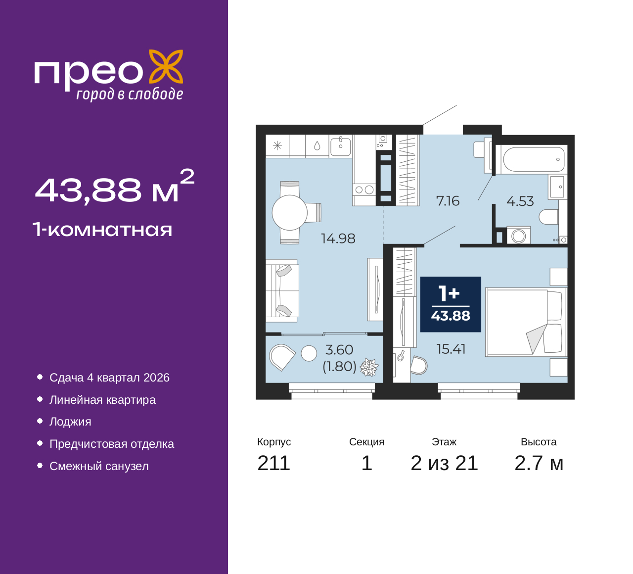 Просторная 1-комн. квартира с предчистовой отделкой в ЖК "Прео" на 2 этаже. Общая площадь: 43.88 кв.м., жилая: 15.41 кв.м., площадь просторной кухни-столовой: 14.98 кв.м. Все окна выходят на одну сторону. В квартире одна лоджия, один совмещенный санузел. Высота потолков 2.7 м. Дом монолитный, черырехподъездный, переменной этажности, от 14 до 21 этажей. Квартира находится в 1-й секции высотой 21 этаж в корпусе 211. На этаже 8 квартир. В подъезде 1 пассажирский и 1 грузовой лифт. Окончание строительства - 4 квартал 2026 года. Оформление сделки по договору долевого участия. Преображенский — один из самых привлекательных районов для жизни! Это полностью самостоятельный жилой район с точки зрения инфраструктуры. Преображенский находится между Московским и Червишевским трактами в квартале улиц Закалужская — Вьюжная — Александра Протозанова. Не нужно ждать, когда появится инфраструктура — переезжайте на всё готовое. Вблизи расположены действующие школа и детский сад. В этом году откроется еще один сад, а в следующем году — школа. По соседству с Преображенским запланировано строительство городского парка «Комарово» площадью 38 гектар. За 10 минут можно доехать на автомобиле до крупных ТРЦ: «Лента», «Кристалл», «Леруа Мерлен», «Метро» и «Ашан». С 2018 года в районе открыт Соседский центр — пространство, созданное для формирования добрососедской среды, совместного досуга, общения и реализации соседских инициатив. Здесь проходят встречи соседей, а также сами жители района организовывают мероприятия. Организатором такого события может стать любой желающий. В квартирах выполнена качественная предчистовая отделка. Гладкие стены с финишным выравниванием по маякам. Ровный потолок для установки натяжного потолка. Установлены пятикамерные окна с двойным стеклопакетом (3 стекла). Дизайнерские холлы с видеонаблюдением, безбарьерным и прозрачным входом – всегда светло и спокойно. На первом этаже есть просторные колясочные, где все жители могут оставлять свои коляски и велосипеды. В Преображенском есть всё, что нужно для активного отдыха и занятий спортом. Мы сделали большое футбольное поле с безопасным покрытием. Также установили хоккейный корт, который оборудован по всем необходимым стандартам. Во дворах можно делать упражнения на специальных площадках с турниками. Весь район мы обустроили велодорожками, которые связаны в единый маршрут. У нас есть сухие фонтаны, бьющие из земли, деревья, веревки, сетки, скалодром, газон, песок и резинка — осталось просто дать своему ребенку право на свободную игру. По-настоящему хорошие дворы — это те, которые дети предпочитают соцсетям и телевизору. Аккредитация в банках: ОАО «Альфа-Банк», ПАО «Банк Уралсиб», ПАО Банк «ВТБ», ПАО «Газпромбанк», «Сбербанк России» и других. (AQID02427580)
