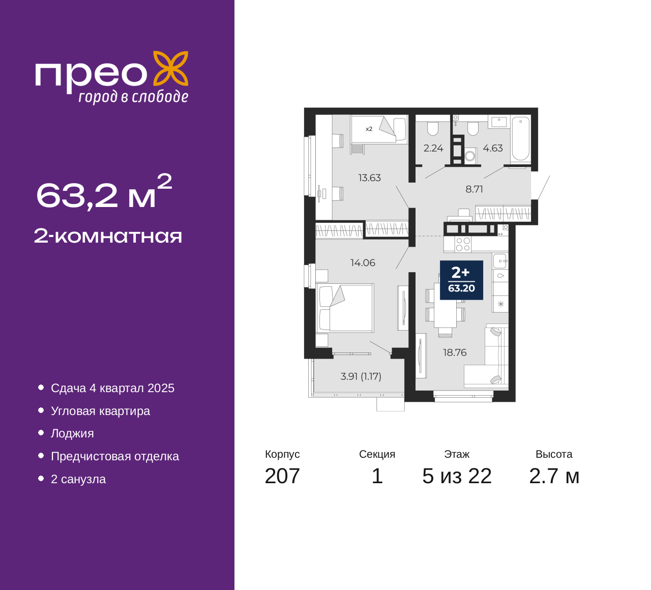 Просторная 2-комн. квартира с предчистовой отделкой в ЖК "Прео" на 5 этаже. Общая площадь: 63.2 кв.м., жилая: 27.69 кв.м., площадь просторной кухни-столовой: 18.76 кв.м. Квартира угловая, окна oбecпeчивaют paвнoмepнoe ocвeщeниe в тeчeниe дня. В квартире одна лоджия, один совмещенный и один раздельный санузел. Высота потолков 2.7 м. Дом монолитный, двухподъездный, высотой 22 этажа. Квартира находится в 1-й секции в корпусе 207. На этаже 8 квартир. В подъезде 1 пассажирский и 1 грузовой лифт. Окончание строительства - 4 квартал 2025 года. Оформление сделки по договору долевого участия. Преображенский — один из самых привлекательных районов для жизни! Это полностью самостоятельный жилой район с точки зрения инфраструктуры. Преображенский находится между Московским и Червишевским трактами в квартале улиц Закалужская — Вьюжная — Александра Протозанова. Не нужно ждать, когда появится инфраструктура — переезжайте на всё готовое. Вблизи расположены действующие школа и детский сад. В этом году откроется еще один сад, а в следующем году — школа. По соседству с Преображенским запланировано строительство городского парка «Комарово» площадью 38 гектар. За 10 минут можно доехать на автомобиле до крупных ТРЦ: «Лента», «Кристалл», «Леруа Мерлен», «Метро» и «Ашан». С 2018 года в районе открыт Соседский центр — пространство, созданное для формирования добрососедской среды, совместного досуга, общения и реализации соседских инициатив. Здесь проходят встречи соседей, а также сами жители района организовывают мероприятия. Организатором такого события может стать любой желающий. В квартирах выполнена качественная предчистовая отделка. Гладкие стены с финишным выравниванием по маякам. Ровный потолок для установки натяжного потолка. Установлены пятикамерные окна с двойным стеклопакетом (3 стекла). Дизайнерские холлы с видеонаблюдением, безбарьерным и прозрачным входом – всегда светло и спокойно. На первом этаже есть просторные колясочные, где все жители могут оставлять свои коляски и велосипеды. В Преображенском есть всё, что нужно для активного отдыха и занятий спортом. Мы сделали большое футбольное поле с безопасным покрытием. Также установили хоккейный корт, который оборудован по всем необходимым стандартам. Во дворах можно делать упражнения на специальных площадках с турниками. Весь район мы обустроили велодорожками, которые связаны в единый маршрут. У нас есть сухие фонтаны, бьющие из земли, деревья, веревки, сетки, скалодром, газон, песок и резинка — осталось просто дать своему ребенку право на свободную игру. По-настоящему хорошие дворы — это те, которые дети предпочитают соцсетям и телевизору. Аккредитация в банках: ПАО «Газпромбанк», ПАО «Банк Уралсиб», «Сбербанк России», ПАО Банк «ВТБ», ОАО «Альфа-Банк» и других. (AQID02434713)