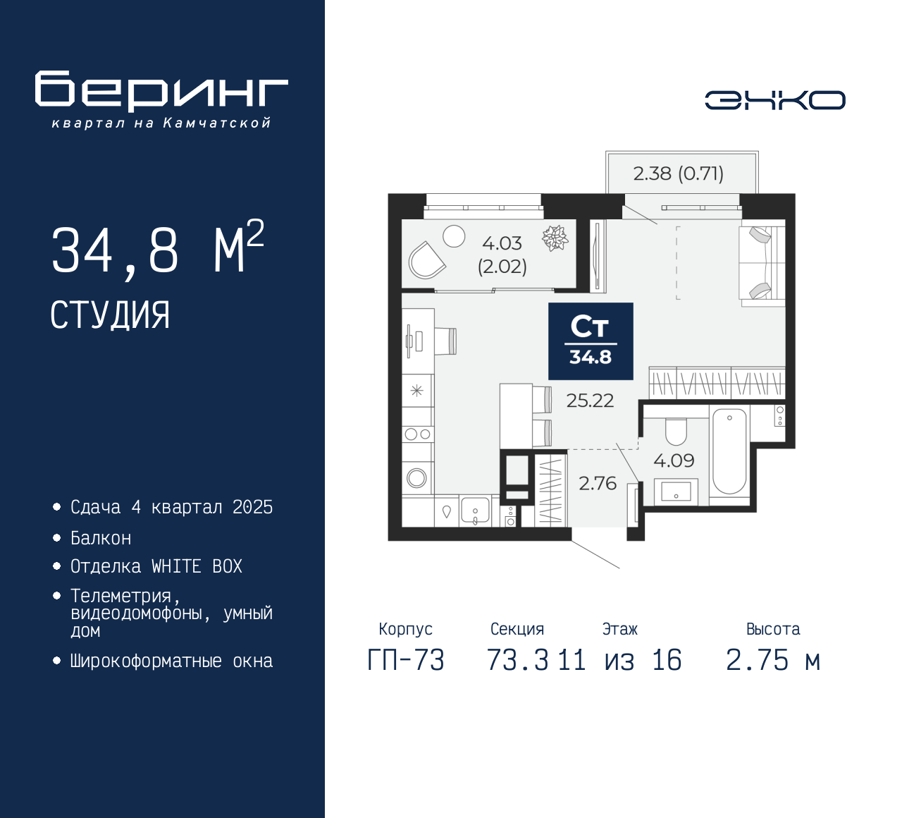 - Общая площадь 34.8 м²