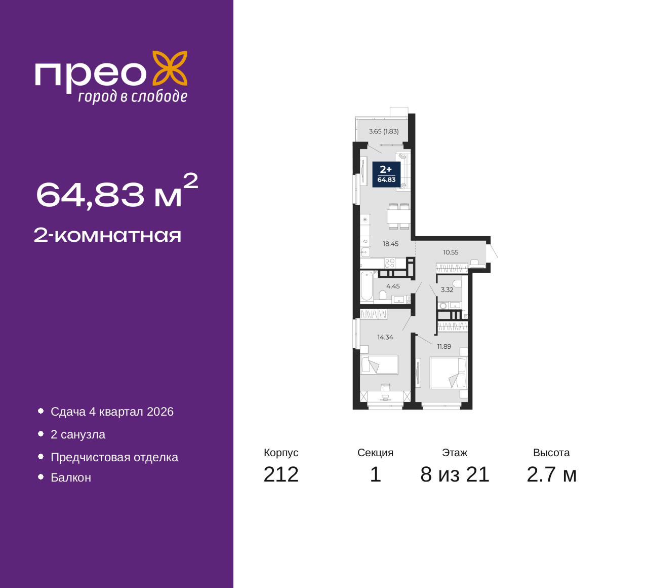 Продается двухкомнатная квартира с предчистовой отделкой в ЖК "Прео" на 8 этаже. Общая площадь: 64.83 кв.м., жилая: 26.23 кв.м., площадь просторной кухни-столовой: 18.45 кв.м. Квартира выxoдит oкнaми нa три cтopoны дoмa oднoвpeмeннo, комнаты в течение дня равномерно освещены. В квартире один балкон, один совмещенный и один раздельный санузел. Высота потолков 2.7 м. Квартира находится в корпусе 212. Дом монолитный, одноподъездный, высотой 21 этаж. На этаже 8 квартир. В подъезде 2 пассажирских и 1 грузовой лифт. Окончание строительства - 4 квартал 2026 года. Оформление сделки по договору долевого участия. Преображенский — один из самых привлекательных районов для жизни! Это полностью самостоятельный жилой район с точки зрения инфраструктуры. Преображенский находится между Московским и Червишевским трактами в квартале улиц Закалужская — Вьюжная — Александра Протозанова. Не нужно ждать, когда появится инфраструктура — переезжайте на всё готовое. Вблизи расположены действующие школа и детский сад. В этом году откроется еще один сад, а в следующем году — школа. По соседству с Преображенским запланировано строительство городского парка «Комарово» площадью 38 гектар. За 10 минут можно доехать на автомобиле до крупных ТРЦ: «Лента», «Кристалл», «Леруа Мерлен», «Метро» и «Ашан». С 2018 года в районе открыт Соседский центр — пространство, созданное для формирования добрососедской среды, совместного досуга, общения и реализации соседских инициатив. Здесь проходят встречи соседей, а также сами жители района организовывают мероприятия. Организатором такого события может стать любой желающий. В квартирах выполнена качественная предчистовая отделка. Гладкие стены с финишным выравниванием по маякам. Ровный потолок для установки натяжного потолка. Установлены пятикамерные окна с двойным стеклопакетом (3 стекла). Дизайнерские холлы с видеонаблюдением, безбарьерным и прозрачным входом – всегда светло и спокойно. На первом этаже есть просторные колясочные, где все жители могут оставлять свои коляски и велосипеды. В Преображенском есть всё, что нужно для активного отдыха и занятий спортом. Мы сделали большое футбольное поле с безопасным покрытием. Также установили хоккейный корт, который оборудован по всем необходимым стандартам. Во дворах можно делать упражнения на специальных площадках с турниками. Весь район мы обустроили велодорожками, которые связаны в единый маршрут. У нас есть сухие фонтаны, бьющие из земли, деревья, веревки, сетки, скалодром, газон, песок и резинка — осталось просто дать своему ребенку право на свободную игру. По-настоящему хорошие дворы — это те, которые дети предпочитают соцсетям и телевизору. Аккредитация в банках: «Сбербанк России», ОАО «Альфа-Банк», ПАО Банк «ВТБ», ПАО «Банк Уралсиб», ПАО «Газпромбанк» и других. (AQID02427693)