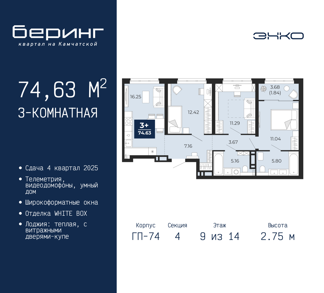 3-комн. квартира от застройщика в ЖК "Беринг" на 9 этаже. Квартира без отделки, после получения ключей можно делать ремонт. Общая площадь: 74.63 кв.м., жилая: 34.75 кв.м., площадь просторной кухни-столовой: 16.25 кв.м. Комнаты изолированные, все окна выходят на одну сторону. В квартире одна лоджия, два совмещенных санузла. Высота потолков 2.75 м. Дом монолитный, многоподъездный, переменной этажности, от 9 до 21 этажей. Квартира находится в 4-й секции высотой 14 этажей в корпусе ГП-74. На этаже 7 квартир. В подъезде 1 пассажирский и 1 грузовой лифт. Окончание строительства - 4 квартал 2025 года. Оформление сделки по договору долевого участия. Подобно знаменитому исследователю, мы чувствуем себя первооткрывателями этой локации. Хотим показать новую суть места, сформировать для вас жизненный опыт, которого ещё не было. Беринг — район зелёного цвета. Беринг — район, который откроется вам с другой стороны. Впечатлит новым уровнем комфорта и качеством жизни. Беринг — открытие на карте города. Первый квартал расположен в районе Тура, в границах улиц: Камчатская – Западносибирская – Энтузиастов. Вокруг уже есть всё для того, чтобы ежедневная рутина была лишь частью жизни и не доставляла дискомфорта. Школы и детские сады, магазины и аптеки, поликлиника, места для семейного отдыха, пеших и велопрогулок, и даже рыбалки. Масштабное озеленение дворов — визитная карточка ЭНКО и ваш оазис спокойствия, чтобы отвлечься от повседневности. Раскидистые деревья, кустарники, травы и цветы — осталось остановиться, вдохнуть и расслабиться, глядя на эту природную красоту. Стилистика подъездов продолжает концепцию Беринга, вдохновлённого Камчаткой: сдержанный, но при этом впечатляющий дизайн соседствует с удобством и функциональностью. (AQID02432103)
