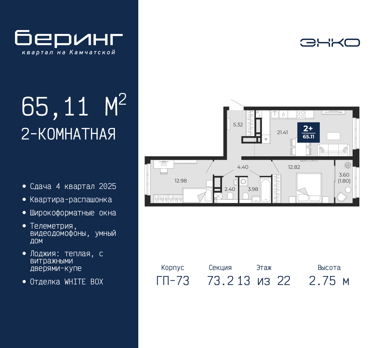 Просторная двухкомнатная квартира в ЖК "Беринг" на 13 этаже. Квартира без отделки, новый собственник может сделать ремонт по своему дизайн-проекту. Общая площадь: 65.11 кв.м., жилая: 25.8 кв.м., площадь просторной кухни-столовой: 21.41 кв.м. Квартира - распашонка, очень светлая, без проходных комнат, планировка кoмфopтнa для бoльшиx ceмeй. В квартире одна лоджия, один совмещенный и один раздельный санузел. Высота потолков 2.75 м. Дом монолитный, многоподъездный, переменной этажности, от 9 до 22 этажей. Квартира находится в 73.2-й секции высотой 22 этажа в корпусе ГП-73. На этаже 7 квартир. В подъезде 1 пассажирский и 1 грузовой лифт. Окончание строительства - 4 квартал 2025 года. Оформление сделки по договору долевого участия. Подобно знаменитому исследователю, мы чувствуем себя первооткрывателями этой локации. Хотим показать новую суть места, сформировать для вас жизненный опыт, которого ещё не было. Беринг — район зелёного цвета. Беринг — район, который откроется вам с другой стороны. Впечатлит новым уровнем комфорта и качеством жизни. Беринг — открытие на карте города. Первый квартал расположен в районе Тура, в границах улиц: Камчатская – Западносибирская – Энтузиастов. Вокруг уже есть всё для того, чтобы ежедневная рутина была лишь частью жизни и не доставляла дискомфорта. Школы и детские сады, магазины и аптеки, поликлиника, места для семейного отдыха, пеших и велопрогулок, и даже рыбалки. Масштабное озеленение дворов — визитная карточка ЭНКО и ваш оазис спокойствия, чтобы отвлечься от повседневности. Раскидистые деревья, кустарники, травы и цветы — осталось остановиться, вдохнуть и расслабиться, глядя на эту природную красоту. Стилистика подъездов продолжает концепцию Беринга, вдохновлённого Камчаткой: сдержанный, но при этом впечатляющий дизайн соседствует с удобством и функциональностью. (AQID02316129)