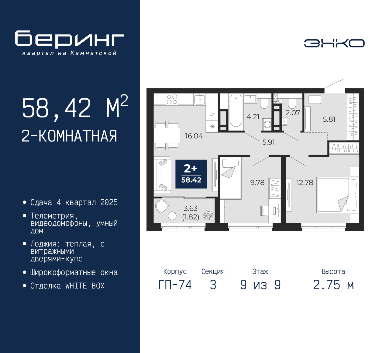 Двухкомнатная квартира в ЖК "Беринг" на 9 этаже. Квартира без отделки, полностью готова к чистовой отделке и дальнейшему ремонту. Общая площадь: 58.42 кв.м., жилая: 22.56 кв.м., площадь просторной кухни-столовой: 16.04 кв.м. Комнаты изолированные, все окна выходят на одну сторону. В квартире одна лоджия, один совмещенный и один раздельный санузел. Высота потолков 2.75 м. Дом монолитный, многоподъездный, переменной этажности, от 9 до 21 этажей. Квартира находится в 3-й секции высотой 9 этажей в корпусе ГП-74. На этаже 7 квартир. В подъезде 1 грузовой лифт. Окончание строительства - 4 квартал 2025 года. Оформление сделки по договору долевого участия. Подобно знаменитому исследователю, мы чувствуем себя первооткрывателями этой локации. Хотим показать новую суть места, сформировать для вас жизненный опыт, которого ещё не было. Беринг — район зелёного цвета. Беринг — район, который откроется вам с другой стороны. Впечатлит новым уровнем комфорта и качеством жизни. Беринг — открытие на карте города. Первый квартал расположен в районе Тура, в границах улиц: Камчатская – Западносибирская – Энтузиастов. Вокруг уже есть всё для того, чтобы ежедневная рутина была лишь частью жизни и не доставляла дискомфорта. Школы и детские сады, магазины и аптеки, поликлиника, места для семейного отдыха, пеших и велопрогулок, и даже рыбалки. Масштабное озеленение дворов — визитная карточка ЭНКО и ваш оазис спокойствия, чтобы отвлечься от повседневности. Раскидистые деревья, кустарники, травы и цветы — осталось остановиться, вдохнуть и расслабиться, глядя на эту природную красоту. Стилистика подъездов продолжает концепцию Беринга, вдохновлённого Камчаткой: сдержанный, но при этом впечатляющий дизайн соседствует с удобством и функциональностью. (AQID02316164)