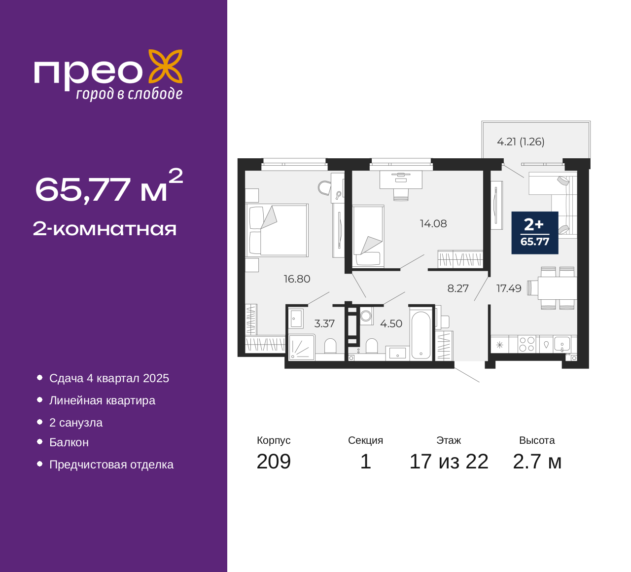 Продается двухкомнатная квартира с предчистовой отделкой в ЖК "Прео" на 17 этаже. Общая площадь: 65.77 кв.м., жилая: 30.88 кв.м., площадь просторной кухни-столовой: 17.49 кв.м. Комнаты изолированные, все окна выходят на одну сторону. В квартире один балкон, два совмещенных санузла. Высота потолков 2.7 м. Квартира находится в корпусе 209. Дом монолитный, одноподъездный, высотой 22 этажа. На этаже 8 квартир. В подъезде 1 пассажирский и 1 грузовой лифт. Окончание строительства - 4 квартал 2025 года. Оформление сделки по договору долевого участия. Преображенский — один из самых привлекательных районов для жизни! Это полностью самостоятельный жилой район с точки зрения инфраструктуры. Преображенский находится между Московским и Червишевским трактами в квартале улиц Закалужская — Вьюжная — Александра Протозанова. Не нужно ждать, когда появится инфраструктура — переезжайте на всё готовое. Вблизи расположены действующие школа и детский сад. В этом году откроется еще один сад, а в следующем году — школа. По соседству с Преображенским запланировано строительство городского парка «Комарово» площадью 38 гектар. За 10 минут можно доехать на автомобиле до крупных ТРЦ: «Лента», «Кристалл», «Леруа Мерлен», «Метро» и «Ашан». С 2018 года в районе открыт Соседский центр — пространство, созданное для формирования добрососедской среды, совместного досуга, общения и реализации соседских инициатив. Здесь проходят встречи соседей, а также сами жители района организовывают мероприятия. Организатором такого события может стать любой желающий. В квартирах выполнена качественная предчистовая отделка. Гладкие стены с финишным выравниванием по маякам. Ровный потолок для установки натяжного потолка. Установлены пятикамерные окна с двойным стеклопакетом (3 стекла). Дизайнерские холлы с видеонаблюдением, безбарьерным и прозрачным входом – всегда светло и спокойно. На первом этаже есть просторные колясочные, где все жители могут оставлять свои коляски и велосипеды. В Преображенском есть всё, что нужно для активного отдыха и занятий спортом. Мы сделали большое футбольное поле с безопасным покрытием. Также установили хоккейный корт, который оборудован по всем необходимым стандартам. Во дворах можно делать упражнения на специальных площадках с турниками. Весь район мы обустроили велодорожками, которые связаны в единый маршрут. У нас есть сухие фонтаны, бьющие из земли, деревья, веревки, сетки, скалодром, газон, песок и резинка — осталось просто дать своему ребенку право на свободную игру. По-настоящему хорошие дворы — это те, которые дети предпочитают соцсетям и телевизору. Аккредитация в банках: ПАО Банк «ВТБ», ПАО «Газпромбанк», ОАО «Альфа-Банк», ПАО «Банк Уралсиб», «Сбербанк России» и других. (AQID02355980)