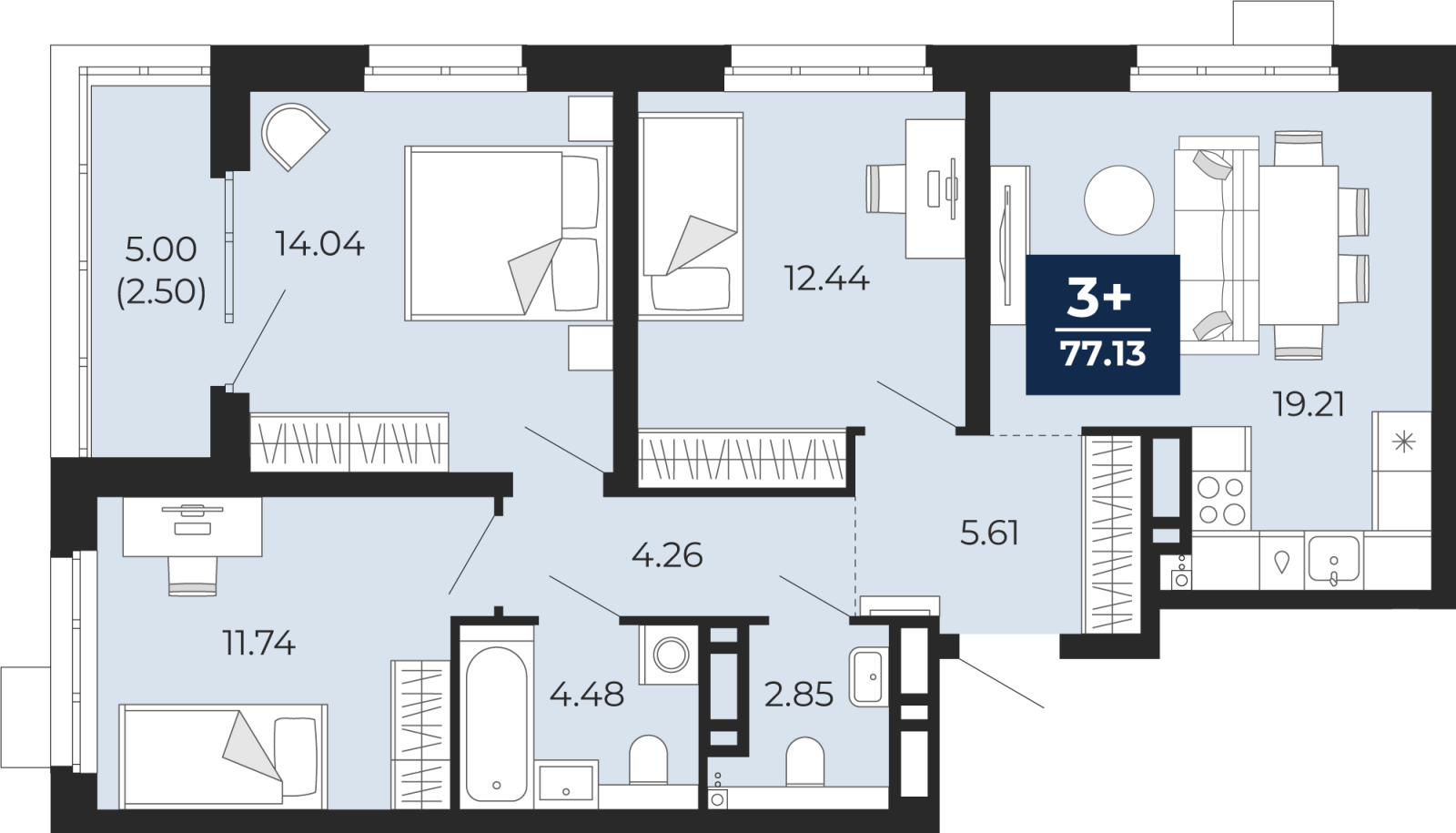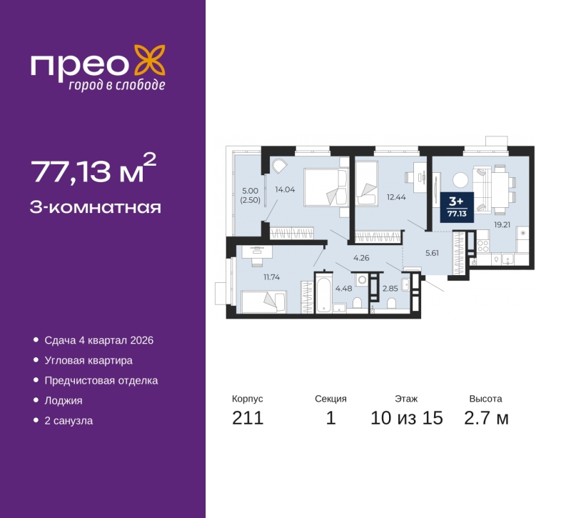 3-комн. квартира от застройщика с предчистовой отделкой в ЖК "Прео" на 10 этаже. Общая площадь: 77.13 кв.м., жилая: 38.22 кв.м., площадь просторной кухни-столовой: 19.21 кв.м. Квартира угловая, идеально подойдет любителям тишины и панорамных видов. В квартире одна лоджия, один совмещенный и один раздельный санузел. Высота потолков 2.7 м. Дом монолитный, черырехподъездный, переменной этажности, от 14 до 21 этажей. Квартира находится в 1-й секции высотой 21 этаж в корпусе 211. На этаже 8 квартир. В подъезде 1 пассажирский и 1 грузовой лифт. Окончание строительства - 4 квартал 2026 года. Оформление сделки по договору долевого участия. Преображенский — один из самых привлекательных районов для жизни! Это полностью самостоятельный жилой район с точки зрения инфраструктуры. Преображенский находится между Московским и Червишевским трактами в квартале улиц Закалужская — Вьюжная — Александра Протозанова. Не нужно ждать, когда появится инфраструктура — переезжайте на всё готовое. Вблизи расположены действующие школа и детский сад. В этом году откроется еще один сад, а в следующем году — школа. По соседству с Преображенским запланировано строительство городского парка «Комарово» площадью 38 гектар. За 10 минут можно доехать на автомобиле до крупных ТРЦ: «Лента», «Кристалл», «Леруа Мерлен», «Метро» и «Ашан». С 2018 года в районе открыт Соседский центр — пространство, созданное для формирования добрососедской среды, совместного досуга, общения и реализации соседских инициатив. Здесь проходят встречи соседей, а также сами жители района организовывают мероприятия. Организатором такого события может стать любой желающий. В квартирах выполнена качественная предчистовая отделка. Гладкие стены с финишным выравниванием по маякам. Ровный потолок для установки натяжного потолка. Установлены пятикамерные окна с двойным стеклопакетом (3 стекла). Дизайнерские холлы с видеонаблюдением, безбарьерным и прозрачным входом – всегда светло и спокойно. На первом этаже есть просторные колясочные, где все жители могут оставлять свои коляски и велосипеды. В Преображенском есть всё, что нужно для активного отдыха и занятий спортом. Мы сделали большое футбольное поле с безопасным покрытием. Также установили хоккейный корт, который оборудован по всем необходимым стандартам. Во дворах можно делать упражнения на специальных площадках с турниками. Весь район мы обустроили велодорожками, которые связаны в единый маршрут. У нас есть сухие фонтаны, бьющие из земли, деревья, веревки, сетки, скалодром, газон, песок и резинка — осталось просто дать своему ребенку право на свободную игру. По-настоящему хорошие дворы — это те, которые дети предпочитают соцсетям и телевизору. Аккредитация в банках: ПАО «Газпромбанк», ПАО «Банк Уралсиб», ПАО Банк «ВТБ», ОАО «Альфа-Банк», «Сбербанк России» и других. (AQID02427730)