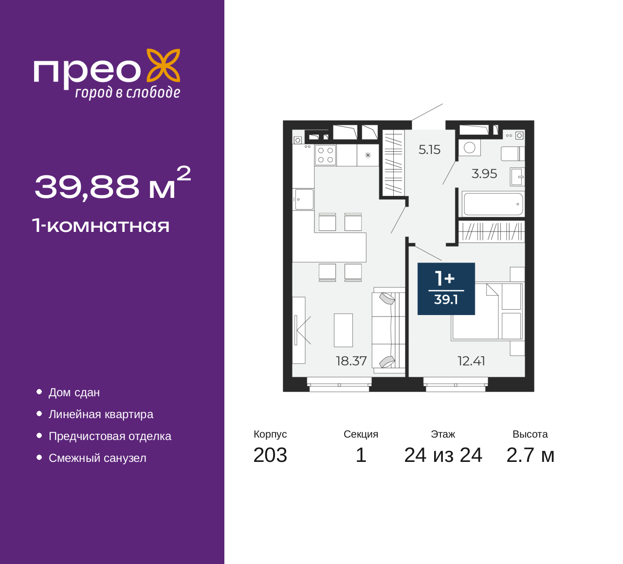 Однокомнатная квартира с предчистовой отделкой в ЖК "Прео" на 24 этаже. Общая площадь: 39.88 кв.м., жилая: 12.41 кв.м., площадь просторной кухни-столовой: 18.37 кв.м. Все окна выходят на одну сторону. В квартире один совмещенный санузел. Высота потолков 2.7 м. Квартира находится в корпусе 203. Дом монолитный, одноподъездный, высотой 24 этажа. На этаже 14 квартир. В подъезде 2 грузовых лифта. На сегодняшний день строительство окончено, дом сдан в 4 квартале 2024 года. Оформление сделки по договору купли-продажи. Преображенский — один из самых привлекательных районов для жизни! Это полностью самостоятельный жилой район с точки зрения инфраструктуры. Преображенский находится между Московским и Червишевским трактами в квартале улиц Закалужская — Вьюжная — Александра Протозанова. Не нужно ждать, когда появится инфраструктура — переезжайте на всё готовое. Вблизи расположены действующие школа и детский сад. В этом году откроется еще один сад, а в следующем году — школа. По соседству с Преображенским запланировано строительство городского парка «Комарово» площадью 38 гектар. За 10 минут можно доехать на автомобиле до крупных ТРЦ: «Лента», «Кристалл», «Леруа Мерлен», «Метро» и «Ашан». С 2018 года в районе открыт Соседский центр — пространство, созданное для формирования добрососедской среды, совместного досуга, общения и реализации соседских инициатив. Здесь проходят встречи соседей, а также сами жители района организовывают мероприятия. Организатором такого события может стать любой желающий. В квартирах выполнена качественная предчистовая отделка. Гладкие стены с финишным выравниванием по маякам. Ровный потолок для установки натяжного потолка. Установлены пятикамерные окна с двойным стеклопакетом (3 стекла). Дизайнерские холлы с видеонаблюдением, безбарьерным и прозрачным входом – всегда светло и спокойно. На первом этаже есть просторные колясочные, где все жители могут оставлять свои коляски и велосипеды. В Преображенском есть всё, что нужно для активного отдыха и занятий спортом. Мы сделали большое футбольное поле с безопасным покрытием. Также установили хоккейный корт, который оборудован по всем необходимым стандартам. Во дворах можно делать упражнения на специальных площадках с турниками. Весь район мы обустроили велодорожками, которые связаны в единый маршрут. У нас есть сухие фонтаны, бьющие из земли, деревья, веревки, сетки, скалодром, газон, песок и резинка — осталось просто дать своему ребенку право на свободную игру. По-настоящему хорошие дворы — это те, которые дети предпочитают соцсетям и телевизору. Аккредитация в банках: «Сбербанк России», ОАО «Альфа-Банк», ПАО Банк «ВТБ», ПАО «Газпромбанк», ПАО «Банк Уралсиб» и других. (AQID02278457)