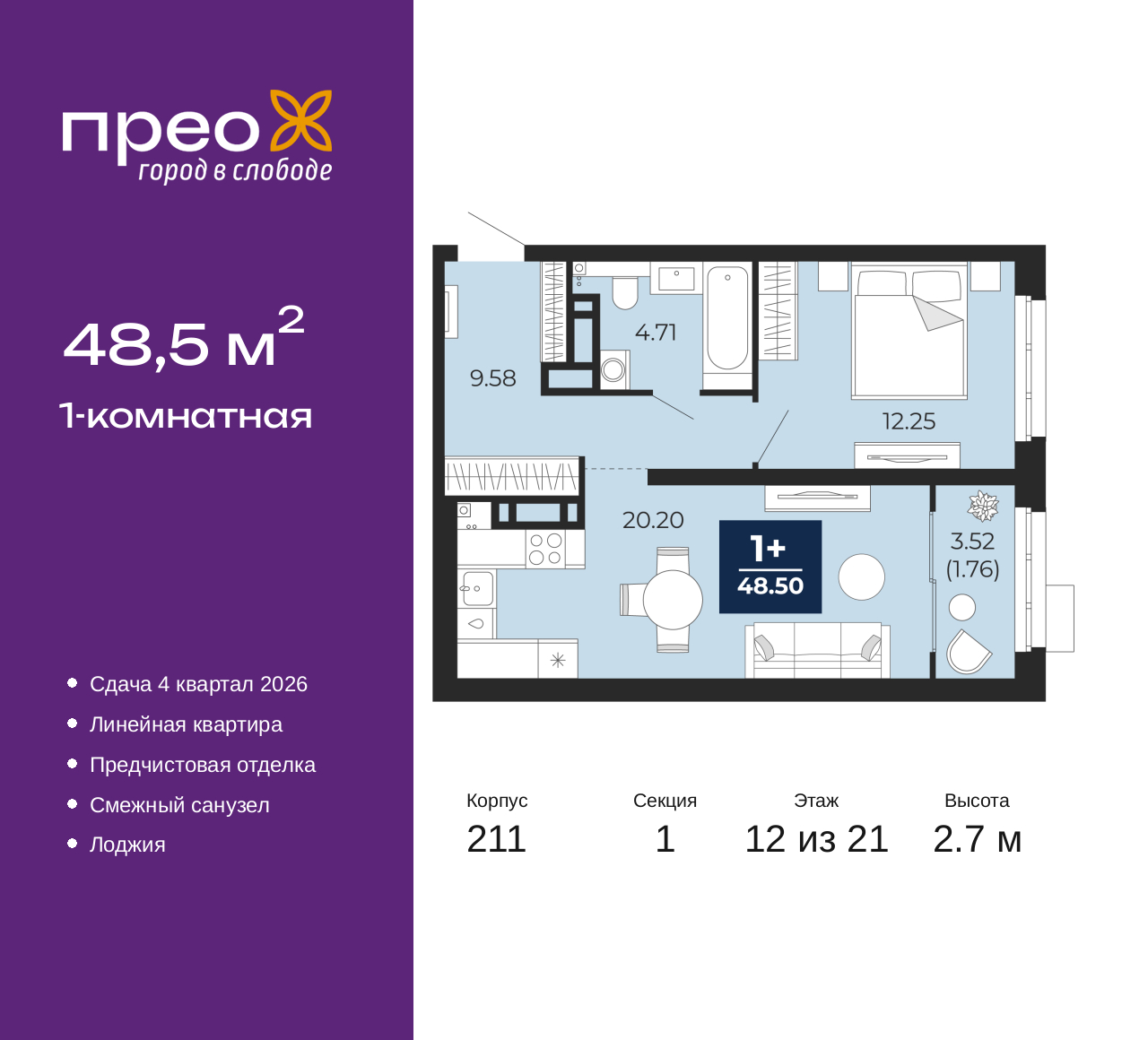Продается 1-комн. квартира с предчистовой отделкой в ЖК "Прео" на 12 этаже. Общая площадь: 48.5 кв.м., жилая: 12.25 кв.м., площадь просторной кухни-столовой: 20.2 кв.м. Все окна выходят на одну сторону. В квартире одна лоджия, один совмещенный санузел. Высота потолков 2.7 м. Дом монолитный, черырехподъездный, переменной этажности, от 14 до 21 этажей. Квартира находится в 1-й секции высотой 21 этаж в корпусе 211. На этаже 8 квартир. В подъезде 1 пассажирский и 1 грузовой лифт. Окончание строительства - 4 квартал 2026 года. Оформление сделки по договору долевого участия. Преображенский — один из самых привлекательных районов для жизни! Это полностью самостоятельный жилой район с точки зрения инфраструктуры. Преображенский находится между Московским и Червишевским трактами в квартале улиц Закалужская — Вьюжная — Александра Протозанова. Не нужно ждать, когда появится инфраструктура — переезжайте на всё готовое. Вблизи расположены действующие школа и детский сад. В этом году откроется еще один сад, а в следующем году — школа. По соседству с Преображенским запланировано строительство городского парка «Комарово» площадью 38 гектар. За 10 минут можно доехать на автомобиле до крупных ТРЦ: «Лента», «Кристалл», «Леруа Мерлен», «Метро» и «Ашан». С 2018 года в районе открыт Соседский центр — пространство, созданное для формирования добрососедской среды, совместного досуга, общения и реализации соседских инициатив. Здесь проходят встречи соседей, а также сами жители района организовывают мероприятия. Организатором такого события может стать любой желающий. В квартирах выполнена качественная предчистовая отделка. Гладкие стены с финишным выравниванием по маякам. Ровный потолок для установки натяжного потолка. Установлены пятикамерные окна с двойным стеклопакетом (3 стекла). Дизайнерские холлы с видеонаблюдением, безбарьерным и прозрачным входом – всегда светло и спокойно. На первом этаже есть просторные колясочные, где все жители могут оставлять свои коляски и велосипеды. В Преображенском есть всё, что нужно для активного отдыха и занятий спортом. Мы сделали большое футбольное поле с безопасным покрытием. Также установили хоккейный корт, который оборудован по всем необходимым стандартам. Во дворах можно делать упражнения на специальных площадках с турниками. Весь район мы обустроили велодорожками, которые связаны в единый маршрут. У нас есть сухие фонтаны, бьющие из земли, деревья, веревки, сетки, скалодром, газон, песок и резинка — осталось просто дать своему ребенку право на свободную игру. По-настоящему хорошие дворы — это те, которые дети предпочитают соцсетям и телевизору. Аккредитация в банках: ПАО Банк «ВТБ», «Сбербанк России», ПАО «Газпромбанк», ОАО «Альфа-Банк», ПАО «Банк Уралсиб» и других. (AQID02427587)