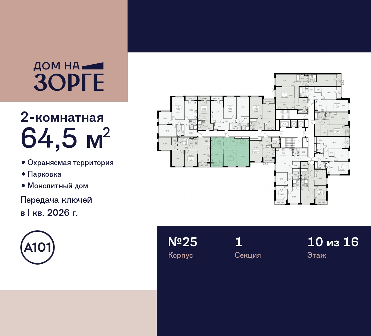 Торопитесь забронировать по акционной цене! Предложение ограничено! Стоимость квартиры указана со скидкой, ваша экономия составит 6,585,450 RUB. По всем вопросам звоните в офис продаж, мы вам все подробно расскажем! Продается двухкомнатная квартира с предчистовой отделкой в ЖК "Дом на Зорге" на 10 этаже. Общая площадь: 64.5 кв.м., жилая: 29.4 кв.м., площадь просторной кухни-столовой: 13.6 кв.м. Комнаты изолированные, все окна выходят на одну сторону. В квартире одна лоджия, два совмещенных санузла. Высота потолков 3.1 м. Имеется ниша под гардероб. Дом монолитный, двухподъездный, высотой 16 этажей. Квартира находится в 1-й секции в корпусе 25. На этаже 13 квартир. В подъезде 2 пассажирских и 1 грузовой лифт. Начало строительства - 2 квартал 2023 года. Окончание строительства - 1 квартал 2026 года. Оформление сделки по договору долевого участия. Артикул квартиры по базе застройщика 25К-25-112. В шаговой доступности от дома имеются станции метро (расстояние по прямой): «Зорге» (500 м), «Октябрьское поле» (800 м), «Панфиловская» (900 м), «Сокол» (1.6 км), «Хорошево» (1.6 км). ПРЕДЛОЖЕНИЯ ОТ ЗАСТРОЙЩИКА В ОКТЯБРЕ 2025: Ипотека от 13,9 % для всех! На весь срок. "Семейная ипотека" вернулась. Ставка от 3,5 % на весь срок! Без удорожания! Выгодное ипотечное комбо: Ипотека от 2200 р./мес. и от 6 % после рождения ребёнка! Ипотека для всех "Держи пять!" - ставка 5 % на 2 года! *более подробную информацию по скидкам и акциям уточняйте в отделе продаж "Дом на Зорге"» бизнес-класса возводится в престижном районе «Сокол» с исторической «сталинской» застройкой и статусными жилыми комплексами на границе с Хорошёвским районом Северо-Западного АО. До действующей станции метро (и МЦК) «Зорге» всего 350 метров. «Дом на Зорге» отличается элегантным и статусным внешним видом – идеально соответствует «дресс-коду» исторического окружения и в тоже время обращает на себя внимание. Вентилируемые фасады облицованы фиброцементными и керамогранитными панелями, которые повторяют фактуру натурального камня и бетона. Кондиционеры скроют корзины и стильные блоки, расположенные в декоративных элементах фасада. Мягкая архитектурно-художественная подсветка подчеркнёт благородный экстерьер дома. Сформированная инфраструктура района предоставит жителям богатый выбор мест для отдыха, шопинга и занятий спортом. На первом этаже «Дома на Зорге» откроются уютные магазины, атмосферные кафе и салоны красоты с отличным сервисом. Здесь предусмотрено всё для удобства, позитивного настроения и безопасности жителей. В закрытый двор не войдут посторонние. Автомобили останутся за периметром или в подземном паркинге. Две 16-этажных секции дома соединит лобби с дизайнерской отделкой. Оно станет стильным общественным пространством и главным входом для жителей, также ведущим в скрытый от посторонних глаз приватный внутренний двор. Всего в локации – более четырёх десятков разнообразных учебных учреждений для детей, включая легендарную «Курчатовскую школу». В шаговой доступности находятся корпуса школы № 1251 имени генерала Шарля де Голля – с дошкольным отделением. На территории дома будут благоустроены общий и приватный (доступный только жителям) дворы. Дизайн каждой функциональной зоны уникален, а вместе они подчёркивают благородный архитектурный стиль здания. В основе цветовых решений – «отражение» фасадов, мягкие природные оттенки. (