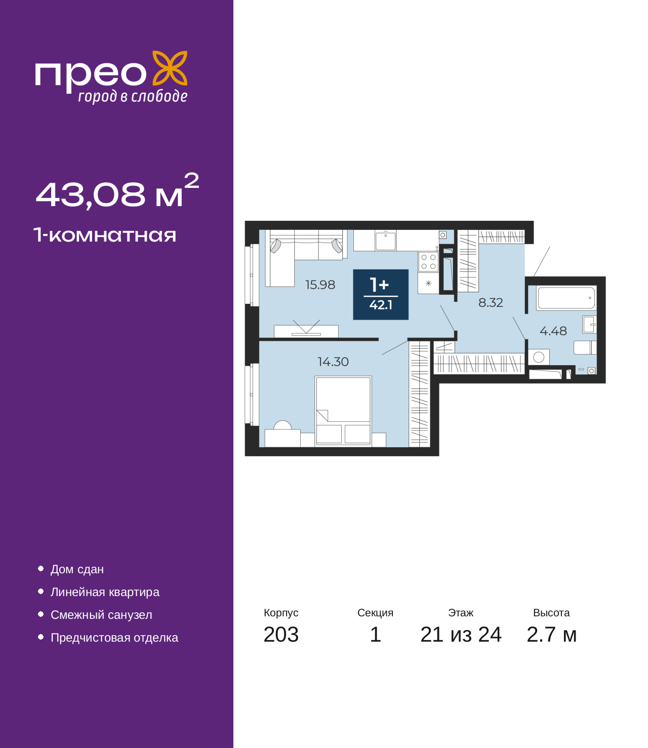 - Общая площадь 43.08 м²