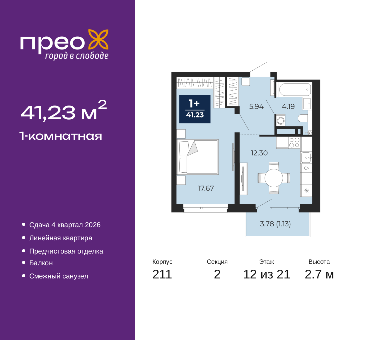 1-комн. квартира от застройщика с предчистовой отделкой в ЖК "Прео" на 12 этаже. Общая площадь: 41.23 кв.м., жилая: 17.67 кв.м., площадь просторной кухни-столовой: 12.3 кв.м. Все окна выходят на одну сторону. В квартире один балкон, один совмещенный санузел. Высота потолков 2.7 м. Дом монолитный, черырехподъездный, переменной этажности, от 14 до 21 этажей. Квартира находится во 2-й секции высотой 21 этаж в корпусе 211. На этаже 10 квартир. В подъезде 1 пассажирский и 1 грузовой лифт. Окончание строительства - 4 квартал 2026 года. Оформление сделки по договору долевого участия. Преображенский — один из самых привлекательных районов для жизни! Это полностью самостоятельный жилой район с точки зрения инфраструктуры. Преображенский находится между Московским и Червишевским трактами в квартале улиц Закалужская — Вьюжная — Александра Протозанова. Не нужно ждать, когда появится инфраструктура — переезжайте на всё готовое. Вблизи расположены действующие школа и детский сад. В этом году откроется еще один сад, а в следующем году — школа. По соседству с Преображенским запланировано строительство городского парка «Комарово» площадью 38 гектар. За 10 минут можно доехать на автомобиле до крупных ТРЦ: «Лента», «Кристалл», «Леруа Мерлен», «Метро» и «Ашан». С 2018 года в районе открыт Соседский центр — пространство, созданное для формирования добрососедской среды, совместного досуга, общения и реализации соседских инициатив. Здесь проходят встречи соседей, а также сами жители района организовывают мероприятия. Организатором такого события может стать любой желающий. В квартирах выполнена качественная предчистовая отделка. Гладкие стены с финишным выравниванием по маякам. Ровный потолок для установки натяжного потолка. Установлены пятикамерные окна с двойным стеклопакетом (3 стекла). Дизайнерские холлы с видеонаблюдением, безбарьерным и прозрачным входом – всегда светло и спокойно. На первом этаже есть просторные колясочные, где все жители могут оставлять свои коляски и велосипеды. В Преображенском есть всё, что нужно для активного отдыха и занятий спортом. Мы сделали большое футбольное поле с безопасным покрытием. Также установили хоккейный корт, который оборудован по всем необходимым стандартам. Во дворах можно делать упражнения на специальных площадках с турниками. Весь район мы обустроили велодорожками, которые связаны в единый маршрут. У нас есть сухие фонтаны, бьющие из земли, деревья, веревки, сетки, скалодром, газон, песок и резинка — осталось просто дать своему ребенку право на свободную игру. По-настоящему хорошие дворы — это те, которые дети предпочитают соцсетям и телевизору. Аккредитация в банках: ПАО «Газпромбанк», ОАО «Альфа-Банк», ПАО Банк «ВТБ», «Сбербанк России», ПАО «Банк Уралсиб» и других. (AQID02427507)