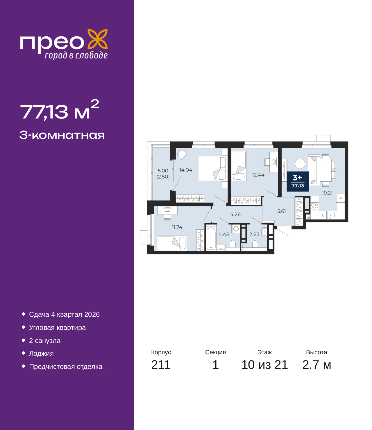 Трехкомнатная квартира с предчистовой отделкой в ЖК "Прео" на 10 этаже. Общая площадь: 77.13 кв.м., жилая: 38.22 кв.м., площадь просторной кухни-столовой: 19.21 кв.м. Квартира угловая, очень светлая, естественная вентиляция при открытии окон. В квартире одна лоджия, один совмещенный и один раздельный санузел. Высота потолков 2.7 м. Дом монолитный, черырехподъездный, переменной этажности, от 14 до 21 этажей. Квартира находится в 1-й секции высотой 21 этаж в корпусе 211. На этаже 8 квартир. В подъезде 1 пассажирский и 1 грузовой лифт. Окончание строительства - 4 квартал 2026 года. Оформление сделки по договору долевого участия. Преображенский — один из самых привлекательных районов для жизни! Это полностью самостоятельный жилой район с точки зрения инфраструктуры. Преображенский находится между Московским и Червишевским трактами в квартале улиц Закалужская — Вьюжная — Александра Протозанова. Не нужно ждать, когда появится инфраструктура — переезжайте на всё готовое. Вблизи расположены действующие школа и детский сад. В этом году откроется еще один сад, а в следующем году — школа. По соседству с Преображенским запланировано строительство городского парка «Комарово» площадью 38 гектар. За 10 минут можно доехать на автомобиле до крупных ТРЦ: «Лента», «Кристалл», «Леруа Мерлен», «Метро» и «Ашан». С 2018 года в районе открыт Соседский центр — пространство, созданное для формирования добрососедской среды, совместного досуга, общения и реализации соседских инициатив. Здесь проходят встречи соседей, а также сами жители района организовывают мероприятия. Организатором такого события может стать любой желающий. В квартирах выполнена качественная предчистовая отделка. Гладкие стены с финишным выравниванием по маякам. Ровный потолок для установки натяжного потолка. Установлены пятикамерные окна с двойным стеклопакетом (3 стекла). Дизайнерские холлы с видеонаблюдением, безбарьерным и прозрачным входом – всегда светло и спокойно. На первом этаже есть просторные колясочные, где все жители могут оставлять свои коляски и велосипеды. В Преображенском есть всё, что нужно для активного отдыха и занятий спортом. Мы сделали большое футбольное поле с безопасным покрытием. Также установили хоккейный корт, который оборудован по всем необходимым стандартам. Во дворах можно делать упражнения на специальных площадках с турниками. Весь район мы обустроили велодорожками, которые связаны в единый маршрут. У нас есть сухие фонтаны, бьющие из земли, деревья, веревки, сетки, скалодром, газон, песок и резинка — осталось просто дать своему ребенку право на свободную игру. По-настоящему хорошие дворы — это те, которые дети предпочитают соцсетям и телевизору. Аккредитация в банках: «Сбербанк России», ПАО «Банк Уралсиб», ПАО «Газпромбанк», ОАО «Альфа-Банк», ПАО Банк «ВТБ» и других. (AQID02427730)