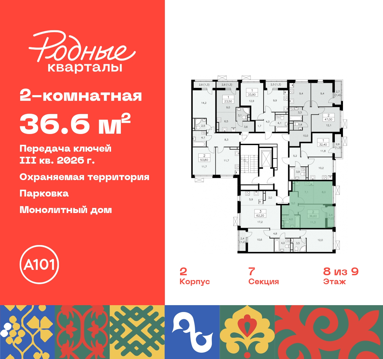 Продается 2-комн. квартира с европланировкой от застройщика в ЖК "Родные кварталы" на 8 этаже. Квартира без отделки, новый собственник может сделать ремонт по индивидуальному дизайн-проекту. Общая площадь: 36.6 кв.м., жилая: 19.3 кв.м., общая площадь гостиной-столовой с кухонной зоной: 15.1 кв.м. Европланировка, за счет большой площади кухни-гостиной квартира выглядит просторной и очень удобна для жизни. Комнаты изолированные, все окна выходят на одну сторону. В квартире одна лоджия, один совмещенный санузел. Высота потолков 2.9 м. Имеется ниша под гардероб. Дом монолитный, многоподъездный, высотой 9 этажей. Квартира находится в 7-й секции в корпусе 2. На этаже 7 квартир. В подъезде 1 грузовой лифт. Начало строительства - 4 квартал 2023 года. Окончание строительства - 3 квартал 2026 года. Оформление сделки по договору долевого участия. Артикул квартиры по базе застройщика 96К-2-328. ПРЕДЛОЖЕНИЯ ОТ ЗАСТРОЙЩИКА В ОКТЯБРЕ 2025: Ипотека от 13,9 % для всех! На весь срок. "Семейная ипотека" вернулась. Ставка от 3,5 % на весь срок! Без удорожания! Выгодное ипотечное комбо: Ипотека от 2200 р./мес. и от 6 % после рождения ребёнка! Ипотека для всех "Держи пять!" - ставка 5 % на 2 года! *более подробную информацию по скидкам и акциям уточняйте в отделе продаж Новый жилой комплекс "Родные кварталы" строится в уютной, экологически благополучной локации на юго-западе столицы. В ближайшем окружении – ухоженные малоэтажные посёлки и живописный Ульяновский лесопарк. Благодаря этому из окон откроются вдохновляющие виды, которые не исчезнут со временем за фасадами многоэтажек. Через весь район пройдёт главный бульвар, который свяжет набережную, жилые кварталы и площади в единое дружелюбное пространство, органично наполненное узнаваемыми элементами культурных традиций разных народов. В жилом комплексе создаются условия для комфортного отдыха и занятий спортом всех жителей. Здесь можно прогуляться и отдохнуть в лесопарке на берегу ручья, позаниматься на тренажёрах под открытым небом и спортивных площадках. Для малышей построят игровые комплексы, развивающие силу, координацию и ловкость. Всего в жилом комплексе будет оборудовано 6 га территории для спокойного отдыха и около 9 га — для активного. Подъезды в домах освещены в любое время суток, входы и вестибюль хорошо просматриваются с улицы. Витражное остекление обеспечивает приток естественного света днём, а вечером зажигаются светильники. В отделке домов используется сочетание вентилируемого фасада с облицовкой из фибробетонной плитки и штукатуркой. Комфортная высота домов соразмерна человеку и в среднем составляет 10 этажей. Все дома обеспечены собственными подземными паркингами. В них размещаются машино-места и кладовые. В паркинг или кладовую можно спуститься на лифте или по лестнице. В комплексе появятся бытовые сервисы, магазины, аптеки и другие торгово-бытовые объекты. В жилом районе «Родные кварталы» будут построены: - образовательный центр: школа на 1300 учеников и детский сад на 250 малышей, - два детских сада на 200 мест каждый (один из них сдаётся в 1-й очереди). В транспортной доступности уже работают: - школа № 41 и детский сад — по Боровскому шоссе, - школа № 2057 и детский сад — на запад от района, в дер. Марушкино. ЖК «Родные кварталы» строится в Новомосковском округе столицы, в 15 минутах на автомобиле от аэропорта «Внуково». Райо