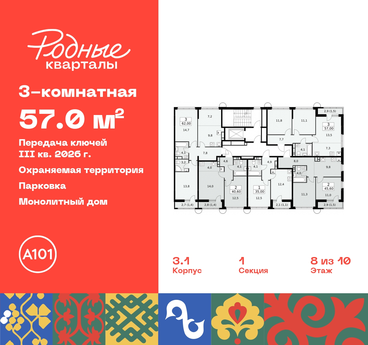 3-комн. квартира с европланировкой от застройщика в ЖК "Родные кварталы" на 8 этаже. Квартира без отделки, после получения ключей можно делать ремонт. Общая площадь: 57 кв.м., жилая: 36.4 кв.м., суммарная площадь гостиной-столовой с кухонной зоной: 20.8 кв.м. Европланировка, зона гостиной комнаты объединена с кухней. Квартира угловая, идеально подойдет любителям тишины и панорамных видов. В квартире одна лоджия, один совмещенный санузел. Высота потолков 2.95 м. Имеется ниша под гардероб. Дом монолитный, черырехподъездный, высотой 10 этажей. Квартира находится в 1-й секции в корпусе 3.1. На этаже 5 квартир. В подъезде 1 грузовой лифт. Начало строительства - 2 квартал 2024 года. Окончание строительства - 3 квартал 2026 года. Оформление сделки по договору долевого участия. Артикул квартиры по базе застройщика 96К-3.1-31. ПРЕДЛОЖЕНИЯ ОТ ЗАСТРОЙЩИКА В ОКТЯБРЕ 2025: Ипотека от 13,9 % для всех! На весь срок. "Семейная ипотека" вернулась. Ставка от 3,5 % на весь срок! Без удорожания! Выгодное ипотечное комбо: Ипотека от 2200 р./мес. и от 6 % после рождения ребёнка! Ипотека для всех "Держи пять!" - ставка 5 % на 2 года! *более подробную информацию по скидкам и акциям уточняйте в отделе продаж Новый жилой комплекс "Родные кварталы" строится в уютной, экологически благополучной локации на юго-западе столицы. В ближайшем окружении – ухоженные малоэтажные посёлки и живописный Ульяновский лесопарк. Благодаря этому из окон откроются вдохновляющие виды, которые не исчезнут со временем за фасадами многоэтажек. Через весь район пройдёт главный бульвар, который свяжет набережную, жилые кварталы и площади в единое дружелюбное пространство, органично наполненное узнаваемыми элементами культурных традиций разных народов. В жилом комплексе создаются условия для комфортного отдыха и занятий спортом всех жителей. Здесь можно прогуляться и отдохнуть в лесопарке на берегу ручья, позаниматься на тренажёрах под открытым небом и спортивных площадках. Для малышей построят игровые комплексы, развивающие силу, координацию и ловкость. Всего в жилом комплексе будет оборудовано 6 га территории для спокойного отдыха и около 9 га — для активного. Подъезды в домах освещены в любое время суток, входы и вестибюль хорошо просматриваются с улицы. Витражное остекление обеспечивает приток естественного света днём, а вечером зажигаются светильники. В отделке домов используется сочетание вентилируемого фасада с облицовкой из фибробетонной плитки и штукатуркой. Комфортная высота домов соразмерна человеку и в среднем составляет 10 этажей. Все дома обеспечены собственными подземными паркингами. В них размещаются машино-места и кладовые. В паркинг или кладовую можно спуститься на лифте или по лестнице. В комплексе появятся бытовые сервисы, магазины, аптеки и другие торгово-бытовые объекты. В жилом районе «Родные кварталы» будут построены: - образовательный центр: школа на 1300 учеников и детский сад на 250 малышей, - два детских сада на 200 мест каждый (один из них сдаётся в 1-й очереди). В транспортной доступности уже работают: - школа № 41 и детский сад — по Боровскому шоссе, - школа № 2057 и детский сад — на запад от района, в дер. Марушкино. ЖК «Родные кварталы» строится в Новомосковском округе столицы, в 15 минутах на автомобиле от аэропорта «Внуково». Район обеспечен удобными выездами на три крупные современные автотрасс