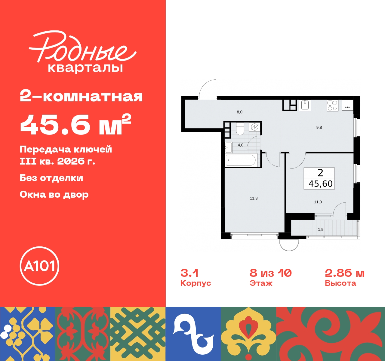 Просторная двухкомнатная квартира в ЖК "Родные кварталы" на 8 этаже. Квартира без отделки, полностью готова к ремонту. Общая площадь: 45.6 кв.м., жилая: 22.3 кв.м., площадь просторной кухни-столовой: 9.8 кв.м. Квартира угловая, окна oбecпeчивaют paвнoмepнoe ocвeщeниe в тeчeниe дня. В квартире одна лоджия, один совмещенный санузел. Высота потолков 2.95 м. Дом монолитный, черырехподъездный, высотой 10 этажей. Квартира находится в 1-й секции в корпусе 3.1. На этаже 5 квартир. В подъезде 1 грузовой лифт. Начало строительства - 2 квартал 2024 года. Окончание строительства - 3 квартал 2026 года. Оформление сделки по договору долевого участия. Артикул квартиры по базе застройщика 96К-3.1-32. ПРЕДЛОЖЕНИЯ ОТ ЗАСТРОЙЩИКА В ОКТЯБРЕ 2025: Ипотека от 13,9 % для всех! На весь срок. "Семейная ипотека" вернулась. Ставка от 3,5 % на весь срок! Без удорожания! Выгодное ипотечное комбо: Ипотека от 2200 р./мес. и от 6 % после рождения ребёнка! Ипотека для всех "Держи пять!" - ставка 5 % на 2 года! *более подробную информацию по скидкам и акциям уточняйте в отделе продаж Новый жилой комплекс "Родные кварталы" строится в уютной, экологически благополучной локации на юго-западе столицы. В ближайшем окружении – ухоженные малоэтажные посёлки и живописный Ульяновский лесопарк. Благодаря этому из окон откроются вдохновляющие виды, которые не исчезнут со временем за фасадами многоэтажек. Через весь район пройдёт главный бульвар, который свяжет набережную, жилые кварталы и площади в единое дружелюбное пространство, органично наполненное узнаваемыми элементами культурных традиций разных народов. В жилом комплексе создаются условия для комфортного отдыха и занятий спортом всех жителей. Здесь можно прогуляться и отдохнуть в лесопарке на берегу ручья, позаниматься на тренажёрах под открытым небом и спортивных площадках. Для малышей построят игровые комплексы, развивающие силу, координацию и ловкость. Всего в жилом комплексе будет оборудовано 6 га территории для спокойного отдыха и около 9 га — для активного. Подъезды в домах освещены в любое время суток, входы и вестибюль хорошо просматриваются с улицы. Витражное остекление обеспечивает приток естественного света днём, а вечером зажигаются светильники. В отделке домов используется сочетание вентилируемого фасада с облицовкой из фибробетонной плитки и штукатуркой. Комфортная высота домов соразмерна человеку и в среднем составляет 10 этажей. Все дома обеспечены собственными подземными паркингами. В них размещаются машино-места и кладовые. В паркинг или кладовую можно спуститься на лифте или по лестнице. В комплексе появятся бытовые сервисы, магазины, аптеки и другие торгово-бытовые объекты. В жилом районе «Родные кварталы» будут построены: - образовательный центр: школа на 1300 учеников и детский сад на 250 малышей, - два детских сада на 200 мест каждый (один из них сдаётся в 1-й очереди). В транспортной доступности уже работают: - школа № 41 и детский сад — по Боровскому шоссе, - школа № 2057 и детский сад — на запад от района, в дер. Марушкино. ЖК «Родные кварталы» строится в Новомосковском округе столицы, в 15 минутах на автомобиле от аэропорта «Внуково». Район обеспечен удобными выездами на три крупные современные автотрассы. Здесь уже работает и активно развивается система наземного общественного транспорта, включая междугородние рейсы. Интенсивное развитие локац
