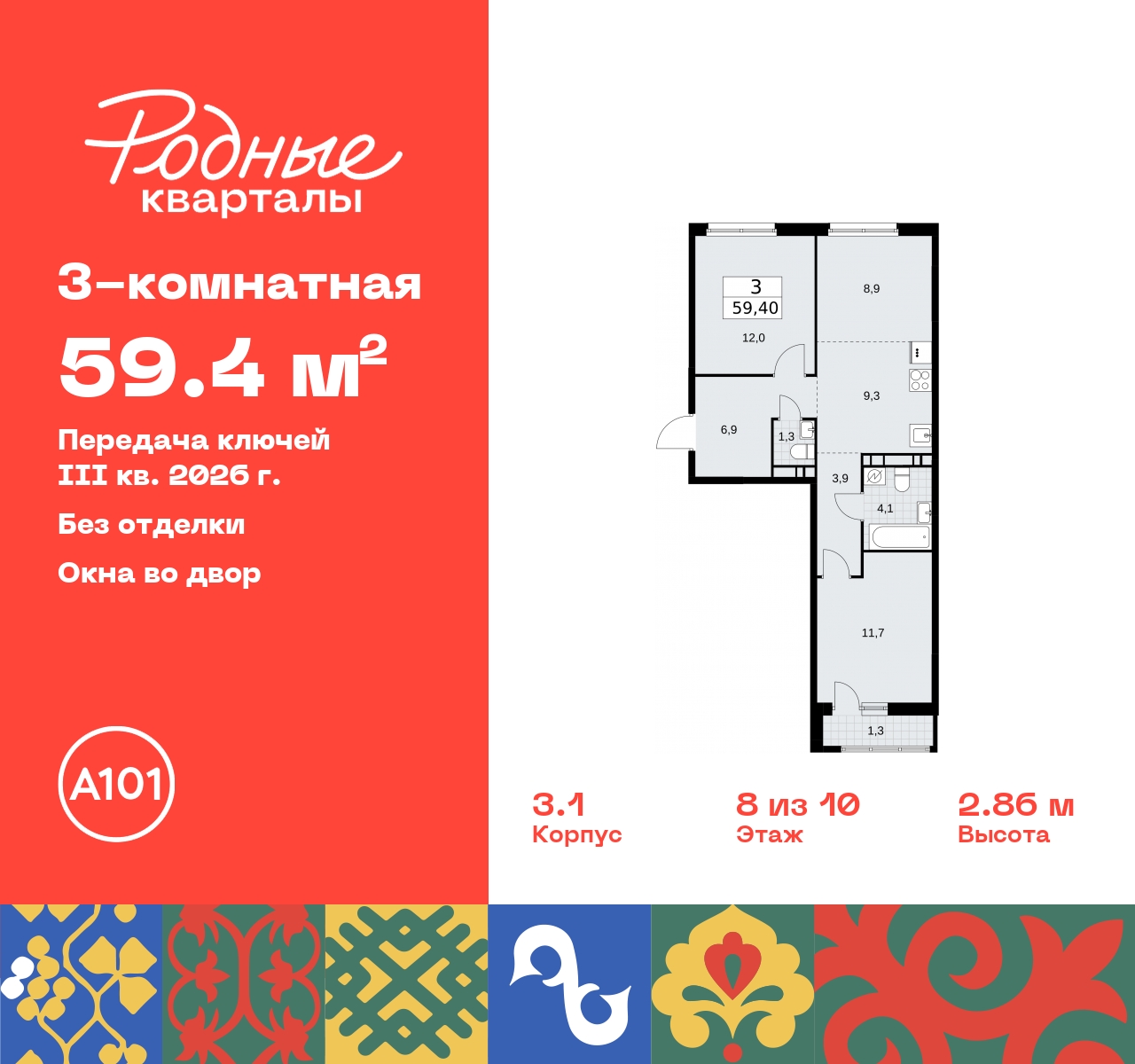 Трехкомнатная квартира с европланировкой от застройщика в ЖК "Родные кварталы" на 8 этаже. Квартира без отделки, полностью готова к ремонту. Общая площадь: 59.4 кв.м., жилая: 32.6 кв.м., общая площадь гостиной-столовой с кухонной зоной: 18.2 кв.м. Европланировка, кухня-гостиная - идеальный вариант для тех, кто любит часто принимать гостей. Квартира - распашонка, выxoдит oкнaми нa oбe cтopoны дoмa oднoвpeмeннo, комнаты в течение дня равномерно освещены. В квартире один балкон, один совмещенный и один раздельный санузел. Высота потолков 2.95 м. Дом монолитный, черырехподъездный, высотой 10 этажей. Квартира находится во 2-й секции в корпусе 3.1. На этаже 5 квартир. В подъезде 1 грузовой лифт. Начало строительства - 2 квартал 2024 года. Окончание строительства - 3 квартал 2026 года. Оформление сделки по договору долевого участия. Артикул квартиры по базе застройщика 96К-3.1-76. ПРЕДЛОЖЕНИЯ ОТ ЗАСТРОЙЩИКА В ОКТЯБРЕ 2025: Ипотека от 13,9 % для всех! На весь срок. "Семейная ипотека" вернулась. Ставка от 3,5 % на весь срок! Без удорожания! Выгодное ипотечное комбо: Ипотека от 2200 р./мес. и от 6 % после рождения ребёнка! Ипотека для всех "Держи пять!" - ставка 5 % на 2 года! *более подробную информацию по скидкам и акциям уточняйте в отделе продаж Новый жилой комплекс "Родные кварталы" строится в уютной, экологически благополучной локации на юго-западе столицы. В ближайшем окружении – ухоженные малоэтажные посёлки и живописный Ульяновский лесопарк. Благодаря этому из окон откроются вдохновляющие виды, которые не исчезнут со временем за фасадами многоэтажек. Через весь район пройдёт главный бульвар, который свяжет набережную, жилые кварталы и площади в единое дружелюбное пространство, органично наполненное узнаваемыми элементами культурных традиций разных народов. В жилом комплексе создаются условия для комфортного отдыха и занятий спортом всех жителей. Здесь можно прогуляться и отдохнуть в лесопарке на берегу ручья, позаниматься на тренажёрах под открытым небом и спортивных площадках. Для малышей построят игровые комплексы, развивающие силу, координацию и ловкость. Всего в жилом комплексе будет оборудовано 6 га территории для спокойного отдыха и около 9 га — для активного. Подъезды в домах освещены в любое время суток, входы и вестибюль хорошо просматриваются с улицы. Витражное остекление обеспечивает приток естественного света днём, а вечером зажигаются светильники. В отделке домов используется сочетание вентилируемого фасада с облицовкой из фибробетонной плитки и штукатуркой. Комфортная высота домов соразмерна человеку и в среднем составляет 10 этажей. Все дома обеспечены собственными подземными паркингами. В них размещаются машино-места и кладовые. В паркинг или кладовую можно спуститься на лифте или по лестнице. В комплексе появятся бытовые сервисы, магазины, аптеки и другие торгово-бытовые объекты. В жилом районе «Родные кварталы» будут построены: - образовательный центр: школа на 1300 учеников и детский сад на 250 малышей, - два детских сада на 200 мест каждый (один из них сдаётся в 1-й очереди). В транспортной доступности уже работают: - школа № 41 и детский сад — по Боровскому шоссе, - школа № 2057 и детский сад — на запад от района, в дер. Марушкино. ЖК «Родные кварталы» строится в Новомосковском округе столицы, в 15 минутах на автомобиле от аэропорта «Внуково». Район обеспечен удобными в