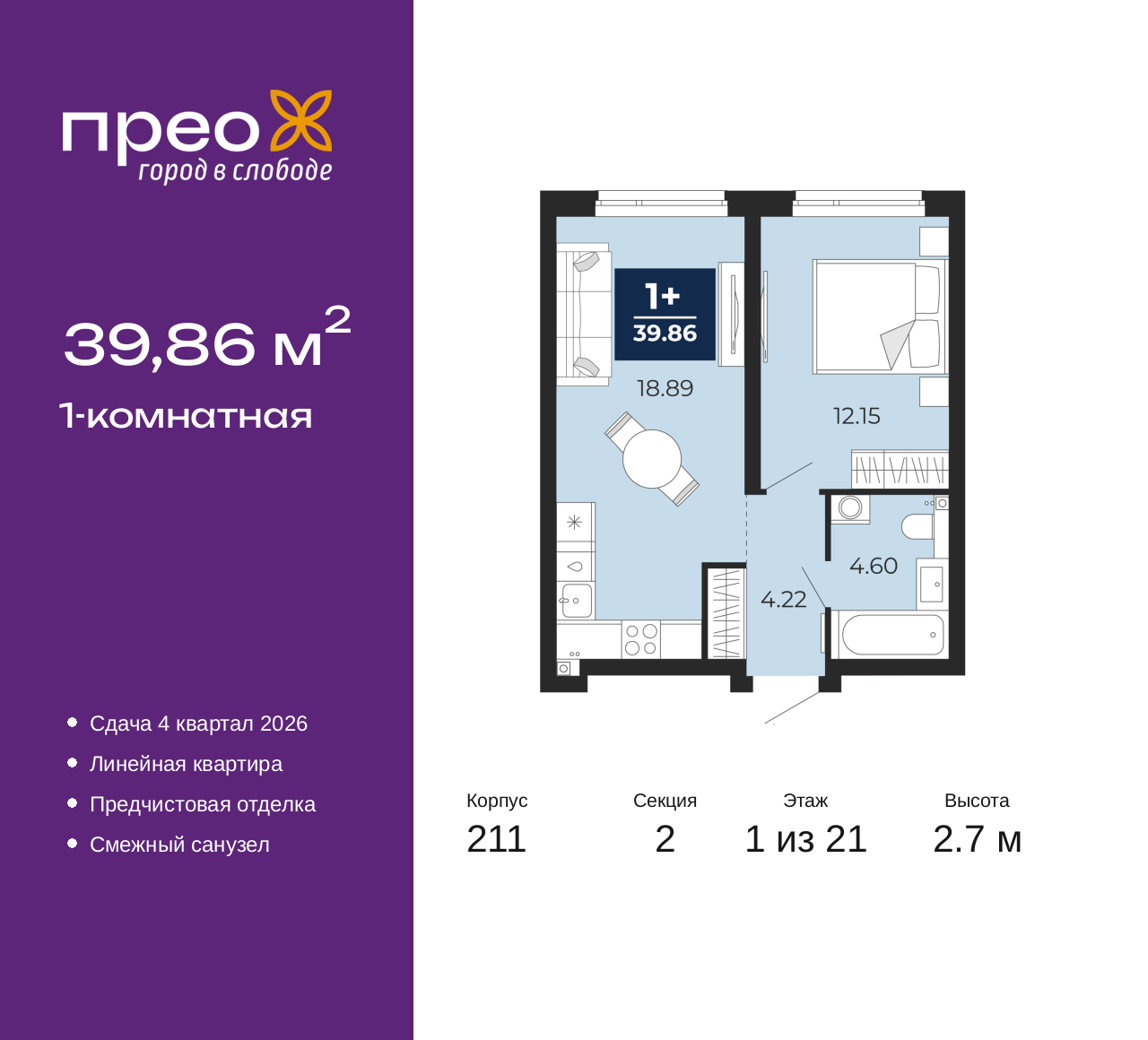 Продается 1-комн. квартира с предчистовой отделкой в ЖК "Прео" на 1 этаже. Общая площадь: 39.86 кв.м., жилая: 12.15 кв.м., площадь просторной кухни-столовой: 18.89 кв.м. Все окна выходят на одну сторону. В квартире один совмещенный санузел. Высота потолков 2.7 м. Дом монолитный, черырехподъездный, переменной этажности, от 14 до 21 этажей. Квартира находится во 2-й секции высотой 21 этаж в корпусе 211. На этаже 10 квартир. В подъезде 1 пассажирский и 1 грузовой лифт. Окончание строительства - 4 квартал 2026 года. Оформление сделки по договору долевого участия. Преображенский — один из самых привлекательных районов для жизни! Это полностью самостоятельный жилой район с точки зрения инфраструктуры. Преображенский находится между Московским и Червишевским трактами в квартале улиц Закалужская — Вьюжная — Александра Протозанова. Не нужно ждать, когда появится инфраструктура — переезжайте на всё готовое. Вблизи расположены действующие школа и детский сад. В этом году откроется еще один сад, а в следующем году — школа. По соседству с Преображенским запланировано строительство городского парка «Комарово» площадью 38 гектар. За 10 минут можно доехать на автомобиле до крупных ТРЦ: «Лента», «Кристалл», «Леруа Мерлен», «Метро» и «Ашан». С 2018 года в районе открыт Соседский центр — пространство, созданное для формирования добрососедской среды, совместного досуга, общения и реализации соседских инициатив. Здесь проходят встречи соседей, а также сами жители района организовывают мероприятия. Организатором такого события может стать любой желающий. В квартирах выполнена качественная предчистовая отделка. Гладкие стены с финишным выравниванием по маякам. Ровный потолок для установки натяжного потолка. Установлены пятикамерные окна с двойным стеклопакетом (3 стекла). Дизайнерские холлы с видеонаблюдением, безбарьерным и прозрачным входом – всегда светло и спокойно. На первом этаже есть просторные колясочные, где все жители могут оставлять свои коляски и велосипеды. В Преображенском есть всё, что нужно для активного отдыха и занятий спортом. Мы сделали большое футбольное поле с безопасным покрытием. Также установили хоккейный корт, который оборудован по всем необходимым стандартам. Во дворах можно делать упражнения на специальных площадках с турниками. Весь район мы обустроили велодорожками, которые связаны в единый маршрут. У нас есть сухие фонтаны, бьющие из земли, деревья, веревки, сетки, скалодром, газон, песок и резинка — осталось просто дать своему ребенку право на свободную игру. По-настоящему хорошие дворы — это те, которые дети предпочитают соцсетям и телевизору. Аккредитация в банках: ПАО «Газпромбанк», ПАО «Банк Уралсиб», ПАО Банк «ВТБ», «Сбербанк России», ОАО «Альфа-Банк» и других. (AQID02427492)