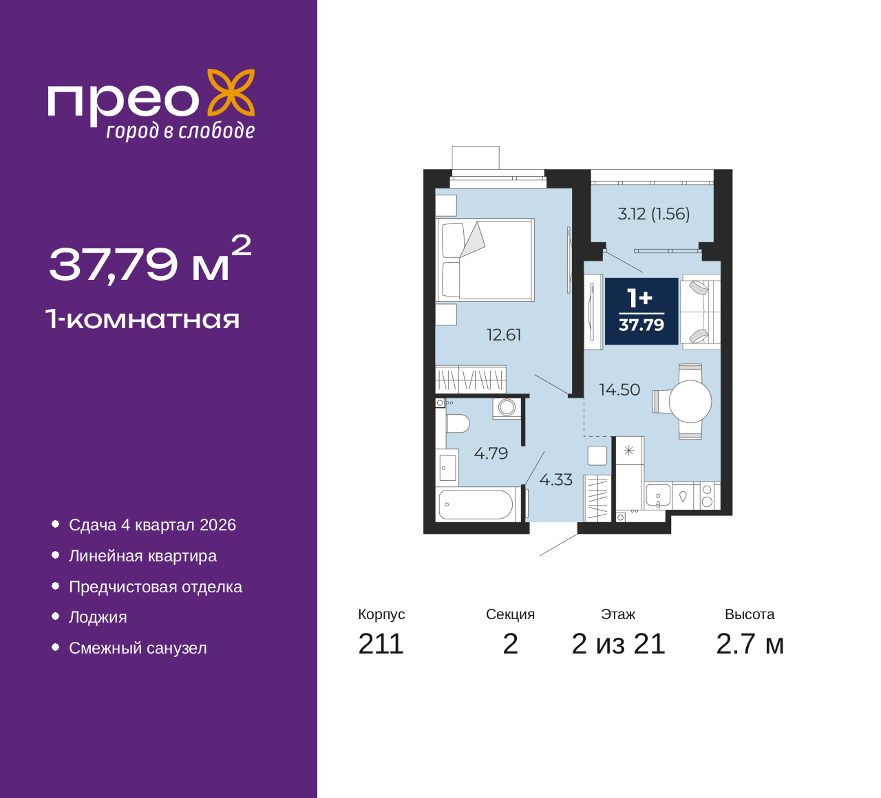 Однокомнатная квартира от застройщика с предчистовой отделкой в ЖК "Прео" на 2 этаже. Общая площадь: 37.79 кв.м., жилая: 12.61 кв.м., площадь просторной кухни-столовой: 14.5 кв.м. Все окна выходят на одну сторону. В квартире одна лоджия, один совмещенный санузел. Высота потолков 2.7 м. Дом монолитный, черырехподъездный, переменной этажности, от 14 до 21 этажей. Квартира находится во 2-й секции высотой 21 этаж в корпусе 211. На этаже 10 квартир. В подъезде 1 пассажирский и 1 грузовой лифт. Окончание строительства - 4 квартал 2026 года. Оформление сделки по договору долевого участия. Преображенский — один из самых привлекательных районов для жизни! Это полностью самостоятельный жилой район с точки зрения инфраструктуры. Преображенский находится между Московским и Червишевским трактами в квартале улиц Закалужская — Вьюжная — Александра Протозанова. Не нужно ждать, когда появится инфраструктура — переезжайте на всё готовое. Вблизи расположены действующие школа и детский сад. В этом году откроется еще один сад, а в следующем году — школа. По соседству с Преображенским запланировано строительство городского парка «Комарово» площадью 38 гектар. За 10 минут можно доехать на автомобиле до крупных ТРЦ: «Лента», «Кристалл», «Леруа Мерлен», «Метро» и «Ашан». С 2018 года в районе открыт Соседский центр — пространство, созданное для формирования добрососедской среды, совместного досуга, общения и реализации соседских инициатив. Здесь проходят встречи соседей, а также сами жители района организовывают мероприятия. Организатором такого события может стать любой желающий. В квартирах выполнена качественная предчистовая отделка. Гладкие стены с финишным выравниванием по маякам. Ровный потолок для установки натяжного потолка. Установлены пятикамерные окна с двойным стеклопакетом (3 стекла). Дизайнерские холлы с видеонаблюдением, безбарьерным и прозрачным входом – всегда светло и спокойно. На первом этаже есть просторные колясочные, где все жители могут оставлять свои коляски и велосипеды. В Преображенском есть всё, что нужно для активного отдыха и занятий спортом. Мы сделали большое футбольное поле с безопасным покрытием. Также установили хоккейный корт, который оборудован по всем необходимым стандартам. Во дворах можно делать упражнения на специальных площадках с турниками. Весь район мы обустроили велодорожками, которые связаны в единый маршрут. У нас есть сухие фонтаны, бьющие из земли, деревья, веревки, сетки, скалодром, газон, песок и резинка — осталось просто дать своему ребенку право на свободную игру. По-настоящему хорошие дворы — это те, которые дети предпочитают соцсетям и телевизору. Аккредитация в банках: «Сбербанк России», ОАО «Альфа-Банк», ПАО «Газпромбанк», ПАО «Банк Уралсиб», ПАО Банк «ВТБ» и других. (AQID02427555)