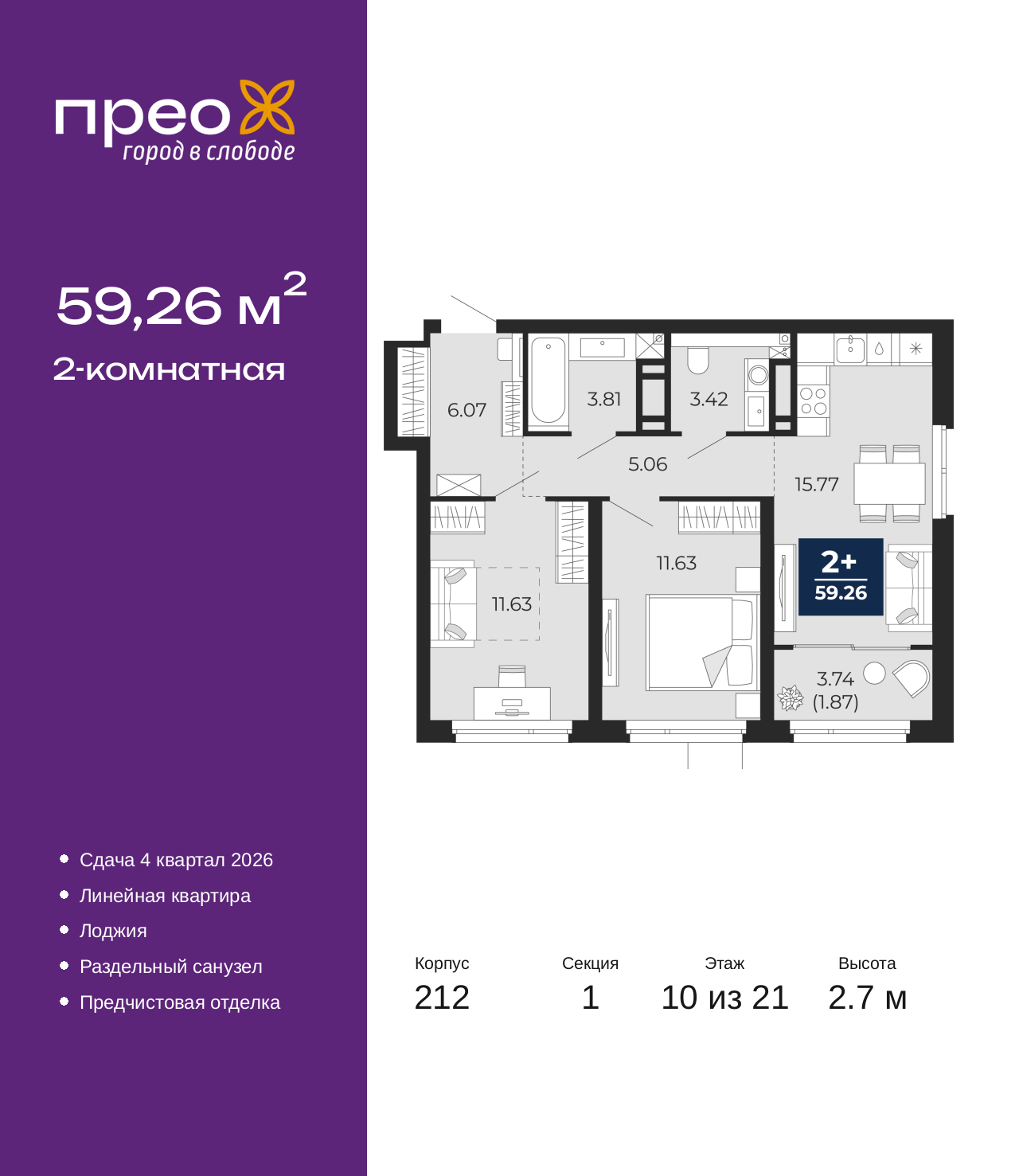 Просторная 2-комн. квартира с предчистовой отделкой в ЖК "Прео" на 10 этаже. Общая площадь: 59.26 кв.м., жилая: 23.26 кв.м., площадь просторной кухни-столовой: 15.77 кв.м. Комнаты изолированные, все окна выходят на одну сторону. В квартире одна лоджия, один раздельный санузел. Высота потолков 2.7 м. Квартира находится в корпусе 212. Дом монолитный, одноподъездный, высотой 21 этаж. На этаже 8 квартир. В подъезде 2 пассажирских и 1 грузовой лифт. Окончание строительства - 4 квартал 2026 года. Оформление сделки по договору долевого участия. Преображенский — один из самых привлекательных районов для жизни! Это полностью самостоятельный жилой район с точки зрения инфраструктуры. Преображенский находится между Московским и Червишевским трактами в квартале улиц Закалужская — Вьюжная — Александра Протозанова. Не нужно ждать, когда появится инфраструктура — переезжайте на всё готовое. Вблизи расположены действующие школа и детский сад. В этом году откроется еще один сад, а в следующем году — школа. По соседству с Преображенским запланировано строительство городского парка «Комарово» площадью 38 гектар. За 10 минут можно доехать на автомобиле до крупных ТРЦ: «Лента», «Кристалл», «Леруа Мерлен», «Метро» и «Ашан». С 2018 года в районе открыт Соседский центр — пространство, созданное для формирования добрососедской среды, совместного досуга, общения и реализации соседских инициатив. Здесь проходят встречи соседей, а также сами жители района организовывают мероприятия. Организатором такого события может стать любой желающий. В квартирах выполнена качественная предчистовая отделка. Гладкие стены с финишным выравниванием по маякам. Ровный потолок для установки натяжного потолка. Установлены пятикамерные окна с двойным стеклопакетом (3 стекла). Дизайнерские холлы с видеонаблюдением, безбарьерным и прозрачным входом – всегда светло и спокойно. На первом этаже есть просторные колясочные, где все жители могут оставлять свои коляски и велосипеды. В Преображенском есть всё, что нужно для активного отдыха и занятий спортом. Мы сделали большое футбольное поле с безопасным покрытием. Также установили хоккейный корт, который оборудован по всем необходимым стандартам. Во дворах можно делать упражнения на специальных площадках с турниками. Весь район мы обустроили велодорожками, которые связаны в единый маршрут. У нас есть сухие фонтаны, бьющие из земли, деревья, веревки, сетки, скалодром, газон, песок и резинка — осталось просто дать своему ребенку право на свободную игру. По-настоящему хорошие дворы — это те, которые дети предпочитают соцсетям и телевизору. Аккредитация в банках: «Сбербанк России», ПАО «Газпромбанк», ОАО «Альфа-Банк», ПАО Банк «ВТБ», ПАО «Банк Уралсиб» и других. (AQID02427634)