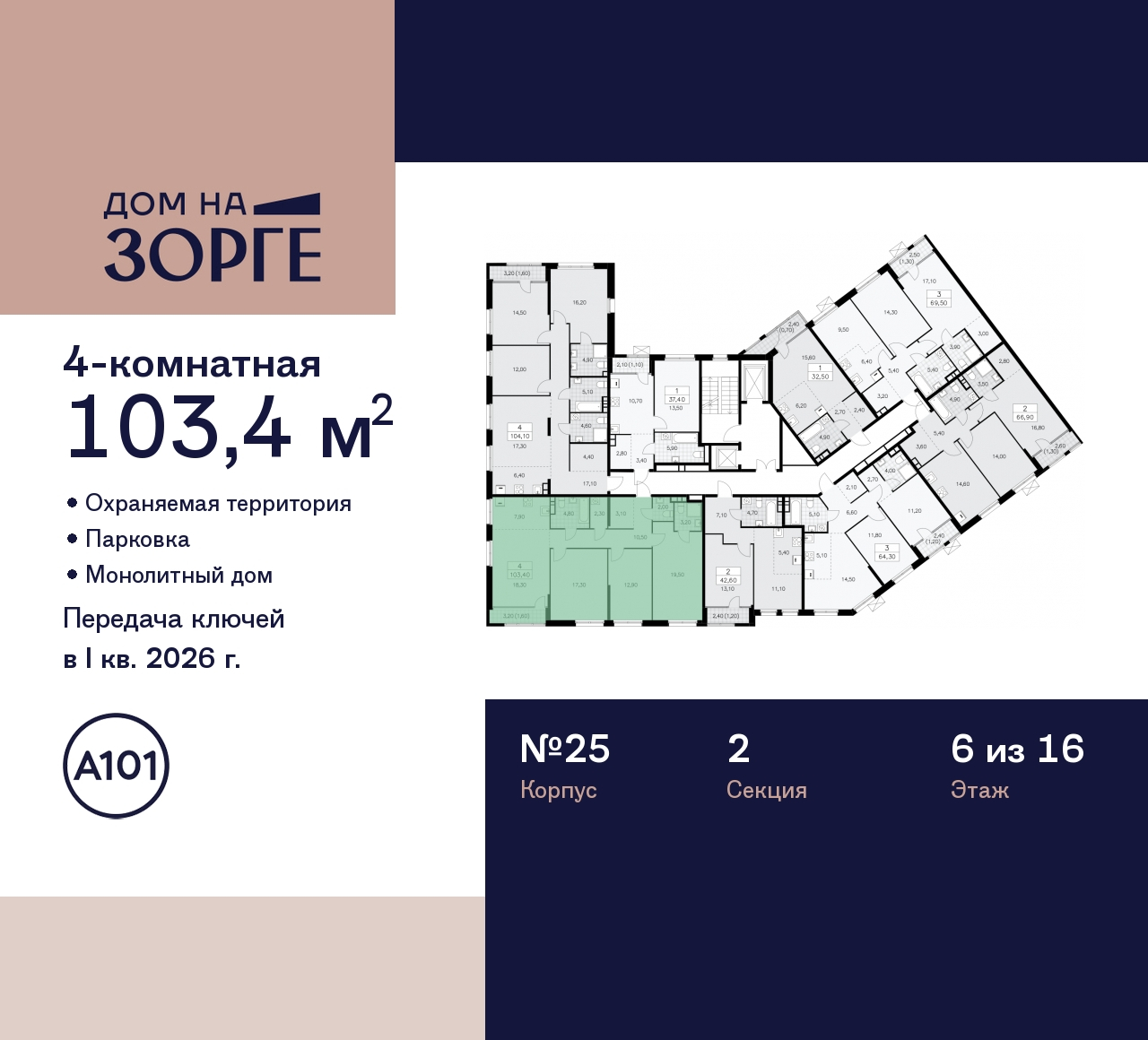 Четырехкомнатная квартира с европланировкой и предчистовой отделкой в ЖК "Дом на Зорге" на 6 этаже. Общая площадь: 103.4 кв.м., жилая: 68 кв.м., общая площадь гостиной-столовой с кухонной зоной: 26.2 кв.м. Европланировка, за счет большой площади кухни-гостиной квартира выглядит просторной и очень удобна для жизни. Угловая квартира, идеально подойдет любителям тишины и панорамных видов. В квартире одна лоджия, два совмещенных и один раздельный санузел. Высота потолков 3.1 м. Имеется ниша под гардероб. Дом монолитный, двухподъездный, высотой 16 этажей. Квартира находится во 2-й секции в корпусе 25. На этаже 8 квартир. В подъезде 1 пассажирский и 1 грузовой лифт. Начало строительства - 2 квартал 2023 года. Окончание строительства - 1 квартал 2026 года. Оформление сделки по договору долевого участия. Артикул квартиры по базе застройщика 25К-25-229. В шаговой доступности от дома расположены станции метро (расстояние по прямой): «Зорге» (500 м), «Октябрьское поле» (800 м), «Панфиловская» (900 м), «Сокол» (1.6 км), «Хорошево» (1.6 км). ПРЕДЛОЖЕНИЯ ОТ ЗАСТРОЙЩИКА В ОКТЯБРЕ 2025: Ипотека от 13,9 % для всех! На весь срок. "Семейная ипотека" вернулась. Ставка от 3,5 % на весь срок! Без удорожания! Выгодное ипотечное комбо: Ипотека от 2200 р./мес. и от 6 % после рождения ребёнка! Ипотека для всех "Держи пять!" - ставка 5 % на 2 года! *более подробную информацию по скидкам и акциям уточняйте в отделе продаж "Дом на Зорге"» бизнес-класса возводится в престижном районе «Сокол» с исторической «сталинской» застройкой и статусными жилыми комплексами на границе с Хорошёвским районом Северо-Западного АО. До действующей станции метро (и МЦК) «Зорге» всего 350 метров. «Дом на Зорге» отличается элегантным и статусным внешним видом – идеально соответствует «дресс-коду» исторического окружения и в тоже время обращает на себя внимание. Вентилируемые фасады облицованы фиброцементными и керамогранитными панелями, которые повторяют фактуру натурального камня и бетона. Кондиционеры скроют корзины и стильные блоки, расположенные в декоративных элементах фасада. Мягкая архитектурно-художественная подсветка подчеркнёт благородный экстерьер дома. Сформированная инфраструктура района предоставит жителям богатый выбор мест для отдыха, шопинга и занятий спортом. На первом этаже «Дома на Зорге» откроются уютные магазины, атмосферные кафе и салоны красоты с отличным сервисом. Здесь предусмотрено всё для удобства, позитивного настроения и безопасности жителей. В закрытый двор не войдут посторонние. Автомобили останутся за периметром или в подземном паркинге. Две 16-этажных секции дома соединит лобби с дизайнерской отделкой. Оно станет стильным общественным пространством и главным входом для жителей, также ведущим в скрытый от посторонних глаз приватный внутренний двор. Всего в локации – более четырёх десятков разнообразных учебных учреждений для детей, включая легендарную «Курчатовскую школу». В шаговой доступности находятся корпуса школы № 1251 имени генерала Шарля де Голля – с дошкольным отделением. На территории дома будут благоустроены общий и приватный (доступный только жителям) дворы. Дизайн каждой функциональной зоны уникален, а вместе они подчёркивают благородный архитектурный стиль здания. В основе цветовых решений – «отражение» фасадов, мягкие природные оттенки. (AQID02221185)