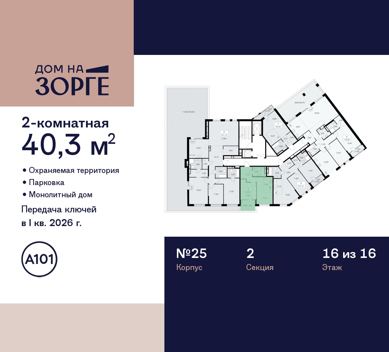 Торопитесь забронировать по акционной цене! Период акции ограничен! Стоимость квартиры указана со скидкой, ваша экономия составит 5,232,552 RUB. По всем вопросам звоните в офис продаж, наши менеджеры вам все расскажут! 2-комн. квартира с европланировкой и предчистовой отделкой в ЖК "Дом на Зорге" на 16 этаже. Общая площадь: 40.3 кв.м., жилая: 22 кв.м., суммарная площадь гостиной-столовой с кухонной зоной: 16.5 кв.м. Европейская планировка, кухня и гостиная объединены в одно просторное помещение. Комнаты изолированные, все окна выходят на одну сторону. В квартире одна лоджия, один совмещенный санузел. Терраса размером 4 кв.м. представляет собой роскошную зону отдыха, где вы на свой вкус можете создать атмосферу комфорта и уюта. Высота потолков 3.1 м. Дом монолитный, двухподъездный, высотой 16 этажей. Квартира находится во 2-й секции в корпусе 25. На этаже 8 квартир. В подъезде 1 пассажирский и 1 грузовой лифт. Начало строительства - 2 квартал 2023 года. Окончание строительства - 1 квартал 2026 года. Оформление сделки по договору долевого участия. Артикул квартиры по базе застройщика 25К-25-307. В шаговой доступности от дома расположены станции метро (расстояние по прямой): «Зорге» (500 м), «Октябрьское поле» (800 м), «Панфиловская» (900 м), «Сокол» (1.6 км), «Хорошево» (1.6 км). ПРЕДЛОЖЕНИЯ ОТ ЗАСТРОЙЩИКА В ОКТЯБРЕ 2025: Ипотека от 13,9 % для всех! На весь срок. "Семейная ипотека" вернулась. Ставка от 3,5 % на весь срок! Без удорожания! Выгодное ипотечное комбо: Ипотека от 2200 р./мес. и от 6 % после рождения ребёнка! Ипотека для всех "Держи пять!" - ставка 5 % на 2 года! *более подробную информацию по скидкам и акциям уточняйте в отделе продаж "Дом на Зорге"» бизнес-класса возводится в престижном районе «Сокол» с исторической «сталинской» застройкой и статусными жилыми комплексами на границе с Хорошёвским районом Северо-Западного АО. До действующей станции метро (и МЦК) «Зорге» всего 350 метров. «Дом на Зорге» отличается элегантным и статусным внешним видом – идеально соответствует «дресс-коду» исторического окружения и в тоже время обращает на себя внимание. Вентилируемые фасады облицованы фиброцементными и керамогранитными панелями, которые повторяют фактуру натурального камня и бетона. Кондиционеры скроют корзины и стильные блоки, расположенные в декоративных элементах фасада. Мягкая архитектурно-художественная подсветка подчеркнёт благородный экстерьер дома. Сформированная инфраструктура района предоставит жителям богатый выбор мест для отдыха, шопинга и занятий спортом. На первом этаже «Дома на Зорге» откроются уютные магазины, атмосферные кафе и салоны красоты с отличным сервисом. Здесь предусмотрено всё для удобства, позитивного настроения и безопасности жителей. В закрытый двор не войдут посторонние. Автомобили останутся за периметром или в подземном паркинге. Две 16-этажных секции дома соединит лобби с дизайнерской отделкой. Оно станет стильным общественным пространством и главным входом для жителей, также ведущим в скрытый от посторонних глаз приватный внутренний двор. Всего в локации – более четырёх десятков разнообразных учебных учреждений для детей, включая легендарную «Курчатовскую школу». В шаговой доступности находятся корпуса школы № 1251 имени генерала Шарля де Голля – с дошкольным отделением. На территории дома будут благоустроены общий и приватный (доступный т