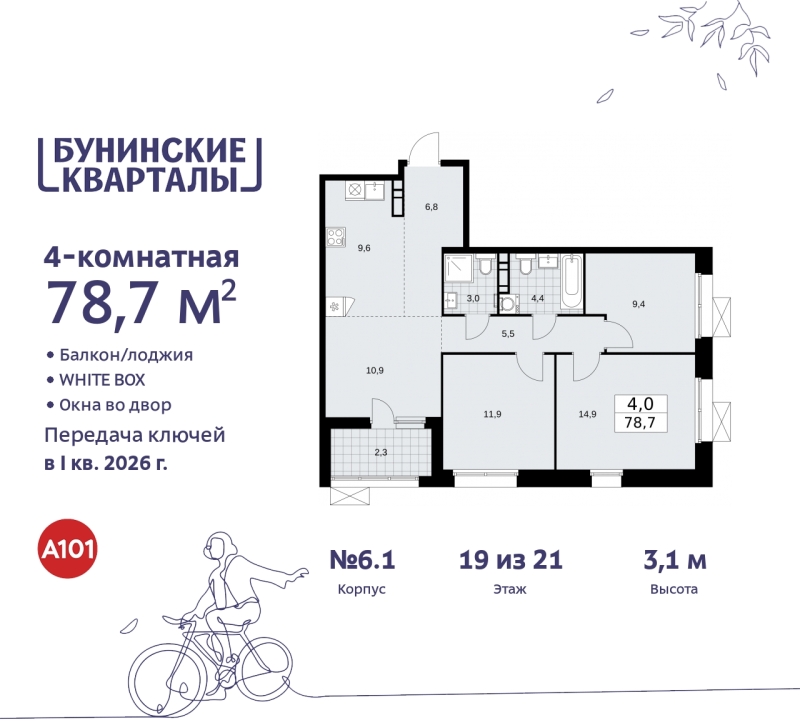 Продается 4-комн. квартира бизнес-класса с европланировкой и предчистовой отделкой в ЖК "Бунинские кварталы" на 19 этаже. Общая площадь: 78.7 кв.м., жилая: 47 кв.м., общая площадь гостиной-столовой с кухонной зоной: 20.6 кв.м. Европейская планировка, площадь комнат позволяет разместить в них все необходимое, а в просторной кухне-гостиной удобно как готовить, так и отдыхать. Квартира угловая, очень светлая, естественная вентиляция при открытии окон. В квартире одна лоджия, два совмещенных санузла. Высота потолков 3.1 м. В квартире будет выполнена отделка WHITE BOX - это квартира с ровными белыми стенами. На полу стяжка с шумоизоляцией, стены выровнены и отшпатлеваны, потолок покрашен, выполнены выводы под освещение, проложены все электрокабели и провода с подразетниками и выключателями, готовы выводы под установку сантехники, сделана гидроизоляция. Покупка квартиры с вариантом отделки white box позволяет избежать громкого и грязного этапа ремонта. Кроме того, можно включить его стоимость в ипотеку. Квартира находится в корпусе 6.1. Дом монолитный, одноподъездный, высотой 21 этаж. На этаже 10 квартир. В подъезде 1 пассажирский и 2 грузовых лифта. Начало строительства - 3 квартал 2023 года. Окончание строительства - 1 квартал 2026 года. Оформление сделки по договору долевого участия. Артикул квартиры по базе застройщика 14К-6.1-164. В шаговой доступности от жилого комплекса расположена станция метро (расстояние по прямой) «Потапово» (1.6 км), также недалеко от этого корпуса находятся станции метро: «Ольховая», «Бунинская аллея», «Улица Горчакова», «Коммунарка». ПРЕДЛОЖЕНИЯ ОТ ЗАСТРОЙЩИКА В ОКТЯБРЕ 2025: Ипотека от 13,9 % для всех! На весь срок. "Семейная ипотека" вернулась. Ставка от 3,5 % на весь срок! Без удорожания! Выгодное ипотечное комбо: Ипотека от 2200 р./мес. и от 6 % после рождения ребёнка! Ипотека для всех "Держи пять!" - ставка 5 % на 2 года! *более подробную информацию по скидкам и акциям уточняйте в отделе продаж. Жилой район «Бунинские кварталы» строится в Новомосковском округе столицы. До станции «Потапово» Сокольнической линии метро – 1700 метров. Вдоль северной границы района проходит проспект Куприна. Рядом проектируется автодорога МКАД – Коммунарка – Остафьево. В шаговой доступности – остановки общественного транспорта. Жители «Бунинских кварталов» будут с комфортом пользоваться полноценной и разнообразной инфраструктурой своего района и соседних районов столицы. На расстоянии 5-10 минут пешей прогулки действуют и открываются новые торговые, социальные, спортивно-развлекательные объекты. В 5 минутах езды на транспорте – гипермаркет «Глобус». Новый район из монолитных домов с безопасными закрытыми дворами и подземными паркингами строится на юго-западе Москвы, в живописном природном окружении. Рядом – крупные автомагистрали и станции метро. Но чтобы получить захватывающие впечатления и интересно провести время, жителям не нужно будет уезжать далеко от дома – достаточно пройти несколько шагов до центральной площади или благоустроенного лесопарка в южной части района. В жилом комплексе будут созданы все условия для общения и активного времяпрепровождения людей всех возрастов и разнообразных увлечений. Его наполнит особенная дружелюбная атмосфера, в которой легко завязываются контакты, взрослые и дети делятся увлечениями, демонстрируют свои таланты. Пр
