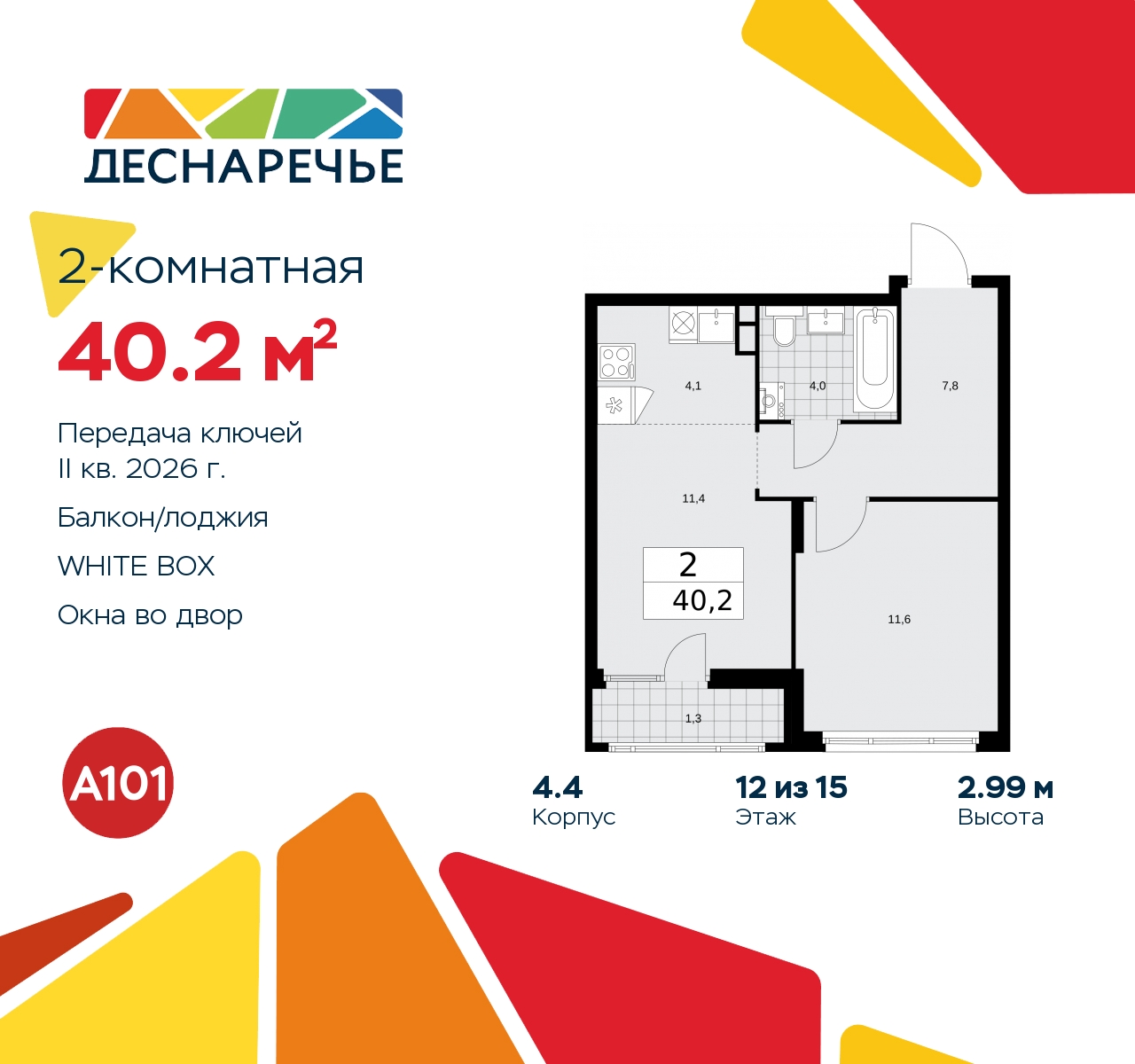 Продается двухкомнатная квартира с европланировкой и отделкой в ЖК "Деснаречье" на 12 этаже. Общая площадь: 40.2 кв.м., жилая: 23 кв.м., общая площадь гостиной-столовой с кухонной зоной: 15.5 кв.м. Европейская планировка, в просторной кухне-гостиной удобно как готовить, так и отдыхать. Комнаты изолированные, все окна выходят на одну сторону. В квартире одна лоджия, один совмещенный санузел. Высота потолков 2.99 м. Эта квартира будет сдана с дизайнеркой отделкой "под ключ". Специально для вас мы разработали несколько решений дизайнерской отделки. В отделке используются только современный высококлассные материалы, на все работы предоставляется гарантия. В таком случае вы оплачиваете отделку в сегодняшних ценах, а эту стоимость вы можете разнести в ипотечных платежах. Дом монолитный, черырехподъездный, высотой 15 этажей. Квартира находится в 4-й секции в корпусе 4.4. На этаже 6 квартир. В подъезде 1 пассажирский и 1 грузовой лифт. Начало строительства - 3 квартал 2023 года. Окончание строительства - 2 квартал 2026 года. Оформление сделки по договору долевого участия. Артикул квартиры по базе застройщика 88К-4.4-1025. ПРЕДЛОЖЕНИЯ ОТ ЗАСТРОЙЩИКА В ОКТЯБРЕ 2025: Ипотека от 13,9 % для всех! На весь срок. "Семейная ипотека" вернулась. Ставка от 3,5 % на весь срок! Без удорожания! Выгодное ипотечное комбо: Ипотека от 2200 р./мес. и от 6 % после рождения ребёнка! Ипотека для всех "Держи пять!" - ставка 5 % на 2 года! *более подробную информацию по скидкам и акциям уточняйте в отделе продаж Масштабный проект "Деснаречье" на юго-западе Москвы, который включает три новых района («квартала»), объединённые общей идеей – воплотить в реальность мечты современных жителей столицы об интересном, комфортном и разноплановом городском пространстве в окружении рек и лесов, словно сошедших с полотен русских живописцев: - «Берег» оценят все, кому близка водная стихия: плеск волн, солнечные блики и прогулки вдоль тихого течения речи. - «Лес» утопает в зелени парков и лесов. Здесь соблюдён идеальный баланс загородного спокойствия и столичного комфорта. - «Парк», самый энергичный и яркий, отличается высокой концентрацией пространств для спорта и творчества. Жилой комплекс "Деснаречье" расположится в 12 км от МКАД по современному Калужскому шоссе. Внешний облик зданий соответствует современному стилю и стандартам, характерным и для других популярных проектов ГК «А101»: сочетание контрастных тонов, большое количество остекления, в котором отражается небо, гармония с природным окружением. Весь город - в вашем районе. Находиться на территории «15-минутного города» значит иметь всё необходимое для полноценной жизни в шаговой доступности. Маршруты в районе «Деснаречье» выстроены так, чтобы добраться до магазинов, парков, школ, салонов услуг и других объектов можно было всего за несколько минут пешком или на велосипеде. Двор закрытый от машин – это тишина, комфорт и безопасность, поэтому все машино-места (включая «семейные» и увеличенные, с возможностью установки роллетных шкафов) находятся в подземном паркинге. В паркинги можно спуститься на лифте из любого подъезда или по лестнице. Рядом с «Деснаречьем» в 2027 году планируется открытие станции метро «Десна», до которой будет удобно добраться пешком или на велосипеде. Дорога на автомобиле до перехватывающих парковок станций «Ольховая» и «Прокшино» займёт 