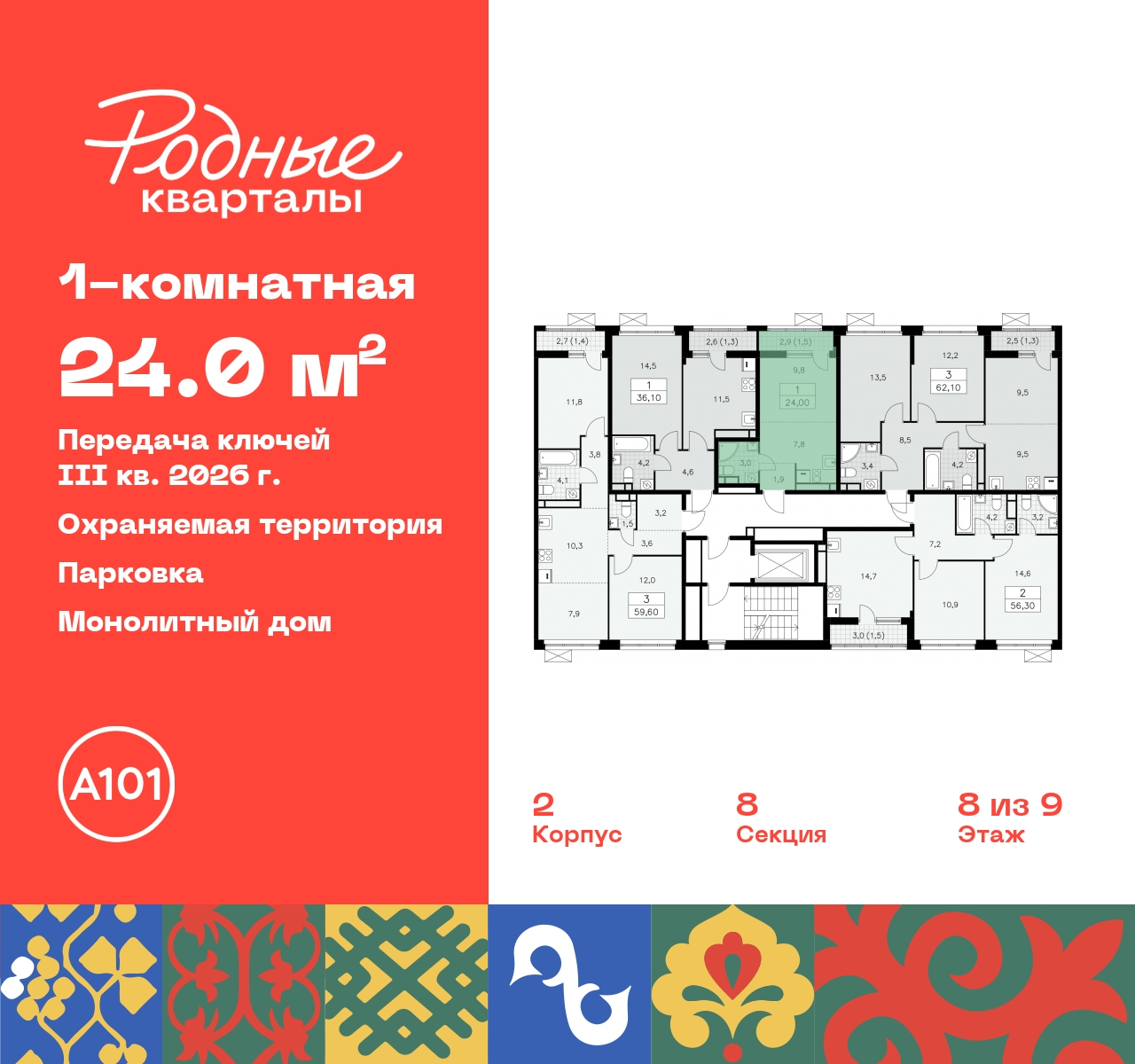 Однокомнатная квартира-студия в ЖК "Родные кварталы" на 8 этаже. Квартира без отделки, полностью готова к ремонту. Общая площадь: 24 кв.м., площадь гостиной 17.6 кв.м., из которых 7.8 кв.м. выделено под кухонную зону. Все окна выходят на одну сторону. В квартире один балкон, один совмещенный санузел. Высота потолков 2.9 м. Дом монолитный, многоподъездный, высотой 9 этажей. Квартира находится в 8-й секции в корпусе 2. На этаже 5 квартир. В подъезде 1 грузовой лифт. Начало строительства - 4 квартал 2023 года. Окончание строительства - 3 квартал 2026 года. Оформление сделки по договору долевого участия. Артикул квартиры по базе застройщика 96К-2-369. ПРЕДЛОЖЕНИЯ ОТ ЗАСТРОЙЩИКА В ОКТЯБРЕ 2025: Ипотека от 13,9 % для всех! На весь срок. "Семейная ипотека" вернулась. Ставка от 3,5 % на весь срок! Без удорожания! Выгодное ипотечное комбо: Ипотека от 2200 р./мес. и от 6 % после рождения ребёнка! Ипотека для всех "Держи пять!" - ставка 5 % на 2 года! *более подробную информацию по скидкам и акциям уточняйте в отделе продаж Новый жилой комплекс "Родные кварталы" строится в уютной, экологически благополучной локации на юго-западе столицы. В ближайшем окружении – ухоженные малоэтажные посёлки и живописный Ульяновский лесопарк. Благодаря этому из окон откроются вдохновляющие виды, которые не исчезнут со временем за фасадами многоэтажек. Через весь район пройдёт главный бульвар, который свяжет набережную, жилые кварталы и площади в единое дружелюбное пространство, органично наполненное узнаваемыми элементами культурных традиций разных народов. В жилом комплексе создаются условия для комфортного отдыха и занятий спортом всех жителей. Здесь можно прогуляться и отдохнуть в лесопарке на берегу ручья, позаниматься на тренажёрах под открытым небом и спортивных площадках. Для малышей построят игровые комплексы, развивающие силу, координацию и ловкость. Всего в жилом комплексе будет оборудовано 6 га территории для спокойного отдыха и около 9 га — для активного. Подъезды в домах освещены в любое время суток, входы и вестибюль хорошо просматриваются с улицы. Витражное остекление обеспечивает приток естественного света днём, а вечером зажигаются светильники. В отделке домов используется сочетание вентилируемого фасада с облицовкой из фибробетонной плитки и штукатуркой. Комфортная высота домов соразмерна человеку и в среднем составляет 10 этажей. Все дома обеспечены собственными подземными паркингами. В них размещаются машино-места и кладовые. В паркинг или кладовую можно спуститься на лифте или по лестнице. В комплексе появятся бытовые сервисы, магазины, аптеки и другие торгово-бытовые объекты. В жилом районе «Родные кварталы» будут построены: - образовательный центр: школа на 1300 учеников и детский сад на 250 малышей, - два детских сада на 200 мест каждый (один из них сдаётся в 1-й очереди). В транспортной доступности уже работают: - школа № 41 и детский сад — по Боровскому шоссе, - школа № 2057 и детский сад — на запад от района, в дер. Марушкино. ЖК «Родные кварталы» строится в Новомосковском округе столицы, в 15 минутах на автомобиле от аэропорта «Внуково». Район обеспечен удобными выездами на три крупные современные автотрассы. Здесь уже работает и активно развивается система наземного общественного транспорта, включая междугородние рейсы. Интенсивное развитие локации обеспечивают две дейст