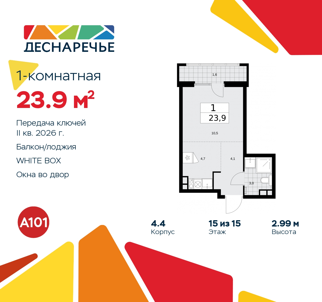 Просторная 1-комн. квартира-студия с предчистовой отделкой в ЖК "Деснаречье" на 15 этаже. Общая площадь: 23.9 кв.м., площадь гостиной 15.2 кв.м., из которых 4.7 кв.м. выделено под кухонную зону. Все окна выходят на одну сторону. В квартире один балкон, один совмещенный санузел. Высота потолков 2.99 м. Эта квартира будет сдана с предчистовой отделкой white box – это квартира с ровными белыми стенами. Такая отделка позволяет сразу приступить к чистовой отделке: выбрать цвета и материалы для стен и полов, купить и расставить мебель и оборудование, развесить светильники и подобрать декор. При желании вы можете дозаказать дизайнерскую отделку от застройщика, на ваш выбор представлено несколько вариантов стилистических решений. Дом монолитный, черырехподъездный, высотой 15 этажей. Квартира находится во 2-й секции в корпусе 4.4. На этаже 6 квартир. В подъезде 1 пассажирский и 1 грузовой лифт. Начало строительства - 3 квартал 2023 года. Окончание строительства - 2 квартал 2026 года. Оформление сделки по договору долевого участия. Артикул квартиры по базе застройщика 88К-4.4-887. ПРЕДЛОЖЕНИЯ ОТ ЗАСТРОЙЩИКА В ОКТЯБРЕ 2025: Ипотека от 13,9 % для всех! На весь срок. "Семейная ипотека" вернулась. Ставка от 3,5 % на весь срок! Без удорожания! Выгодное ипотечное комбо: Ипотека от 2200 р./мес. и от 6 % после рождения ребёнка! Ипотека для всех "Держи пять!" - ставка 5 % на 2 года! *более подробную информацию по скидкам и акциям уточняйте в отделе продаж Масштабный проект "Деснаречье" на юго-западе Москвы, который включает три новых района («квартала»), объединённые общей идеей – воплотить в реальность мечты современных жителей столицы об интересном, комфортном и разноплановом городском пространстве в окружении рек и лесов, словно сошедших с полотен русских живописцев: - «Берег» оценят все, кому близка водная стихия: плеск волн, солнечные блики и прогулки вдоль тихого течения речи. - «Лес» утопает в зелени парков и лесов. Здесь соблюдён идеальный баланс загородного спокойствия и столичного комфорта. - «Парк», самый энергичный и яркий, отличается высокой концентрацией пространств для спорта и творчества. Жилой комплекс "Деснаречье" расположится в 12 км от МКАД по современному Калужскому шоссе. Внешний облик зданий соответствует современному стилю и стандартам, характерным и для других популярных проектов ГК «А101»: сочетание контрастных тонов, большое количество остекления, в котором отражается небо, гармония с природным окружением. Весь город - в вашем районе. Находиться на территории «15-минутного города» значит иметь всё необходимое для полноценной жизни в шаговой доступности. Маршруты в районе «Деснаречье» выстроены так, чтобы добраться до магазинов, парков, школ, салонов услуг и других объектов можно было всего за несколько минут пешком или на велосипеде. Двор закрытый от машин – это тишина, комфорт и безопасность, поэтому все машино-места (включая «семейные» и увеличенные, с возможностью установки роллетных шкафов) находятся в подземном паркинге. В паркинги можно спуститься на лифте из любого подъезда или по лестнице. Рядом с «Деснаречьем» в 2027 году планируется открытие станции метро «Десна», до которой будет удобно добраться пешком или на велосипеде. Дорога на автомобиле до перехватывающих парковок станций «Ольховая» и «Прокшино» займёт около 10 минут. В процессе реализации проекта буду